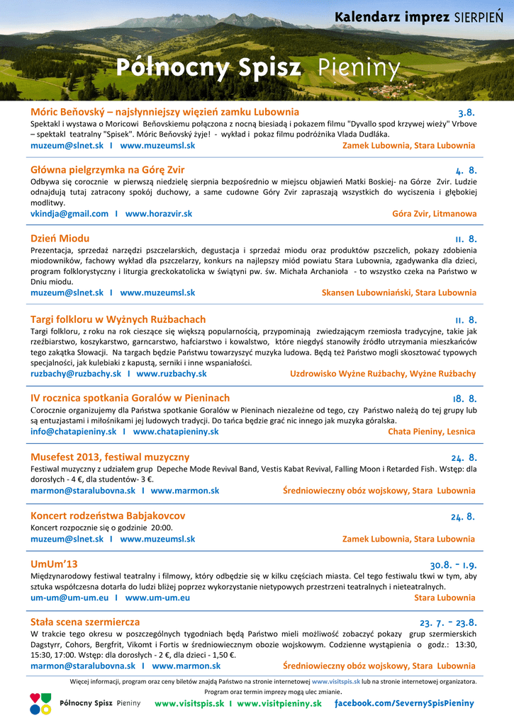 Kalendarz imprez Móric Beňovský – najsłynniejszy więzień zamku Lubownia Spektakl i wystawa o Moricowi Beňovskiemu połączona z nocną biesiadą i pokazem filmu "Dyvallo spod krzywej wieży" Vrbove – spektakl teatralny "Spisek". Móric Beňovský żyje! - wykład i pokaz filmu podróżnika Vlada Dudláka. [email protected] I www.muzeumsl.sk Zamek Lubownia, Stara Lubownia Główna pielgrzymka na Górę Zvir Odbywa się corocznie w pierwszą niedzielę sierpnia bezpośrednio w miejscu objawień Matki Boskiej- na Górze Zvir. Ludzie odnajdują tutaj zatracony spokój duchowy, a same cudowne Góry Zvir zapraszają wszystkich do wyciszenia i głębokiej modlitwy. [email protected] I www.horazvir.sk Góra Zvir, Litmanowa Dzień Miodu Prezentacja, sprzedaż narzędzi pszczelarskich, degustacja i sprzedaż miodu oraz produktów pszczelich, pokazy zdobienia miodowników, fachowy wykład dla pszczelarzy, konkurs na najlepszy miód powiatu Stara Lubownia, zgadywanka dla dzieci, program folklorystyczny i liturgia greckokatolicka w świątyni pw. św. Michała Archanioła - to wszystko czeka na Państwo w Dniu miodu. [email protected] I www.muzeumsl.sk Skansen Lubowniański, Stara Lubownia Targi folkloru w Wyżnych Rużbachach Targi folkloru, z roku na rok cieszące się większą popularnością, przypominają zwiedzającym rzemiosła tradycyjne, takie jak rzeźbiarstwo, koszykarstwo, garncarstwo, hafciarstwo i kowalstwo, które niegdyś stanowiły źródło utrzymania mieszkańców tego zakątka Słowacji. Na targach będzie Państwu towarzyszyć muzyka ludowa. Będą też Państwo mogli skosztować typowych specjalności, jak kulebiaki z kapustą, serniki i inne wspaniałości. [email protected] I www.ruzbachy.sk Uzdrowisko Wyżne Rużbachy, Wyżne Rużbachy IV rocznica spotkania Goralów w Pieninach Corocznie organizujemy dla Państwa spotkanie Goralów w Pieninach niezależne od tego, czy Państwo należą do tej grupy lub są entuzjastami i miłośnikami jej ludowych tradycji. Do tańca będzie grać nic innego jak muzyka góralska. [email protected] I www.chatapieniny.sk Chata Pieniny, Lesnica Musefest 2013, festiwal muzyczny Festiwal muzyczny z udziałem grup Depeche Mode Revival Band, Vestis Kabat Revival, Falling Moon i Retarded Fish. Wstęp: dla dorosłych - 4 €, dla studentów- 3 €. [email protected] I www.marmon.sk Średniowieczny obóz wojskowy, Stara Lubownia Koncert rodzeństwa Babjakovcov Koncert rozpocznie się o godzinie 20:00. [email protected] I www.muzeumsl.sk Zamek Lubownia, Stara Lubownia UmUm’13 Międzynarodowy festiwal teatralny i filmowy, który odbędzie się w kilku częściach miasta. Cel tego festiwalu tkwi w tym, aby sztuka współczesna dotarła do ludzi bliżej poprzez wykorzystanie nietypowych przestrzeni teatralnych i nieteatralnych. [email protected] I www.um-um.eu Stara Lubownia Stała scena szermiercza W trakcie tego okresu w poszczególnych tygodniach będą Państwo mieli możliwość zobaczyć pokazy grup szermierskich Dagstyrr, Cohors, Bergfrit, Vikomt i Fortis w średniowiecznym obozie wojskowym. Codzienne wystąpienia o godz.: 13:30, 15:30, 17:00. Wstęp: dla dorosłych - 2 €, dla dzieci - 1,50 €. [email protected] I www.marmon.sk Średniowieczny obóz wojskowy, Stara Lubownia Więcej informacji, program oraz ceny biletów znajdą Państwo na stronie internetowej www.visitspis.sk lub na stronie internetowej organizatora. Program oraz termin imprezy mogą ulec zmianie. www.visitspis.sk I www.visitpieniny.sk facebook.com/SevernySpisPieniny