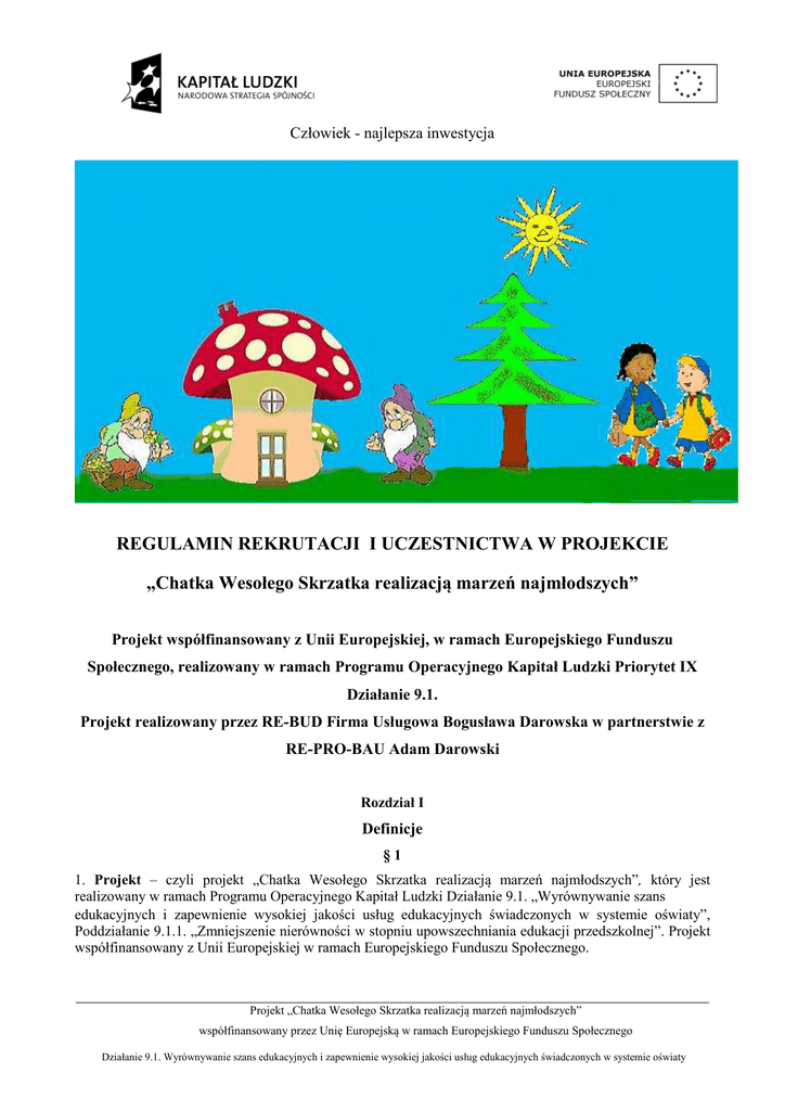 Człowiek - najlepsza inwestycja REGULAMIN REKRUTACJI I UCZESTNICTWA W PROJEKCIE „Chatka Wesołego Skrzatka realizacją marzeń najmłodszych” Projekt współfinansowany z Unii Europejskiej, w ramach Europejskiego Funduszu Społecznego, realizowany w ramach Programu Operacyjnego Kapitał Ludzki Priorytet IX Działanie 9.1. Projekt realizowany przez RE-BUD Firma Usługowa Bogusława Darowska w partnerstwie z RE-PRO-BAU Adam Darowski Rozdział I Definicje §1 1. Projekt – czyli projekt „Chatka Wesołego Skrzatka realizacją marzeń najmłodszych”, który jest realizowany w ramach Programu Operacyjnego Kapitał Ludzki Działanie 9.1. „Wyrównywanie szans edukacyjnych i zapewnienie wysokiej jakości usług edukacyjnych świadczonych w systemie oświaty”, Poddziałanie 9.1.1. „Zmniejszenie nierówności w stopniu upowszechniania edukacji przedszkolnej”. Projekt współfinansowany z Unii Europejskiej w ramach Europejskiego Funduszu Społecznego. ________________________________________________________________________________ Projekt „Chatka Wesołego Skrzatka realizacją marzeń najmłodszych” współfinansowany przez Unię Europejską w ramach Europejskiego Funduszu Społecznego Działanie 9.1. Wyrównywanie szans edukacyjnych i zapewnienie wysokiej jakości usług edukacyjnych świadczonych w systemie oświaty Człowiek - najlepsza inwestycja 2. Beneficjent – RE-BUD Firma Usługowa Bogusława Darowska, Chmielnik 23, 34-600 Limanowa. 3. Instytucja Wdrażająca (Instytucja Pośrednicząca II stopnia) - Wojewódzki Urząd Pracy w Krakowie, Plac Na Stawach 1, 30-107 Kraków. 4. Beneficjenci Ostateczni (BO-uczestnicy projektu) – dzieci w wieku od 2,5 do 5 lat zamieszkujące w Gminie Limanowa, którzy spełniają kryteria określone w § 4 niniejszego regulaminu i w wyniku przeprowadzonej rekrutacji zostały zakwalifikowane do udziału w projekcie. 5. Komisja Rekrutacyjna - komisja powołana przez Koordynatora Projektu w celu przeprowadzenia rekrutacji Beneficjentów Ostatecznych. W skład Komisji wchodzą: Koordynator Projektu, Dyrektor przedszkola, logopeda i pedagog. Rozdział II Informacje ogólne o Projekcie §2 1. Niniejszy regulamin określa zasady rekrutacji, warunki uczestnictwa, zasady organizacji zajęć oraz prawa i obowiązki uczestników projektu zwanych dalej „Uczestnikami” do projektu „Chatka Wesołego Skrzatka realizacją marzeń najmłodszych” współfinansowanego ze środków Europejskiego Funduszu Społecznego w ramach Programu Operacyjnego Kapitał Ludzki, Priorytetu IX – Rozwój wykształcenia i kompetencji w regionach, Działanie 9.1. Wyrównywanie szans edukacyjnych i zapewnienie wysokiej jakości usług edukacyjnych świadczonych w systemie oświaty”, Poddziałanie 9.1.1. „Zmniejszenie nierówności w stopniu upowszechniania edukacji przedszkolnej”. Celem projektu jest wzrost upowszechniania edukacji przedszkolnej w gminie wiejskiej Limanowa poprzez utworzenie przedszkola z oddziałem integracyjnym we wsi Mordarka. 2. Projekt realizuje RE-BUD Firma Usługowa Bogusława Darowska - osoba fizyczna prowadząca działalność gospodarczą (mikro przedsiębiorstwo) we współpracy z RE-PRO-BAU Adam Darowski (Partnerem projektu). 3. Projekt realizowany jest w okresie od 01.07.2013r. do 30.06.2015r. 4. Uczestnikami projektu będą dzieci w wieku od 2,5 do 5 lat zamieszkujący na terenie gminy wiejskiej Limanowa. Projekt zakłada udział 40 uczestników, w tym 22 dziewcząt oraz 18 chłopców. 5. W projekcie będą prowadzone następujące rodzaje działań: 1) Otwarcie przedszkola z oddziałem integracyjnym we wsi Mordarka. 2) Przeprowadzenie rekrutacji uczestników projektu. 3) Przedszkole czynne będzie od poniedziałku do piątku w godz. od 7.00 do 17.00. 4) Każde dziecko zapewnione będzie miało wyżywienie: śniadanie, obiad i podwieczorek. 5) W przedszkolu prowadzone będą zajęcia wg podstawy programowej, zgodnie z Rozporządzeniem MEN z dnia 23 grudnia 2008 r. dla 2grup, w tym jednej grupy integracyjnej od 09.2013r.do 30.06.2015r. oraz dodatkowe zajęcia tj.: religia – 1 raz w tyg. po 0,5 godz. j. angielski – 2 razy w tyg. po 0,5 godz. rytmika – 2 razy w tyg. po 0,5 godz. zajęcia z logopedii – 2 razy w tyg. po 0,5 godz. zajęcia z oligofrenopedagogiki – 2 razy w tyg. po 0,5 godz. wyłącznie dla dzieci niepełnosprawnych 6) Organizacja 5 wyjazdów edukacyjnych, mających na celu zapoznanie dzieci z nowymi, dotąd nieznanymi miejscami. 6. Termin otwarcia przedszkola: 08.2013 r. ________________________________________________________________________________ Projekt „Chatka Wesołego Skrzatka realizacją marzeń najmłodszych” współfinansowany przez Unię Europejską w ramach Europejskiego Funduszu Społecznego Działanie 9.1. Wyrównywanie szans edukacyjnych i zapewnienie wysokiej jakości usług edukacyjnych świadczonych w systemie oświaty Człowiek - najlepsza inwestycja Rozdział III Proces rekrutacji §3 Informacje ogólne o rekrutacji 1. Rekrutacja rozpocznie się 01 sierpnia 2013 r. i będzie trwać do 26 sierpnia 2013 r., przy czym przyjmowanie zgłoszeń będzie od 01 sierpnia do 16 sierpnia 2013 r. w budynku przedszkola w biurze projektu. 2. Rodzice lub opiekunowie prawni dziecka ubiegający się o uczestnictwo dziecka w projekcie składają dokumenty rekrutacyjne do biura projektu mieszczącego się w budynku przedszkola do dnia 16 sierpnia 2013 r. Zgłoszenia niekompletne nie będą rozpatrywane. 3. Komisja rekrutacyjna w terminie do dnia 26 sierpnia 2013 r. podejmie decyzje o zakwalifikowaniu do projektu dzieci spełniających kryteria projektu. Komisja ustali listę podstawową osób zakwalifikowanych do projektu oraz listę osób rezerwowych. Na liście 4. 5. 6. 7. 8. zamieszczone zostaną dzieci spełniające kryteria projektu wg ilości uzyskanych punktów. W pierwszej kolejności uwzględnia się dzieci 3 - 5 letnie, a następnie dzieci 2,5 letnie, które uzyskały najwięcej punktów od 18 pkt