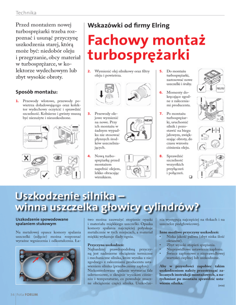 Technika Przed montażem nowej turbosprężarki trzeba rozpoznać i usunąć przyczynę uszkodzenia starej, którą może być: niedobór oleju i przegrzanie, obcy materiał w turbosprężarce, w kolektorze wydechowym lub zbyt wysokie obroty. Wskazówki od firmy Elring Fachowy montaż turbosprężarki 2. Wymienić olej silnikowy oraz filtry oleju i powietrza. Sposób montażu: 1. Przewody wlotowe, przewody powietrza doładowującego oraz kolektor wydechowy oczyścić i sprawdzić szczelność. Kołnierze i gwinty muszą być niezużyte i nieuszkodzone. 5. Do montażu turbosprężarki, zastosować nowe uszczelki i śruby. 6. Momenty dokręcające zgodne z zaleceniami producenta. 3. Przewody olejowe wymienić na nowe. Przy ich montażu w żadnym wypadku nie stosować płynnych środków uszczelniających. 7. Po montażu turbosprężarki, uruchomić silnik i pozostawić na biegu jałowym, zwiększając obroty, do czasu wzrostu ciśnienia oleju. 4. Nową turbosprężarkę przed montażem napełnić olejem, lekko obracając wirnikiem. 8. Sprawdzić szczelność wszystkich przyłączeń i połączeń. Uszkodzenie silnika – winna uszczelka głowicy cylindrów? Uszkodzenie spowodowane spalaniem stukowym Na metalowej opasce komory spalania uszczelki (zdjęcie) można rozpoznać wyraźne wgniecenia i odkształcenia. Ła- two można zauważyć stopienie opaski i materiału miękkiego uszczelki. Opaska komory spalania najczęściej połyskuje metalicznie w tych miejscach, a materiał miękki wykazuje ślady ognia. Przyczyna uszkodzeń: Najbardziej prawdopodobną przyczyną jest nadmierne obciążenie termiczne i mechaniczne silnika, które wynika z niezgodnego z zaleceniami producenta ustawieniem silnika (przedwczesny zapłon). Niekontrolowane spalanie wytwarza fale uderzeniowe, o skrajnie wysokim ciśnieniu i temperaturze, co powoduje znaczne obciążenie części silnika. Uszkodze- 34 Fota FORUM nia występują najczęściej na tłokach i na uszczelce podgłowicowej. Inne możliwe przyczyny uszkodzeń: • Niska jakość paliwa (zbyt niska ilość oktanów). • Zbyt wysoki stopień sprężania. • Nieprawidłowe ustawienie zapłonu. • Świece zapłonowe o nieprawidłowej wartości cieplnej lub uszkodzone. Aby w przyszłości zapobiec takim uszkodzeniom należy przestrzegać zalecanych instrukcji montażowych, a natychmiast po montażu sprawdzić ustawienie silnika. (mie)