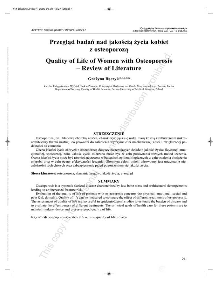 111 Baczyk:Layout 1 2009-09-30 15:27 Strona 1 O r t o p e d i a Traumatologia Rehabilitacja © MEDSPORTPRESS, 2009; 4(6); Vol. 11, 291-303 ed . Przegląd badań nad jakością życia kobiet z osteoporozą Grażyna Bączyk(A,B,E,F,G) tio np Katedra Pielęgniarstwa, Wydział Nauk o Zdrowiu, Uniwersytet Medyczny im. Karola Marcinkowskiego, Poznań, Polska Department of Nursing, Faculty of Health Sciences, Poznan University of Medical Sciences, Poland ibu -d istr STRESZCZEnIE us eo nly Osteoporoza jest układową chorobą kośćca, charakteryzująca się niską masą kostną i zaburzeniem mikroarchitektury tkanki kostnej, co prowadzi do osłabienia wytrzymałości mechanicznej kości i zwiększonej podatności na złamania. Ocena jakości życia chorych z osteoporozą dotyczy następujących dziedzin jakości życia: fizycznej, emocjonalnej, społecznej, bólu. Jakość życia mierzona może być w celu porównania różnych metod leczenia. Ocena jakości życia może być również użyteczna w badaniach epidemiologicznych w celu ustalenia obciążenia chorobą oraz w celu oceny efektywności leczenia. Głównym celem opieki zdrowotnej jest utrzymanie niezależności tych chorych oraz zabezpieczenie przed pogorszeniem się jakości życia. on al Słowa kluczowe: osteoporoza, złamania kręgów, jakość życia, przegląd SUMMARY for pe rs Osteoporosis is a systemic skeletal disease characterized by low bone mass and architectural derangements leading to an increased fracture risk. Evaluation of the quality of life of patients with osteoporosis concerns the physical, emotional, social and pain QoL domains. Quality of life can be measured to compare the effect of different treatments of osteoporosis. The assessment of quality of life is also useful in epidemiological studies to estimate the burden of disease and to evaluate the effectiveness of different treatments. The principal goals of health care for these patients are to maintain independence and preserve good quality of life. is c op y is Key words: osteoporosis, vertebral fractures, quality of life, review Th This copy is for personal use only - distribution prohibited. This copy is for personal use only - distribution prohibited. This copy is for personal use only - distribution prohibited. - roh ibit Quality of Life of Women with Osteoporosis – Review of Literature - This copy is for personal use only - distribution prohibited. - ARTYKUŁ PRZEGLĄDOWY / REVIEW ARTICLE 291 111 Baczyk:Layout 1 2009-09-30 15:27 Strona 2 - BACKGROUnD Osteoporoza charakteryzuje się niską masą kostną i zaburzeniem mikroarchitektury tkanki kostnej, co prowadzi do osłabienia wytrzymałości mechanicznej kości i zwiększonej podatności na złamania [1]. Badania epidemiologiczne wykazują, że osteoporoza występuje w okresie pomenopauzalnym i charakteryzuje się wysoką chorobowością, związaną ze złamaniami kręgów kręgosłupa, nasady dalszej kości promieniowej oraz bliższej nasady kości udowej. Złamania trzonów kręgów kręgosłupa często powodują ostre dolegliwości bólowe pleców i zaburzają sprawność funkcjonalną. Wraz ze wzrostem liczby złamanych kręgów wzrasta natężenie bólu, a tym samym pogłębia się niesprawność [2,3,4,5,6,7,8,9]. Złamaniom bliższej nasady kości promieniowej również towarzyszy ból i upośledzenie funkcji kończyny górnej. W przypadku tych złamań przy prawidłowym leczeniu i rehabilitacji powraca pełna sprawności kończyny [3]. Złamania w zakresie bliższej nasady kości udowej są przyczyną ostrych dolegliwości bólowych, upośledzają funkcję ruchową, a leczenie odbywa się w warunkach szpitalnych. Proces rekonwalescencji jest długi i powolny, często zostają deficyty w zakresie sprawności, chorzy tracą zdolność do samodzielnego wykonywania podstawowych czynności życiowych, stając się zależnymi od otoczenia [10,11]. Następstwa związane z występowaniem osteoporozy stanowią problem nie tylko dla chorych z osteoporozą, lecz również dla ich środowiska rodzinnego oraz całego społeczeństwa. Wraz z intensywnym rozwojem badań nad jakością życia w naukach o zdrowiu, jak i w naukach medycznych pojawia się potrzeba oceny jakości życia chorych z osteoporozą. Mimo licznych analiz teoretycznych i badań empirycznych, dyskusje nad sposobem pojmowania i dokonywania oceny jakości życia w medycynie trwają nadal. Próby uściślenia definicji jakości życia doprowadziły ostatecznie do stworzenia nowego pojęcia jakości życia, nadającego się do zastosowania w naukach medycznych. Jest to „jakość życia uwarunkowana stanem zdrowia” – Health Related Quality of Life (HRQOL) [12,13]. Wg Shipper’a jakość życia uwarunkowana stanem zdrowia jest to funkcjonalny efekt choroby i jej leczenia odbierany (przeżywany) przez pacjenta [13]. Celem pracy jest dokonanie przeglądu badań nad jakością życia kobiet z osteoporozą pomenopauzalną ze złamaniami i bez złamań trzonów kręgów kręgosłupa. Osteoporosis is characterized by low bone mass and architectural derangements leading to impaired mechanical resistance of bone and an increased fracture risk [1]. Epidemiological studies suggest that osteoporosis is most likely to appear in the postmenopausal period and is associated with a high morbidity related to fractures of the vertebrae, distal radius and proximal femur. Fractures of vertebral bodies often produce acute back pain and impair functional status. The higher the number of fractured vertebrae, the higher the pain intensity and, consequently, the more severe the impairment [2,3,4,5, 6,7,8,9]. Fractures of the distal radius are also accompanied by pain and impaired function of the upper extremity. Appropriate treatment and rehabilitation, however, may restore its full range of activity [3]. Fractures of the proximal femur produce acute pain, impair the patient’s locomotor abilities and must be treated in the hospital setting. Recovery proceeds sl