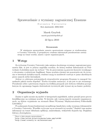 Sprawozdanie z wymiany zagranicznej Erasmus Coventry University Rok akademicki: 2009/2010 Marek Grzybek [email protected] 22 lipca 2010 Streszczenie W niniejszym sprawozdaniu zawarto spostrzeżenia związane ze studiowaniem w Coventry University. Z perspektywy studenta informatyki przedstawione zostały uwagi na temat uczelni, miasta i spraw organizacyjnych. 1 Wstęp Za wyborem Coventry University jako miejsca docelowego wymiany zagranicznej przemawia fakt, iż jest to jedyna angielska uczelnia, do której student Informatyki na Politechnice Lubelskiej może się wybrać.1 Nie do przecenienia są przecież korzyści wynikające z obcowania z rodowitymi Anglikami. Sama uczelnia również nie pozostawia nic do życzenia w kwestiach dydaktycznych; studenci mają tu możliwość rozwoju w jasno określonych przez samych siebie kierunkach. Jedyne co odstrasza potencjalnych stypendystów programu Erasmus to mnogość formalności jakich trzeba dopełnić. Trzeba wyraźnie zaznaczyć, iż nie jest to nic strasznego. Poradzenie sobie z pierwszym etapem tej wielkiej przygody jest dobrym wkładem początkowym do ogromnego bagażu doświadczeń życiowych jaki wynosi się na koniec podróży. 2 Organizacja wyjazdu Zanim w ogóle zacznie się myśleć w kategoriach angielskich, należy przejść przez proces kwalifikacyjny na rodzimej uczelni. Te kwestie, jak i szereg innych czynności organizacyjnych, są dobrze wyjaśnione na stronach Biura Wymiany Międzynarodowej Politechniki Lubelskiej.2 Po pokonaniu licznej konkurencji szczęśliwego kandydata czeka wymiana dokumentów z Coventry University. Wszelkie wytyczne są na stronach tej uczelni.3 Znaleźć tam można informacje na temat składania aplikacji, zamieszkania, wskazówki dojazdu itp. Dogłębna lektura obowiązkowa. 1 Stan w dniu pisania sprawozdania. http://bwm.pollub.pl/politechnika/index.php?id=360 3 http://wwwm.coventry.ac.uk/International 2 1 Na tym etapie należy także ułożyć Learning Agreement – międzyuczelnianą umowę o programie nauczania. W tym celu należy prześledzić własny tok nauki na najbliższe dwa semestry i porównać to z tym, co oferuje Coventry University. Sylabusy Coventry (bieżący i prowizoryczny) dostępne są na stronie http://mid.coventry.ac.uk/. Trzeba przy tym wziąć pod uwagę fakt, że docelowy kierunek studiowania – BSc Informatics – składa się z sześciu modułów (przedmiotów). Wybrać zaś można pięć, gdyż jednym z owych sześciu jest obowiązkowy Individual Project pełniący rolę pracy inżynierskiej. Istnieje co prawda możliwość wyboru większej liczby przedmiotów, jednak wiąże się to z dodatkowymi kosztami – uczelnia wystawia dodatkową fakturę, którą przyszłoby opłacić z własnych środków. Jest to sprzeczne z ideą programu Erasmus; co więcej, ta podstawowa szóstka powinna być w wystarczający sposób zajmująca, aby nie przejmować się (być może) zbędnymi dodatkami. Jest oczywiste, że niekiedy nie sposób znaleźć zamiennika za dany przedmiot. Z pomocą przyjść może indywidualna organizacja toku studiów (informacje w dziekanacie PL). Z drugiej strony, oprócz standardowego zestawu przedmiotów poziomu 3 w Coventry University, można wybierać spośród niższych stopni. W tym przypadku konieczne jest osobiste sprawdzenie czy nie występują kolizje czasowe pomiędzy modułami4 jak też nieco inna ścieżka zatwierdzania przedmiotu. Taka opcja będzie wymagała pofatygowania się do odpowiednich władz uczelni a także osób prowadzących dany moduł. Standardowych wyborów dokonuje się on-line. Podróż do Albionu Za przewodnikiem dla studentów zagranicznych na wspominanej wcześniej stronie śmiało można powtórzyć, że najwygodniejszym sposobem na dotarcie do Coventry jest przylot do Birmingham. Tamtejsze lotnisko dzieli od miasta dziesięciominutowa jazda pociągiem (kursuje co kwadrans). Autobusem też można się do Coventry dostać, ale trzeba będzie poczekać odrobinę dłużej. Atutem tej opcji jest to, że wysiada się w bardzo bliskiej okolicy campusu. Stacja kolejowa zaś znajduję się 10 minut pieszej wędrówki na południowy zachód od obiektów uczelni (nota bene położonych w centrum miasta). Koszt biletu lotniczego (w jedną stronę, z bagażem, w tanich liniach) powinien zamknąć się w 200 zł (gdy zarezerwowany odpowiednio wcześnie). Alternatywą do lotniska w Birmingham są nieco dalsze East Midlands i jednostki londyńskie. Zupełną odmianą, męczącą i summa summarum bardziej kosztowną, jest podróż autokarem, która w nagłych przypadkach unieruchomienia innych kanałów komunikacyjnych (vide wybuch wulkanu) może uratować skórę. 3 Nowa Alma Mater Zaaklimatyzowanie się w Coventry University nie wymaga ogromnego wysiłku. Już po pierwszym tygodniu, w którym organizowane są liczne spotkania informacyjne (jak i towarzyskie – w uczelnianych klubach), „świeżak” (z ang. fresher ) poczuje się jak w domu. Topografia uczelnianych obiektów nie powinna nastręczać problemów. Choć budynki te nie stoją jeden przy drugim, to i tak wszystkie znajdują się dość blisko siebie i zgrabnie wkomponowane są w centrum miasta. Każdy z nich nazwany jest od konkretnej, w jakiś 4 Plan zajęć dostępny na: http://omis.coventry.ac.uk/. 2 sposób zasłużonej osoby, jak na przykład Armstrong Siddeley Building – wydział informatyki i inżynierii, w którym spędza się najwięcej czasu. Całe miasto Coventry to stosunkowo nowe budownictwo. Wszechobecny jest feniks jako symbol powojennego odrodzenia miasta. Nie inaczej jest z budynkami uczelnianymi. Wszystkie charakteryzują się wysokim standardem wykonania; zarówno z zewnątrz jak i wewnątrz są miłe dla oka. Wyposażenie jest bardzo dobre. Student Politechniki Lubelskiej nie raz może poczuć się tym przytłoczony. Szczególne wrażenie robi kilkupiętrowa biblioteka z wieloma stanowiskami komputerowymi, wydzielonymi miejscami do pracy grupowej i ind