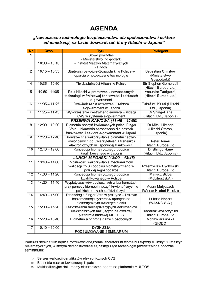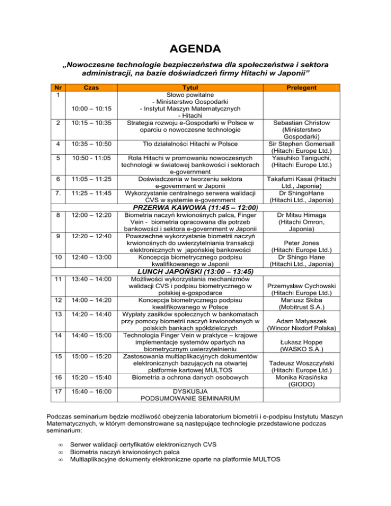 AGENDA „Nowoczesne technologie bezpieczeństwa dla społeczeństwa i sektora administracji, na bazie doświadczeń firmy Hitachi w Japonii” Nr 1 Czas 10:00 – 10:15 Tytuł Słowo powitalne - Ministerstwo Gospodarki - Instytut Maszyn Matematycznych - Hitachi Strategia rozwoju e-Gospodarki w Polsce w oparciu o nowoczesne technologie 2 10:15 – 10:35 4 10:35 – 10:50 Tło działalności Hitachi w Polsce 5 10:50 - 11:05 6 11:05 – 11:25 7. 11:25 – 11:45 Rola Hitachi w promowaniu nowoczesnych technologii w światowej bankowości i sektorach e-government Doświadczenia w tworzeniu sektora e-government w Japonii Wykorzystanie centralnego serwera walidacji CVS w systemie e-government 8 12:00 – 12:20 9 12:20 – 12:40 Prelegent Sebastian Christow (Ministerstwo Gospodarki) Sir Stephen Gomersall (Hitachi Europe Ltd.) Yasuhiko Taniguchi, (Hitachi Europe Ltd.) Takafumi Kasai (Hitachi Ltd., Japonia) Dr ShingoHane (Hitachi Ltd., Japonia) PRZERWA KAWOWA (11:45 – 12:00) 10 12:40 – 13:00 11 13:40 – 14:00 Biometria naczyń krwionośnych palca, Finger Vein - biometria opracowana dla potrzeb bankowości i sektora e-government w Japonii Powszechne wykorzystanie biometrii naczyń krwionośnych do uwierzytelniania transakcji elektronicznych w japońskiej bankowości Koncepcja biometrycznego podpisu kwalifikowanego w Japonii Dr Mitsu Himaga (Hitachi Omron, Japonia) Peter Jones (Hitachi Europe Ltd.) Dr Shingo Hane (Hitachi Ltd., Japonia) LUNCH JAPOŃSKI (13:00 – 13:45) 12 14:00 – 14:20 13 14:20 – 14:40 14 15 14:40 – 15:00 15:00 – 15:20 16 15:20 – 15:40 17 15:40 – 16:00 Możliwości wykorzystania mechanizmów walidacji CVS i podpisu biometrycznego w polskiej e-gospodarce Koncepcja biometrycznego podpisu kwalifikowanego w Polsce Wypłaty zasiłków społecznych w bankomatach przy pomocy biometrii naczyń krwionońsnych w polskich bankach spółdzielczych Technologia Finger Vein w praktyce – krajowe implementacje systemów opartych na biometrycznym uwierzytelnieniu Zastosowania multiaplikacyjnych dokumentów elektronicznych bazujących na otwartej platformie kartowej MULTOS Biometria a ochrona danych osobowych Przemysław Cychowski (Hitachi Europe Ltd.) Mariusz Skiba (Mobitrust S.A.) Adam Matyaszek (Wincor Nixdorf Polska) Łukasz Hoppe (WASKO S.A.) Tadeusz Woszczyński (Hitachi Europe Ltd.) Monika Krasińska (GIODO) DYSKUSJA PODSUMOWANIE SEMINARIUM Podczas seminarium będzie możliwość obejrzenia laboratorium biometrii i e-podpisu Instytutu Maszyn Matematycznych, w którym demonstrowane są następujące technologie przedstawione podczas seminarium: • • • Serwer walidacji certyfikatów elektronicznych CVS Biometria naczyń krwionośnych palca Multiaplikacyjne dokumenty elektroniczne oparte na platformie MULTOS