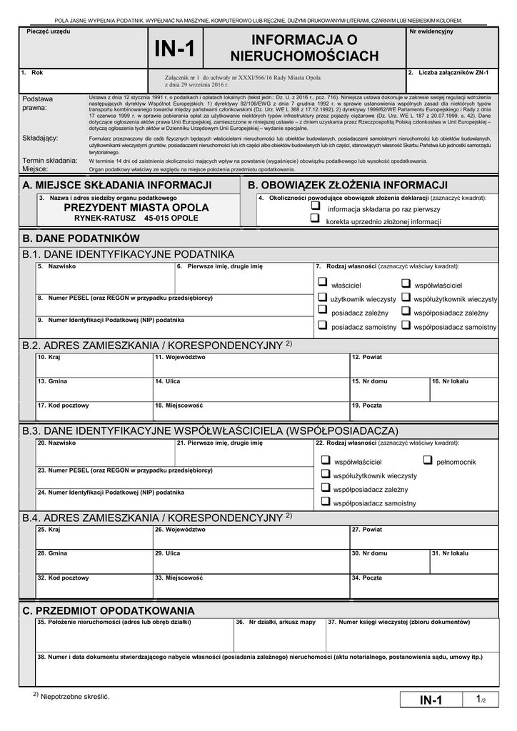 POLA JASNE WYPEŁNIA PODATNIK. WYPEŁNIAĆ NA MASZYNIE, KOMPUTEROWO LUB RĘCZNIE, DUŻYMI DRUKOWANYMI LITERAMI, CZARNYM LUB NIEBIESKIM KOLOREM. IN-1 Pieczęć urzędu 1. Rok INFORMACJA O NIERUCHOMOŚCIACH Załącznik nr 1 do uchwały nr XXXI/566/16 Rady Miasta Opola z dnia 29 września 2016 r. Podstawa prawna: Nr ewidencyjny 2. Liczba załączników ZN-1 Ustawa z dnia 12 stycznia 1991 r. o podatkach i opłatach lokalnych (tekst jedn.: Dz. U. z 2016 r., poz. 716). Niniejsza ustawa dokonuje w zakresie swojej regulacji wdrożenia następujących dyrektyw Wspólnot Europejskich: 1) dyrektywy 92/106/EWG z dnia 7 grudnia 1992 r. w sprawie ustanowienia wspólnych zasad dla niektórych typów transportu kombinowanego towarów między państwami członkowskimi (Dz. Urz. WE L 368 z 17.12.1992), 2) dyrektywy 1999/62/WE Parlamentu Europejskiego i Rady z dnia 17 czerwca 1999 r. w sprawie pobierania opłat za użytkowanie niektórych typów infrastruktury przez pojazdy ciężarowe (Dz. Urz. WE L 187 z 20.07.1999, s. 42). Dane dotyczące ogłoszenia aktów prawa Unii Europejskiej, zamieszczone w niniejszej ustawie – z dniem uzyskania przez Rzeczpospolitą Polską członkostwa w Unii Europejskiej – dotyczą ogłoszenia tych aktów w Dzienniku Urzędowym Unii Europejskiej – wydanie specjalne. Składający: Termin składania: Miejsce: Formularz przeznaczony dla osób fizycznych będących właścicielami nieruchomości lub obiektów budowlanych, posiadaczami samoistnymi nieruchomości lub obiektów budowlanych, użytkownikami wieczystymi gruntów, posiadaczami nieruchomości lub ich części albo obiektów budowlanych lub ich części, stanowiących własność Skarbu Państwa lub jednostki samorządu terytorialnego. W terminie 14 dni od zaistnienia okoliczności mających wpływ na powstanie (wygaśnięcie) obowiązku podatkowego lub wysokość opodatkowania. Organ podatkowy właściwy ze względu na miejsce położenia przedmiotu opodatkowania. A. MIEJSCE SKŁADANIA INFORMACJI 3. Nazwa i adres siedziby organu podatkowego PREZYDENT MIASTA OPOLA RYNEK-RATUSZ B. DANE PODATNIKÓW B. OBOWIĄZEK ZŁOŻENIA INFORMACJI 4. Okoliczności powodujące obowiązek złożenia deklaracji (zaznaczyć kwadrat): 45-015 OPOLE B.1. DANE IDENTYFIKACYJNE PODATNIKA 5. Nazwisko 6. Pierwsze imię, drugie imię 8. Numer PESEL (oraz REGON w przypadku przedsiębiorcy) 9. Numer Identyfikacji Podatkowej (NIP) podatnika B.2. ADRES ZAMIESZKANIA / KORESPONDENCYJNY 2) informacja składana po raz pierwszy korekta uprzednio złożonej informacji 7. Rodzaj własności (zaznaczyć właściwy kwadrat): właściciel użytkownik wieczysty posiadacz zależny posiadacz samoistny 10. Kraj 11. Województwo 12. Powiat 13. Gmina 14. Ulica 15. Nr domu 17. Kod pocztowy 18. Miejscowość 19. Poczta współwłaściciel współużytkownik wieczysty współposiadacz zależny współposiadacz samoistny 16. Nr lokalu B.3. DANE IDENTYFIKACYJNE WSPÓŁWŁAŚCICIELA (WSPÓŁPOSIADACZA) 20. Nazwisko 21. Pierwsze imię, drugie imię 23. Numer PESEL (oraz REGON w przypadku przedsiębiorcy) 24. Numer Identyfikacji Podatkowej (NIP) podatnika B.4. ADRES ZAMIESZKANIA / KORESPONDENCYJNY 2) 22. Rodzaj własności (zaznaczyć właściwy kwadrat): współwłaściciel pełnomocnik współużytkownik wieczysty współposiadacz zależny współposiadacz samoistny 25. Kraj 26. Województwo 27. Powiat 28. Gmina 29. Ulica 30. Nr domu 32. Kod pocztowy 33. Miejscowość 34. Poczta C. PRZEDMIOT OPODATKOWANIA 35. Położenie nieruchomości (adres lub obręb działki) 36. Nr działki, arkusz mapy 31. Nr lokalu 37. Numer księgi wieczystej (zbioru dokumentów) 38. Numer i data dokumentu stwierdzającego nabycie własności (posiadania zależnego) nieruchomości (aktu notarialnego, postanowienia sądu, umowy itp.) 2) Niepotrzebne skreślić. IN-1 1/2 POLA JASNE WYPEŁNIA PODATNIK. WYPEŁNIAĆ NA MASZYNIE, KOMPUTEROWO LUB RĘCZNIE, DUŻYMI DRUKOWANYMI LITERAMI, CZARNYM LUB NIEBIESKIM KOLOREM. D. DANE PRZEDMIOTÓW OPODATKOWANIA NIEPODLEGAJĄCYCH ZWOLNIENIU D.1. POWIERZCHNIA GRUNTÓW 1. Związane z prowadzeniem działalności gospodarczej, bez względu na sposób zakwalifikowania w ewidencji gruntów i budynków 2. Pod wodami powierzchniowymi stojącymi lub wodami powierzchniowymi płynącymi jezior i zbiorników sztucznych (w ha z dokładnością do 4 miejsc po przecinku) 3. Pozostałe grunty, w tym zajęte na prowadzenie odpłatnej statutowej działalności pożytku publicznego przez organizacje pożytku publicznego 4. Niezabudowane objęte obszarem rewitalizacji, o którym mowa w ustawie z dnia 9 października 2015 r. o rewitalizacji (Dz. U. poz. 1777), i położonych na terenach, dla których miejscowy plan zagospodarowania przestrzennego przewiduje przeznaczenie pod zabudowę mieszkaniową, usługową albo zabudowę o przeznaczeniu mieszanym obejmującym wyłącznie te rodzaje zabudowy, jeżeli od dnia wejścia w życie tego planu w odniesieniu do tych gruntów upłynął okres 4 lat, a w tym czasie nie zakończono budowy zgodnie z przepisami prawa budowlanego D.2. POWIERZCHNIA UŻYTKOWA BUDYNKÓW LUB ICH CZĘŚCI 49. 3. Zajęte na prowadzenie działalności gospodarczej w zakresie obrotu kwalifikowanym materiałem siewnym - ogółem 50. - od 1,40 do 2,20 m (zaliczyć 50% powierzchni) 51. - powyżej 2,20 m 4. Związanych z udzielaniem świadczeń zdrowotnych w rozumieniu przepisów o działalności leczniczej, zajętych przez podmioty udzielające tych świadczeń - ogółem - od 1,40 do 2,20 m (zaliczyć 50% powierzchni) 5. Pozostałe, w tym zajęte na prowadzenie odpłatnej statutowej działalności pożytku publicznego przez organizacje pożytku publicznego - ogółem - od 1,40 do 2,20 m (zaliczyć 50% powierzchni) 53. 55. 56. 57. - powyżej 2,20 m E.3. WARTOŚĆ BUDOWLI LUB ICH CZĘŚCI ZWIĄZANYCH Z PROWADZENIEM DZIAŁALNOŚCI GOSPODARCZEJ F. INFORMACJA O PRZEDMIOTACH ZWOLNIONYCH 60. Powierzchnia gruntów m2 m2 m2 m2 m2 m2 m2 m2 m2 m2 m2 m2 m2 m2 m2 Podstawa opodatkowania