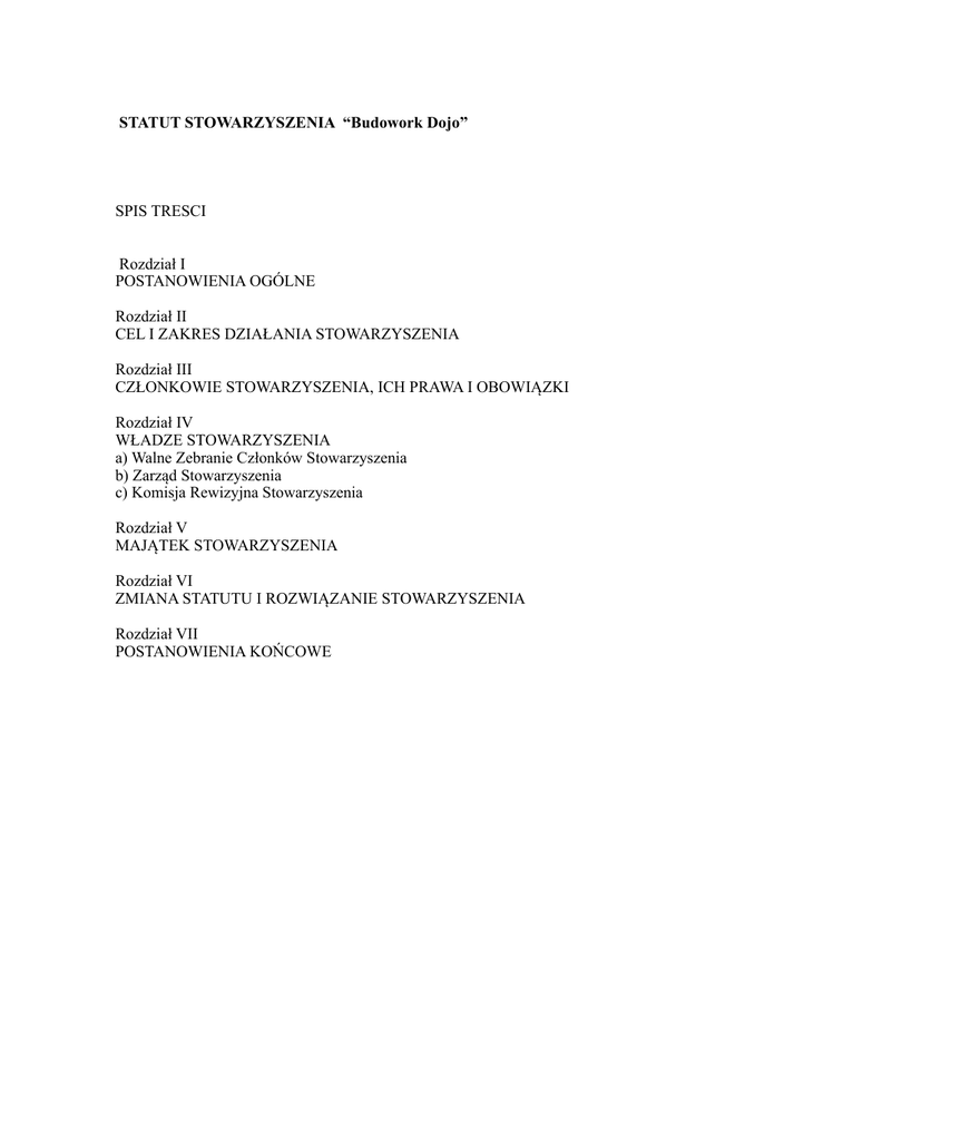 STATUT STOWARZYSZENIA “Budowork Dojo” SPIS TRESCI Rozdział I POSTANOWIENIA OGÓLNE Rozdział II CEL I ZAKRES DZIAŁANIA STOWARZYSZENIA Rozdział III CZŁONKOWIE STOWARZYSZENIA, ICH PRAWA I OBOWIĄZKI Rozdział IV WŁADZE STOWARZYSZENIA a) Walne Zebranie Członków Stowarzyszenia b) Zarząd Stowarzyszenia c) Komisja Rewizyjna Stowarzyszenia Rozdział V MAJĄTEK STOWARZYSZENIA Rozdział VI ZMIANA STATUTU I ROZWIĄZANIE STOWARZYSZENIA Rozdział VII POSTANOWIENIA KOŃCOWE Rozdział I POSTANOWIENIA OGÓLNE §1 1. Stowarzyszenie nosi nazwę BUDOWORK DOJO, w dalszych postanowieniach statutu zwane Stowarzyszeniem. 2. Stowarzyszenie może używać skróconej nazwy „BUDOWORK” . §2 1. Terenem działania Stowarzyszenia jest obszar Rzeczypospolitej Polskiej. 2. Dla właściwego realizowania celów statutowych Stowarzyszenie może prowadzić działalność poza granicami Rzeczypospolitej Polskiej na terenie innych państw z poszanowaniem tamtejszego prawa. 3. Siedzibą władz naczelnych Stowarzyszenia jest miasto Gdańsk. 4. Stowarzyszenie może powoływać jednostki terenowe - oddziały, obejmujące zasięgiem działania jeden lub kilka powiatów. Jednostki terenowe powołuje Zarząd Stowarzyszenia. §3 Stowarzyszenie jest zawiązane na czas nieograniczony. Posiada osobowość prawną. Działa na podstawie ustawy z dnia 18 stycznia 1996 r. o kulturze fizycznej (Dz.U.Nr 81 Poz. 889 z późn. zmianami), ustawy z dnia 7 kwietnia 1989 r. prawo o stowarzyszeniach (Dz.U.Nr 20 poz.104 z późn. zmianami) oraz niniejszego statutu. §4 1. Stowarzyszenie używa własnej pieczęci z napisem „Budowork Dojo”. Wzór i wielkość pieczęci ustala Zarząd Stowarzyszenia. 2. Stowarzyszenie używa własnego logo i odznak zgodnie z obowiązującymi przepisami. §5 Stowarzyszenie może być członkiem krajowych i zagranicznych organizacji społecznych o tym samym lub podobnym profilu działania. §6 1. Stowarzyszenie jest organizacją non-profit i jego działania nie są ukierunkowane na osiąganie dochodów. 2. Stowarzyszenie nie prowadzi działalności gospodarczej. §7 Stowarzyszenie opiera swoją działalność na pracy społecznej jego członków. §8 Do prowadzenia swych spraw stowarzyszenie może zatrudniać pracowników w myśl obowiązujących przepisów. Rozdział II CEL I ZAKRES DZIAŁANIA STOWARZYSZENIA §9 Celem istnienia Stowarzyszenia jest: a) działanie na rzecz popularyzacji i rozwoju aikido oraz sztuk walki, b) upowszechnianie wiedzy i kształtowanie postaw społecznych sprzyjających aktywnemu spędzaniu czasu i rozwojowi rekreacji ruchowej dzieci, młodzieży oraz dorosłych, c) wspieranie lokalnych inicjatyw społecznych i samorządowych w zakresie popularyzacji rekreacji ruchowej, sportów i sztuk walki, obrony, samoobrony oraz ochrony, d) prowadzenie działalności kulturalno-oświatowej i szkoleniowej w zakresie edukacji społeczeństwa, e) inicjowanie, wspieranie i realizacja działań na rzecz poprawy stanu bezpieczeństwa społeczności lokalnych, f) tworzenie warunków materialnych, organizacyjno-prawnych i kadrowych do rekreacji ruchowej w formie aikido, samoobrony, sportów i sztuk walki. §10 1. Stowarzyszenie realizuje swoje cele przez: a) organizowanie treningów, obozów, seminariów oraz innych zajęć rekreacyjno – sportowych dla dzieci, młodzieży i dorosłych, b) propagowanie rekreacji ruchowej poprzez organizowanie pokazów, instruktaży, szkoleń, staży, zjazdów i obozów szkoleniowych, c) uczestnictwo w imprezach, projektach i przedsięwzięciach popularyzatorsko – szkoleniowych o zasięgu lokalnym, krajowym i międzynarodowym, d) współpraca z instytucjami samorządowymi, administracją państwową, organizacjami pozarządowymi oraz innymi partnerami krajowymi i zagranicznymi celem projektowania i realizacji przedsięwzięć społecznych i edukacyjnych, e) występowanie z inicjatywą pozyskiwania, tworzenia i realizacji różnych form wsparcia materialnego Stowarzyszenia, f) pozyskiwanie funduszy krajowych i unijnych na realizację działań statutowych stowarzyszenia i przedsięwzięć wspierających jego rozwój, g) dofinansowywanie przedsięwzięć służących podwyższaniu kwalifikacji ogólnych oraz wiedzy i umiejętności specjalistycznych członków Stowarzyszenia celem podniesienia poziomu jakości realizowanych zadań statutowych. Rozdział III CZŁONKOWIE STOWARZYSZENIA, ICH PRAWA I OBOWIĄZKI §11 Członkowie stowarzyszenia dzielą się na: 1. Zwyczajnych, 2. Wspierających, 3. Honorowych, 4. Uczestników. §12 1. Członkiem zwyczajnym może być pełnoletnia osoba fizyczna, która przez swe oświadczenie zadeklarowała przystąpienie do Stowarzyszenia i uzyskała pozytywną rekomendację dwóch wprowadzających członków Stowarzyszenia. 2. Małoletni w wieku od 16 do 18 lat, którzy mają ograniczoną zdolność do czynności prawnych, mogą należeć do stowarzyszenia jako członek zwyczajny i korzystać z czynnego i biernego prawa wyborczego, z tym że w składzie zarządu stowarzyszenia większość muszą stanowić osoby o pełnej zdolności do czynności prawnych. §13 1. Członkiem wspierającym może być osoba prawna zainteresowana merytoryczną działalnością Stowarzyszenia, która zadeklarowała poparcie finansowe i została przyjęta na podstawie pisemnej deklaracji przyjętej przez Zarząd. 2. Członek wspierający posiada prawa członka zwyczajnego oprócz prawa wyborczego. §14 1. Członkostwo honorowe jest nadawane przez Walne Zebranie osobom szczególnie zasłużonym dla rozwoju Stowarzyszenia. 2. Członek honorowy posiada prawa członka zwyczajnego z wyjątkiem prawa wyborczego a ponadto zwolniony jest z obowiązku płacenia składek. §15 1. Członkiem uczestnikiem może być osoba fizyczna w wieku poniŜej 16 lat, za zgodą przedstawicieli ustawowych. 2. Członek uczestnik posiada prawa członka zwyczajnego z wyjątkiem prawa wyborczego. §16 1. Przyjęcie w poczet członków Stowarzyszenia następuje na podstawie jednogł