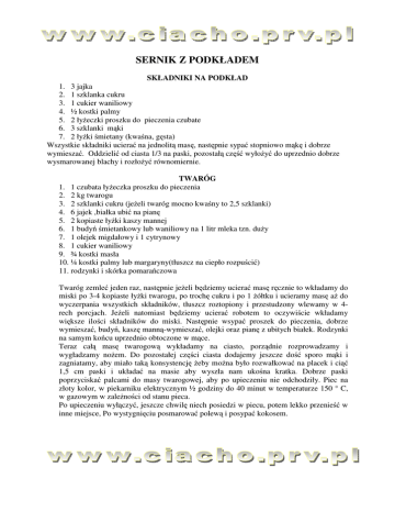 SERNIK Z PODKŁADEM SKŁADNIKI NA PODKŁAD 1. 3 jajka 2. 1 szklanka cukru 3. 1 cukier waniliowy 4. ½ kostki palmy 5. 2 łyżeczki proszku do pieczenia czubate 6. 3 szklanki mąki 7. 2 łyżki śmietany (kwaśna, gęsta) Wszystkie składniki ucierać na jednolitą masę, następnie sypać stopniowo mąkę i dobrze wymieszać. Oddzielić od ciasta 1/3 na paski, pozostałą część wyłożyć do uprzednio dobrze wysmarowanej blachy i rozłożyć równomiernie. TWARÓG 1. 1 czubata łyżeczka proszku do pieczenia 2. 2 kg twarogu 3. 2 szklanki cukru (jeżeli twaróg mocno kwaśny to 2,5 szklanki) 4. 6 jajek ,białka ubić na pianę 5. 2 kopiaste łyżki kaszy mannej 6. 1 budyń śmietankowy lub waniliowy na 1 litr mleka tzn. duży 7. 1 olejek migdałowy i 1 cytrynowy 8. 1 cukier waniliowy 9. ¾ kostki masła 10. ¼ kostki palmy lub margaryny(tłuszcz na ciepło rozpuścić) 11. rodzynki i skórka pomarańczowa Twaróg zemleć jeden raz, następnie jeżeli będziemy ucierać masę ręcznie to wkładamy do miski po 3-4 kopiaste łyżki twarogu, po trochę cukru i po 1 żółtku i ucieramy masę aż do wyczerpania wszystkich składników, tłuszcz roztopiony i przestudzony wlewamy w 4rech porcjach. Jeżeli natomiast będziemy ucierać robotem to oczywiście wkładamy większe ilości składników do miski. Następnie wsypać proszek do pieczenia, dobrze wymieszać, budyń, kaszę manną-wymieszać, olejki oraz pianę z ubitych białek. Rodzynki na samym końcu uprzednio obtoczone w mące. Teraz całą masę twarogową wykładamy na ciasto, porządnie rozprowadzamy i wygładzamy nożem. Do pozostałej części ciasta dodajemy jeszcze dość sporo mąki i zagniatamy, aby miało taką konsystencję żeby można było rozwałkować na placek i ciąć 1,5 cm paski i układać na masie aby wyszła nam ukośna kratka. Dobrze paski poprzyciskać palcami do masy twarogowej, aby po upieczeniu nie odchodziły. Piec na złoty kolor, w piekarniku elektrycznym ½ godziny do 40 minut w temperaturze 150 ° C, w gazowym w zależności od stanu pieca. Po upieczeniu wyłączyć, jeszcze chwilę niech posiedzi w piecu, potem lekko przenieść w inne miejsce, Po wystygnięciu posmarować polewą i posypać kokosem. POLEWA DO SERNIKA Z PODKŁADEM 1. 2. 3. 4. 5. ½ kostki palmy ½ szklanki cukru 1 łyżeczka kopiasta kakao 2-3 łyżki wody 1 łyżka mąki Wodę podgrzewamy, wsypujemy cukier rozpuszczając go, następnie wkładamy palmę po rozpuszczeniu palmy wsypujemy kakao, dokładnie mieszamy tak, aby nie było grudek i zagotowujemy. Odstawiamy i sypiemy mąkę, mieszamy dokładnie, ponownie zagotowujemy i po przestygnięciu smarujemy ciasto. SMACZNEGO