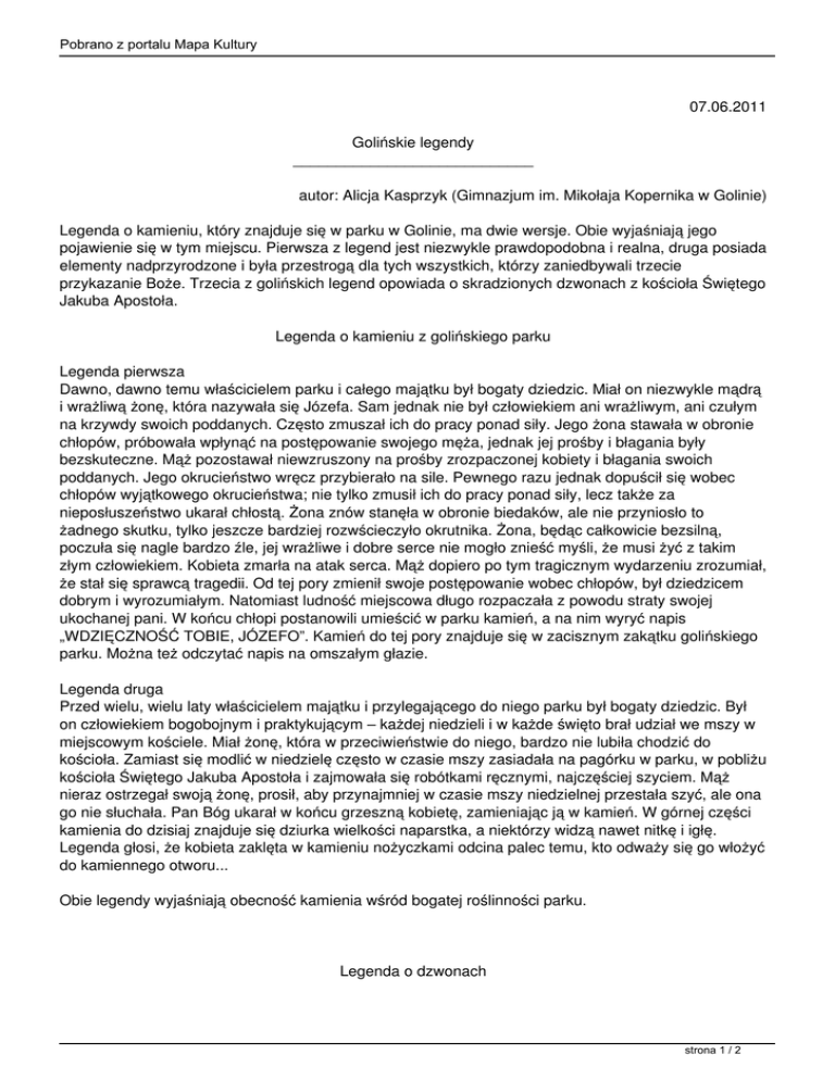 Pobrano z portalu Mapa Kultury 07.06.2011 Golińskie legendy ____________________________ autor: Alicja Kasprzyk (Gimnazjum im. Mikołaja Kopernika w Golinie) Legenda o kamieniu, który znajduje się w parku w Golinie, ma dwie wersje. Obie wyjaśniają jego pojawienie się w tym miejscu. Pierwsza z legend jest niezwykle prawdopodobna i realna, druga posiada elementy nadprzyrodzone i była przestrogą dla tych wszystkich, którzy zaniedbywali trzecie przykazanie Boże. Trzecia z golińskich legend opowiada o skradzionych dzwonach z kościoła Świętego Jakuba Apostoła. Legenda o kamieniu z golińskiego parku Legenda pierwsza Dawno, dawno temu właścicielem parku i całego majątku był bogaty dziedzic. Miał on niezwykle mądrą i wrażliwą żonę, która nazywała się Józefa. Sam jednak nie był człowiekiem ani wrażliwym, ani czułym na krzywdy swoich poddanych. Często zmuszał ich do pracy ponad siły. Jego żona stawała w obronie chłopów, próbowała wpłynąć na postępowanie swojego męża, jednak jej prośby i błagania były bezskuteczne. Mąż pozostawał niewzruszony na prośby zrozpaczonej kobiety i błagania swoich poddanych. Jego okrucieństwo wręcz przybierało na sile. Pewnego razu jednak dopuścił się wobec chłopów wyjątkowego okrucieństwa; nie tylko zmusił ich do pracy ponad siły, lecz także za nieposłuszeństwo ukarał chłostą. Żona znów stanęła w obronie biedaków, ale nie przyniosło to żadnego skutku, tylko jeszcze bardziej rozwścieczyło okrutnika. Żona, będąc całkowicie bezsilną, poczuła się nagle bardzo źle, jej wrażliwe i dobre serce nie mogło znieść myśli, że musi żyć z takim złym człowiekiem. Kobieta zmarła na atak serca. Mąż dopiero po tym tragicznym wydarzeniu zrozumiał, że stał się sprawcą tragedii. Od tej pory zmienił swoje postępowanie wobec chłopów, był dziedzicem dobrym i wyrozumiałym. Natomiast ludność miejscowa długo rozpaczała z powodu straty swojej ukochanej pani. W końcu chłopi postanowili umieścić w parku kamień, a na nim wyryć napis „WDZIĘCZNOŚĆ TOBIE, JÓZEFO”. Kamień do tej pory znajduje się w zacisznym zakątku golińskiego parku. Można też odczytać napis na omszałym głazie. Legenda druga Przed wielu, wielu laty właścicielem majątku i przylegającego do niego parku był bogaty dziedzic. Był on człowiekiem bogobojnym i praktykującym – każdej niedzieli i w każde święto brał udział we mszy w miejscowym kościele. Miał żonę, która w przeciwieństwie do niego, bardzo nie lubiła chodzić do kościoła. Zamiast się modlić w niedzielę często w czasie mszy zasiadała na pagórku w parku, w pobliżu kościoła Świętego Jakuba Apostoła i zajmowała się robótkami ręcznymi, najczęściej szyciem. Mąż nieraz ostrzegał swoją żonę, prosił, aby przynajmniej w czasie mszy niedzielnej przestała szyć, ale ona go nie słuchała. Pan Bóg ukarał w końcu grzeszną kobietę, zamieniając ją w kamień. W górnej części kamienia do dzisiaj znajduje się dziurka wielkości naparstka, a niektórzy widzą nawet nitkę i igłę. Legenda głosi, że kobieta zaklęta w kamieniu nożyczkami odcina palec temu, kto odważy się go włożyć do kamiennego otworu... Obie legendy wyjaśniają obecność kamienia wśród bogatej roślinności parku. Legenda o dzwonach strona 1 / 2 Pobrano z portalu Mapa Kultury Trzecia z golińskich legend opowiada o skradzionych dzwonach z kościoła Świętego Jakuba Apostoła. Szajka złodziei postanowiła ukraść dzwony z dzwonnicy przy kościele Świętego Jakuba Apostoła. Pod osłoną nocy udało im się zdjąć dzwony i załadować je na wóz. Złodzieje wyruszyli w drogę, która miała ich zaprowadzić nad rzekę Wartę. Najpierw z góry obok kościoła udali się w kierunku Kolna. W dawnych czasach obecna struga Kawnice była rzeką, którą w zapiskach nazywano rzeką Golina. Na tej rzeczce był most, przez który trzeba było przejechać. Złodzieje wjechali na kładkę i tu spotkała ich niespodzianka: most się zawalił pod ciężarem dzwonów, które utonęły. Do dziś niewielkie rozlewisko – pozostałość po rzece – przez mieszkańców Goliny jest nazywane Mostem. Kiedyś było to bardzo uczęszczane kąpielisko i miejsce, gdzie kobiety prały bieliznę pościelową, a potem suszyły ją na słońcu, aż stała się wyjątkowo biała. W noc świętojańską do dziś niektórzy słyszą bicie zatopionych dzwonów. Rzeczywiście, do dziś na dzwonnicy przy kościele Świętego Jakuba Apostoła nie ma dzwonów wzywających wiernych na nabożeństwo. strona 2 / 2