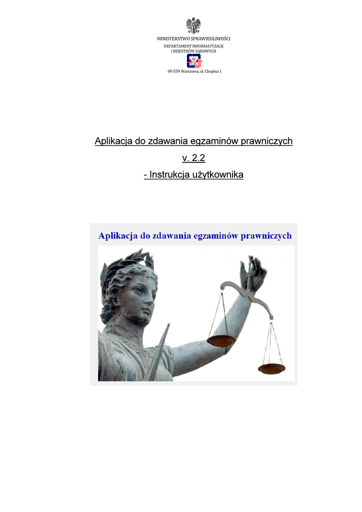 MINISTERSTWO SPRAWIEDLIWOŚCI DEPARTAMENT INFORMATYZACJI I REJESTRÓW SĄDOWYCH 00-559 Warszawa, ul. Chopina 1 Aplikacja do zdawania egzaminów prawniczych v. 2.2 - Instrukcja użytkownika MINISTERSTWO SPRAWIEDLIWOŚCI DEPARTAMENT INFORMATYZACJI I REJESTRÓW SĄDOWYCH I. Wstęp Niniejsza instrukcja skierowana jest do zdających w 2013 r. egzamin notarialny, w rozumieniu ustawy z dnia 14 lutego 1991 r. - Prawo o notariacie (Dz. U. z 2008 r. Nr 189, poz. 1158 z późn. zm.), przy użyciu komputerów. Minimalne wymagania, które powinien spełniać komputer zdającego dla prawidłowego działania aplikacji: • procesor Pentium 1 GHz lub jego odpowiednik; • 512 MB pamięci RAM (zalecane 1024MB); • system operacyjny (32/64-bit): Windows XP SP3 , Windows Vista , Windows 7, Windows 8; UWAGA: System operacyjny Windows 8.1 nie spełnia tego wymagania, aplikacja nie uruchomi się na tym systemie ! 1 • zainstalowany program Microsoft .NET Framework 3.5 SP1 ; • 100 MB wolnego miejsca na dysku systemowym komputera; • wolny port USB; • konto użytkownika o prawach administratora lokalnego do komputera ; • odinstalowany program antywirusowy; • wyłączony wygaszacz ekranu; • opcja (schemat) zasilania ustawiona na funkcję „prezentacja” / „wysoka wydajność” ; • zegar komputera ustawiony zgodnie z obowiązującą datą i czasem; • wyłączone aktualizacje automatyczne 2 3 Uwagi: • Aplikacja nie może być uruchamiana na maszynach wirtualnych. • Na egzaminie dopuszczalne jest korzystanie z myszek i klawiatur przewodowych. II. Schemat przeprowadzania egzaminów prawniczych w 2013 r. 1 Microsoft .NET w wersji 4.0 lub nowszej nie zawiera w sobie wymaganego środowiska w wersji 3.5 SP1. Microsoft .NET 3.5 SP1 jest domyślnie zintegrowany jako składnik systemu Windows 7, w przypadku systemu Windows XP, Vista, Windows 8 należy go doinstalować. 2 Aby sprawdzić czy zalogowany użytkownik posiada uprawnienia administratora lokalnego do komputera należy w linii poleceń wykonać komendę net user %username% i sprawdzić czy na wyświetlonej liście znajduje się następujący wpis „Członkostwa grup lokalnych *Administratorzy” 3 Komputer powinien być skonfigurowany w taki sposób aby w przypadku bezczynności nie używał funkcji wstrzymywania systemu (tryb uśpienia) i wygaszacza ekranu. Aplikacja do zdawania egzaminów prawniczych v 2.2 Copyright © 2013 r. Ministerstwo Sprawiedliwości 2 MINISTERSTWO SPRAWIEDLIWOŚCI Wsparcie techniczne Komisja Aplikant DEPARTAMENT INFORMATYZACJI I REJESTRÓW SĄDOWYCH Aplikacja do zdawania egzaminów prawniczych v 2.2 Copyright © 2013 r. Ministerstwo Sprawiedliwości 3 MINISTERSTWO SPRAWIEDLIWOŚCI DEPARTAMENT INFORMATYZACJI I REJESTRÓW SĄDOWYCH III. Instrukcja obsługi 1. Po uruchomieniu komputera otrzymany od komisji nośnik należy włożyć do portu USB komputera. 2. System automatycznie zainstaluje otrzymany nośnik jako Dysk wymienny i nada mu kolejną wolną literę. Aplikacja do zdawania egzaminów prawniczych v 2.2 Copyright © 2013 r. Ministerstwo Sprawiedliwości 4 MINISTERSTWO SPRAWIEDLIWOŚCI DEPARTAMENT INFORMATYZACJI I REJESTRÓW SĄDOWYCH 3. Na otrzymanym nośniku znajduje się tylko folder AZEP, który należy otworzyć. 4. Uruchamiamy aplikację poprzez dwukrotne kliknięcie na ikonę START.exe Aplikacja do zdawania egzaminów prawniczych v 2.2 Copyright © 2013 r. Ministerstwo Sprawiedliwości 5 MINISTERSTWO SPRAWIEDLIWOŚCI DEPARTAMENT INFORMATYZACJI I REJESTRÓW SĄDOWYCH 5. Po uruchomieniu aplikacji, w okienku „Podaj kod” wprowadzamy kod z koperty otrzymanej od Komisji egzaminacyjnej i zatwierdzamy go przez kliknięcie „OK”. Uwaga: Podczas testowania wersji demo możemy wpisać dowolny kod literowo-cyfrowy. 6. Należy sprawdzić poprawność kodu, który został wpisany i jeśli zgadza się z tym z koperty, należy kliknąć „Tak”. Aplikacja do zdawania egzaminów prawniczych v 2.2 Copyright © 2013 r. Ministerstwo Sprawiedliwości 6 MINISTERSTWO SPRAWIEDLIWOŚCI DEPARTAMENT INFORMATYZACJI I REJESTRÓW SĄDOWYCH 7. Funkcje aplikacji pogrupowane zostały w sekcjach oznaczonych w niniejszej instrukcji literami: A, B, C, D, E, F, G, H, I, J, K. a. W sekcji [ A ] znajdują się funkcje aplikacji używane w wypadku opuszczenia sali podczas trwania egzaminu. i. W przypadku zamiaru opuszczenia sali egzaminacyjnej, należy zgłosić to Przewodniczącemu Komisji egzaminacyjnej oraz kliknąć na przycisk „OPUSZCZENIE SALI”. ii. W momencie powrotu na salę egzaminacyjną, należy zgłosić to Przewodniczącemu Komisji egzaminacyjnej oraz kliknąć na przycisk „POWRÓT NA SALĘ”. Aplikacja do zdawania egzaminów prawniczych v 2.2 Copyright © 2013 r. Ministerstwo Sprawiedliwości 7 MINISTERSTWO SPRAWIEDLIWOŚCI DEPARTAMENT INFORMATYZACJI I REJESTRÓW SĄDOWYCH b. W sekcji [ B ] znajduje się przycisk zakończenia egzaminu „KONIEC”. UWAGA: Przycisk „KONIEC” kończy działanie aplikacji i należy go kliknąć dopiero, gdy jest się pewnym, że chce się zakończyć egzamin. Po kliknięciu przycisku „Tak” aplikacja automatycznie zapisuje pracę w formacie PDF. Pracę należy wydrukować na stanowiskach z dostępem do bazy aktów prawnych. c. W sekcji [ C ] znajduje się moduł zapisywania i wczytywania kopii zapasowych. UWAGA: W przypadku zaistnienia potrzeby odtworzenia pracy z kopii zapasowej, należy zgłosić ten fakt komisji egzaminacyjnej. Aplikacja do zdawania egzaminów prawniczych v 2.2 Copyright © 2013 r. Ministerstwo Sprawiedliwości 8 MINISTERSTWO SPRAWIEDLIWOŚCI DEPARTAMENT INFORMATYZACJI I REJESTRÓW SĄDOWYCH d. W sekcji [ D ] znajduje się Log aplikacji ze wszystkimi zaistniałymi zdarzeniami. e. W sekcji [ E ] znajdują się funkcje schowka: „Wklej”, „Wytnij”, „Kopiuj”. f. W sekcji [ F ] znajdują się funkcje aplikacji pozwalające na edycję pisanego tekstu w zakresie: wyrównanie do lewej, centrowanie, wyrównanie do prawej, justowanie, punktowanie, numerow