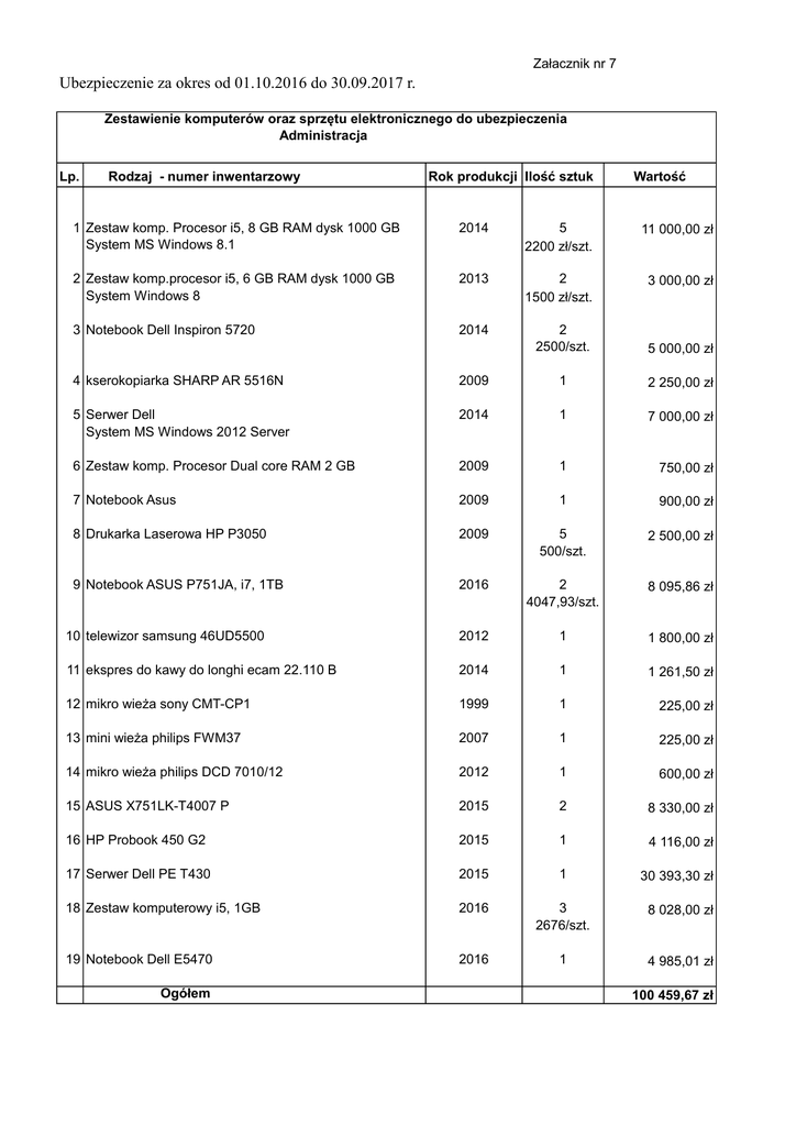 Załacznik nr 7 Ubezpieczenie za okres od 01.10.2016 do 30.09.2017 r. Zestawienie komputerów oraz sprzętu elektronicznego do ubezpieczenia Administracja Lp. Rodzaj - numer inwentarzowy Rok produkcji Ilość sztuk Wartość 1 Zestaw komp. Procesor i5, 8 GB RAM dysk 1000 GB System MS Windows 8.1 2014 5 2200 zł/szt. 11 000,00 zł 2 Zestaw komp.procesor i5, 6 GB RAM dysk 1000 GB System Windows 8 2013 2 1500 zł/szt. 3 000,00 zł 3 Notebook Dell Inspiron 5720 2014 2 2500/szt. 5 000,00 zł 4 kserokopiarka SHARP AR 5516N 2009 1 2 250,00 zł 5 Serwer Dell System MS Windows 2012 Server 2014 1 7 000,00 zł 6 Zestaw komp. Procesor Dual core RAM 2 GB 2009 1 750,00 zł 7 Notebook Asus 2009 1 900,00 zł 8 Drukarka Laserowa HP P3050 2009 5 500/szt. 2 500,00 zł 9 Notebook ASUS P751JA, i7, 1TB 2016 2 4047,93/szt. 8 095,86 zł 10 telewizor samsung 46UD5500 2012 1 1 800,00 zł 11 ekspres do kawy do longhi ecam 22.110 B 2014 1 1 261,50 zł 12 mikro wieża sony CMT-CP1 1999 1 225,00 zł 13 mini wieża philips FWM37 2007 1 225,00 zł 14 mikro wieża philips DCD 7010/12 2012 1 600,00 zł 15 ASUS X751LK-T4007 P 2015 2 8 330,00 zł 16 HP Probook 450 G2 2015 1 4 116,00 zł 17 Serwer Dell PE T430 2015 1 30 393,30 zł 18 Zestaw komputerowy i5, 1GB 2016 3 2676/szt. 8 028,00 zł 19 Notebook Dell E5470 2016 1 4 985,01 zł Ogółem 100 459,67 zł Zestawienie ubezpieczonego sprzętu elektronicznego od szkód materialnych Komórka Nadzoru i Dokumentacji Lp. Rodzaj - numer inwentarzowy 1 Zestaw komp.procesor i5, 6 GB RAM dysk 1000 GB System MS Windows 8.1 Rok produkcji Ilość sztuk Wartość 2013 1 1 350,00 zł 2 Zestaw komp. Procesor i5, 8 GB RAM dysk 1000 GB System MS Windows 8.1 Monitor LCD 21" 2014 1 2 415,00 zł 3 Notebook Lenovo B70-80 2016 1 3 190,00 zł 4 Notebook Dell 2014 1 2 175,00 zł 5 Drukarka HP LJ 2009 3 1 125,00 zł 6 Notebook ASUS P751JA, i7, 1TB 2016 1 4 047,93 zł Ogółem 14 302,93 zł Zestawienie ubezpieczonego sprzętu elektronicznego od szkód materialnych Zakład Oczyszczania Miasta Lp. Rodzaj - nr inwentarzowy Rok produkcji Ilość sztuk 3 2676 zł/szt. Wartość 1 Zestaw komp. I5, 1GB 2016 2 Drukarka HP LJ M125NW 2014 1 530,70 zł 3 Zestaw komp. Procesor i5, 6 GB RAM dysk 1000 GB System MS Windows 8.1 2013 1 1 275,00 zł 4 Zestaw komp. Procesor i5, 8 GB RAM dysk 1000 GB System MS Windows 8.1 2014 1 2 025,00 zł Ogółem 8 028,00 zł 11 858,70 zł Zestawienie ubezpieczonego sprzętu elektronicznego od szkód materialnych Jednostka Realizująca Projekt Lp. Rodzaj - nr inwentarzowy Rok produkcji Ilość sztuk Wartość 1 Notebook Dell 2014 4 2600/szt. 10 400,00 zł 2 Drukarka HP LJ M401DNE 2014 4 1353/szt. 5 412,00 zł 3 Zestaw komp. Procesor i5, 8 GB RAM dysk 1000 GB System MS Windows 8.1 2014 1 Ogółem 1 600,00 zł 17 412,00 zł Zestawienie ubezpieczonego sprzętu elektronicznego od szkód materialnych ZGO 1 notebook HP 2009 1 900,00 zł 2 Komputer Dual Core 2012 1 900,00 zł 3 Drukarka HP LJ 2013 1 405,00 zł 4 Zestaw komp. procesor i5, 6 GB RAM dysk 1000 GB 2013 1 1 575,00 zł Ogółem 3 780,00 zł Zestawienie ubezpieczonego sprzętu elektronicznego od szkód materialnych Rejonowa Administracja Domów nr 1 Lp. Rodzaj - nr inwentarzowy Rok produkcji Ilość sztuk 1 Zestaw komp. Procesor i5, 8 GB RAM dysk 1000 GB System MS Windows 8.1 Monitor LCD 19" 2014 2 Zestaw komp. Procesor i3, 6 GB RAM dysk 1000 GB 2013 3 Kasa fiskalna OPTIMUS-ic Bravo model: Bravo nr ser.0006531 nr inw.6/2312/669 2001 1 825,00 zł 4 Kasa fiskalna OPTIMUS-ic Bravo nr inw. 6/2355/669 2002 1 900,00 zł 5 Drukarka HP LJ 2008 2 750,00 zł 6 kserokopiarka SHARP AR 5316G 2005 1 1 050,00 zł 7 Notebook Dell 2011 1 1 500,00 zł 8 Notebook Dell 2012 1 1 875,00 zł 9 Zestaw komp. i5, 1TB 2016 1 2 676,00 zł Ogółem 2 2700 zł/szt. Wartość 3 1300 zł/szt. 5 400,00 zł 3 900,00 zł 18 876,00 zł Zestawienie ubezpieczonego sprzętu elektronicznego od szkód materialnych Rejonowa Administracja Domów nr 2 Lp. Rodzaj - nr inwentarzowy Rok produkcji Ilość sztuk Wartość 1 Notebook Dell 2011 2 1200 zł/szt. 2 400,00 zł 2 Zestaw komp. Procesor i5, 8 GB RAM dysk 1000 GB System MS Windows 8.1 2014 4 2000 zł/szt. 8 000,00 zł 3 Zestaw komp. Procesor i3, 6 GB RAM dysk 1000 GB 2012 4 Notebook Dell 2012 1 1 875,00 zł 5 Drukarka Laserowa HP P3050 2009 2 500/szt. 1 000,00 zł 6 Notebook Samsung 2013 1 1 950,00 zł 7 kserokopiarka SHARP AR 5516 2007 1 1 500,00 zł 8 Zestaw komp. i5, 1TB 2016 5 1300 zł/szt. 3 2676 zł/szt. Ogółem 6 500,00 zł 8 028,00 zł 31 253,00 zł Zestawienie ubezpieczonego sprzętu elektronicznego od szkód materialnych Dział Finansowo-Księgowy Lp. Rodzaj - nr inwentarzowy Rok produkcji Ilość sztuk Wartość 1 Zestaw komp. Procesor i5, 8 GB RAM dysk 1000 GB System MS Windows 8.1 2014 7 2000 zł/szt. 14 000,00 zł 2 Serwer IBM 2009 1 5 000,00 zł 3 Zestaw komp. Procesor i5, 6 GB RAM dysk 1000 GB 2013 2 2 550,00 zł 4 Notebook Dell 2011 1 1 300,00 zł 5 Notebook Samsung 2013 1 1 500,00 zł 6 Drukarka Laserowa HP P3050 2009 5 1 875,00 zł 7 Drukarka HP LJ M125NW 2014 1 530,70 zł 8 Zestaw komp. Procesor i5, 6 GB RAM dysk 1000 GB 2013 9 Chłodziarka beko TSE 1402 2014 2 1500 zł/szt. 1,00 zł 3 000,00 zł 525,00 zł 10 Zestaw komp. i5, 1TB 2016 11 Notebook ASUS P751JA, i7, 1TB 2016 12 Drukarka HP LJ PRO M125nw 2016 3 2676 zł/szt. 8 028,00 zł 1 4 047,93 zł 1 600,24 zł Ogółem 42 956,87 zł Zestawienie ubezpieczonego sprzętu elektronicznego od szkód materialnych Schronisko 1 Notebook ASUS P751JA, i7, 1TB 2016 1 4 047,93 zł 2 Zestaw komp. i5, 1TB 2016 1 2 676,00 zł Ogółem 6 723,93 zł RAZEM komputery i kasy fiskalne Świetlica - nagłośnienie Klimatyzatory 803528 12KBTU oraz 803527 12KBTU system monitoringu wizyjnego 247 623,10 2013 2014 Razem komputery i sprzęt elektroniczny do ubezpieczenia w tym: Noteebooki Komputery stacjonarne, kasy fiskalne i pozostały sprzęt elektroniczny 12 1 33 000,00 zł 9 900,00 zł 15 000,00 zł 305 523,10 zł 67 635,66 zł 237 887,44 zł