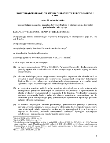 ROZPORZĄDZENIE (WE) NR 853/2004 PARLAMENTU EUROPEJSKIEGO I RADY z dnia 29 kwietnia 2004 r. ustanawiające szczególne przepisy dotyczące higieny w odniesieniu do żywności pochodzenia zwierzęcego PARLAMENT EUROPEJSKI I RADA UNII EUROPEJSKIEJ, uwzględniając Traktat ustanawiający Wspólnotę Europejską, w szczególności jego art. 152 ust. 4 lit. b), uwzględniając wniosek Komisji1, uwzględniając opinię Komitetu Ekonomiczno-Społecznego2, po konsultacji z Komitetem Regionów, stanowiąc zgodnie z procedurą ustanowioną w art. 251 Traktatu3, a także mając na uwadze, co następuje: (1) na mocy rozporządzenia (WE) nr 852/20024, Parlament Europejski i Rada ustanawiają przepisy ogólne dla przedsiębiorstw sektora spożywczego w sprawie higieny środków spożywczych; (2) niektóre środki spożywcze mogą stanowić szczególne zagrożenie dla zdrowia ludzi, w związku z czym konieczne jest ustanowienie szczególnych przepisów dotyczących higieny. Dotyczy to zwłaszcza żywności pochodzenia zwierzęcego, w przypadku której zgłaszano często przypadki zagrożeń mikrobiologicznych i chemicznych; (3) w kontekście wspólnej polityki rolnej przyjęto wiele dyrektyw w celu ustanowienia szczególnych przepisów sanitarnych w odniesieniu do produkcji i wprowadzania do obrotu produktów wymienionych w załączniku I do Traktatu. Przedmiotowe przepisy sanitarne ograniczyły bariery celne dla danych produktów, przyczyniając się do tworzenia rynku wewnętrznego, przy jednoczesnym zapewnieniu wysokiego poziomu ochrony zdrowia publicznego; (4) w zakresie dotyczącym zdrowia publicznego, przedmiotowe przepisy i procedury zawierają wspólne zasady, w szczególności w odniesieniu do obowiązków producentów oraz właściwych władz, wymogów strukturalnych, operacyjnych i tych dotyczących higieny w zakładach, procedur zatwierdzania zakładów, wymogów dotyczących składowania i transportu oraz znaków jakości zdrowotnej; 1 Dz.U. C 365 E z 19.12.2000, str. 58. Dz.U. C 155 z 29.05.2001, str. 39. 3 Opinia Parlamentu Europejskiego z dnia 15 maja 2002 r. (Dz.U. C 180 E z 31.7.2003, str. 288), Wspólne stanowisko Rady z dnia 27 października 2003 r. (Dz.U. C 48 E z 24.2.2004, str. 23), Stanowisko Parlamentu Europejskiego z dnia 30 marca 2004 r. (dotychczas nieopublikowane w Dzienniku Urzędowym) oraz decyzja Rady z dnia 16 kwietnia 2004 r. 4 Dz.U. L 226 z 25.06.2004, str. 22. 2 1 (5) zasady te stanowią wspólną podstawę dla higienicznej produkcji żywności pochodzenia zwierzęcego, umożliwiając tym samym uproszczenie obowiązujących dyrektyw; (6) wskazane jest dążenie do dalszego uproszczenia, przez stosowanie tych samych przepisów w każdym stosownym przypadku do wszystkich produktów pochodzenia zwierzęcego; (7) uproszczenie umożliwia także wymóg określony w rozporządzeniu (WE) nr 852/2004, zgodnie z którym przedsiębiorstwa sektora spożywczego, uczestniczące w jakimkolwiek etapie produkcji, przetwarzania i dystrybucji żywności po produkcji podstawowej i powiązanych działaniach, zobowiązane są opracować, wykonywać i utrzymywać procedury oparte na zasadach analizy zagrożeń i krytycznych punktach kontroli (HACCP); (8) wszystkie powyższe elementy razem uzasadniają przepracowanie szczególnych przepisów dotyczących higieny zawartych w obowiązujących dyrektywach; (9) podstawowymi celami przedmiotowego przetworzenia jest zapewnienie wysokiego poziomu ochrony konsumenta w odniesieniu do bezpieczeństwa żywności, zwłaszcza przez objęcie wszystkich przedsiębiorstw sektora spożywczego we Wspólnocie tymi samymi przepisami, oraz zapewnienie właściwego funkcjonowania rynku wewnętrznego produktów pochodzenia zwierzęcego, przyczyniając się tym samym do osiągnięcia celów wspólnej polityki rolnej; (10) konieczne jest utrzymanie oraz, w przypadkach wymaganych w celu ochrony konsumenta, zaostrzenie szczegółowych przepisów dotyczących higieny dla produktów pochodzenia zwierzęcego; (11) reguły wspólnotowe nie powinny mieć zastosowania do produkcji podstawowej na własny domowy użytek, do przyrządzania, obróbki lub składowania żywności w celu spożycia jej w domu. Ponadto, w przypadku bezpośrednich dostaw małych ilości podstawowych produktów lub niektórych rodzajów mięsa przez produkujące je przedsiębiorstwo sektora spożywczego do konsumenta końcowego lub do lokalnego zakładu detalicznego, zdrowie publiczne powinno podlegać ochronie prawa krajowego, w szczególności ze względu na bliskie relacje producenta i konsumenta; (12) wymogi rozporządzenia (WE) nr 852/2004 są w zasadzie wystarczające dla zapewnienia bezpieczeństwa żywności w zakładach prowadzących handel detaliczny związany z bezpośrednią sprzedażą lub dostawą żywności pochodzenia zwierzęcego konsumentowi końcowemu. Niniejsze rozporządzenie powinno w zasadzie mieć zastosowanie do działalności hurtowej (to znaczy, gdy zakład detaliczny prowadzi działalność ukierunkowaną na dostawę żywności pochodzenia zwierzęcego do innego zakładu). Niemniej jednak, z wyjątkiem szczególnych wymogów dotyczących temperatury, ustanowionych w niniejszym rozporządzeniu, wymogi rozporządzenia (WE) nr 852/2004 powinny być wystarczające dla działalności hurtowej polegającej wyłącznie na składowaniu lub transporcie; (13) Państwa Członkowskie powinny mieć swobodę w zakresie rozszerzania lub ograniczania zastosowania wymogów niniejszego rozporządzenia do handlu 2 detalicznego na mocy ich prawa krajowego. Niemniej jednak, mogą ograniczyć ich stosowanie wyłącznie w przypadku, gdy uznają, że wymogi rozporządzenia (WE) nr 852/2004 są wystarczające dla osiągnięcia celów w zakresie higieny żywności, oraz gdy dostawa żywności pochodzenia zwierzęcego przez zakład detaliczny do innego zakładu stanowi działalność marginalną, lokalną i ograniczoną. Dostawa taka powinna zatem stanowić małą część całej działalności zak