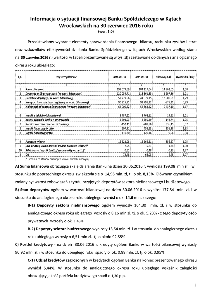 Informacja o sytuacji finansowej Banku Spółdzielczego w Kątach Wrocławskich na 30 czerwiec 2016 roku (wer. 1.0) Przedstawiamy wybrane elementy sprawozdania finansowego: bilansu, rachunku zysków i strat oraz wskaźników efektywności działania Banku Spółdzielczego w Kątach Wrocławskich według stanu na 30 czerwiec 2016 r. (wartości w tabeli prezentowane są w tys. zł) i zestawione do danych z analogicznego okresu roku ubiegłego: l.p. 1 Wyszczególnienie 2 1 2 3 4 5 Suma bilansowa Depozyty osób prywatnych ( w wart. bilansowej) Pozostałe depozyty ( w wart. bilansowej) Kredyty i inne należności ogółem ( w wart. bilansowej) Należności od sektora finansowego ( w wart. bilansowej) 6 1 7 2 8 Wynik z działalności bankowej Koszty działania Banku + amortyzacja Róznica wartości rezerw i aktualizacji Wynik finansowy brutto Wynik finansowy netto 9 1 10 2 Fundusze własne ROE brutto ( wynik brutto/ średnie fundusze własne)* ROA brutto ( wynik brutto/ średnie aktywa netto)* C/I * (średnia ze stanów dziennych w roku obrachunkowym) 2016-06-30 3 2015-06-30 Różnica (3-4) 4 5 Dynamika (3/4) 6 199 079,69 120 059,71 57 779,66 90 915,81 64 000,52 184 117,04 118 361,85 44 879,15 91 791,12 54 563,42 14 962,65 1 697,86 12 900,51 -875,31 9 437,10 1,08 1,01 1,29 0,99 1,17 3 787,62 2 793,03 -452,41 607,91 410,20 3 768,11 2 650,29 -788,86 456,63 420,16 19,51 142,74 336,45 151,28 -9,96 1,01 1,05 0,57 1,33 0,98 16 522,08 7,55 0,61 72,48 15 665,51 5,81 0,48 68,03 856,57 1,74 0,13 4,45 1,05 1,30 1,27 1,07 A) Suma bilansowa obrazująca skalę działania Banku na dzień 30.06.2016 r. wyniosła 199,08 mln zł. i w stosunku do poprzedniego okresu zwiększyła się o 14,96 mln. zł, tj. o ok. 8,13%. Głównym czynnikiem zmiany był wzrost zobowiązań z tytułu przyjętych depozytów sektora niefinansowego i budżetowego. B) Stan depozytów ogółem w wartości bilansowej na dzień 30.06.2016 r. wyniósł 177,84 mln. zł. i w stosunku do analogicznego okresu roku ubiegłego wzrósł o ok. 14,6 mln, z czego: B-1) Depozyty sektora niefinansowego ogółem wyniosły 164,30 mln. zł. i w stosunku do analogicznego okresu roku ubiegłego wzrosły o 8,16 mln zł. tj. o ok. 5,23% - z tego depozyty osób prywatnych wzrosły o ok. 1,43%. B-2) Depozyty sektora budżetowego wyniosły 13,54 mln. zł. i w stosunku do analogicznego okresu roku ubiegłego wzrosły o 6,51 mln zł. tj. o około 92,55% C) Portfel kredytowy - na dzień 30.06.2016 r. kredyty ogółem Banku w wartości bilansowej wyniosły 90,92 mln. zł. i w stosunku do ubiegłego roku spadły o ok. 0,88 mln. zł, tj. o ok. 0,95%. C-1) Udział kredytów zagrożonych w kredytach ogółem Banku na koniec prezentowanego okresu wyniósł 5,44%. W stosunku do analogicznego okresu roku ubiegłego wskaźnik zaległości obrazujący jakość portfela kredytowego spadł o 1,30 p.p. 1 C-2) Portfel papierów wartościowych – na dzień sprawozdawczy Bank posiadał w swoim portfelu dłużne papiery wartościowe o wartości 34 335,84 tys. złotych, w przeważającej części były to bony pieniężne NBP oraz obligacje skarbowe. C-3) Należności od sektora finansowego – Bank lokował w całości środki w Banku Zrzeszającym D) Wynik działalności bankowej wyniósł 3,79 mln. zł i był wyższy o 0,02 mln. zł od uzyskanego w analogicznym okresie ubiegłego roku. D-1) Wynik finansowy - na dzień 30 czerwiec 2016 roku Bank osiągnął zysk brutto w wysokości 0,61 mln. zł. Był on wyższy od osiągniętego przed rokiem o 0,15 mln. zł i stanowił ok. 133,13% wyniku osiągniętego przed rokiem. Natomiast zysk netto wyniósł 0,41 mln. zł i w porównaniu do analogicznego okresu roku ubiegłego spadł o 0,01 mln. zł, tj. o ok. 2,37%. E) Wskaźniki: ROA brutto, czyli zwrot z aktywów Banku wyniósł 0,61%, tj. ukształtował się na poziomie wyższym niż w poprzednim roku o ok. 0,13 p.p. , natomiast wskaźnik ROE brutto obrazujący stopę zwrotu z kapitałów własnych wyniósł 7,55%, podczas gdy przed rokiem stanowił 5,81%. Podstawowym czynnikiem mającym wpływ na zmianę było wykonanie wyniku finansowego na wielkość którego wpływ miała wycena aktywów nieregularnych a także wzrost skali działalności opisanej w części A) - B). F) Wskaźnik C/I, czyli relacja kosztów działania Banku z amortyzacją do wyniku na działalności bankowej skorygowanej o wynik na pozostałej działalności operacyjnej, na dzień 30.06.2016 r. wyniósł 72,48% i ukształtował się na poziomie wyższym niż przed rokiem o 4,45 p.p. G) Fundusze własne Banku na dzień 30.06.2016 r. ukształtowały się na poziomie 16,52 mln zł i zwiększyły się o 0,86 mln. w porównaniu do analogicznego okresu ubiegłego roku, tj. o ok. 5,47%. Na zmianę wysokości funduszy własnych miała wpływ wycena aktywów finansowych dostępnych do sprzedaży a także wyłączenia dotychczasowych pozycji funduszy związane z okresem przejściowym wynikającym z Rozporządzenia CRR. Fundusze Banku wyznaczane były w oparciu o Rozporządzenie Parlamentu Europejskiego i Rady (UE) nr 575/2013 z dnia 26 czerwca 2013 r. w sprawie wymogów ostrożnościowych dla instytucji kredytowych i firm inwestycyjnych i w pełni pokrywały wymogi kapitałowe na zidentyfikowane ryzyka istotne. Łączny współczynnik kapitałowy na dzień sprawozdawczy wyniósł 20,48% i w stosunku do poprzedniego roku wzrósł o 4,01 p.p. H) Bank Spółdzielczy w Kątach Wrocławskich na dzień 30 czerwiec 2016 r. zrzeszony był w Banku Polskiej Spółdzielczości SA w Warszawie oraz był uczestnikiem Systemu Ochrony Zrzeszenia BPS. Kąty Wrocławskie, dnia 18-07-2016 r. Sporządzono w Wydziale Finansowo Księgowym Centrali Banku 2