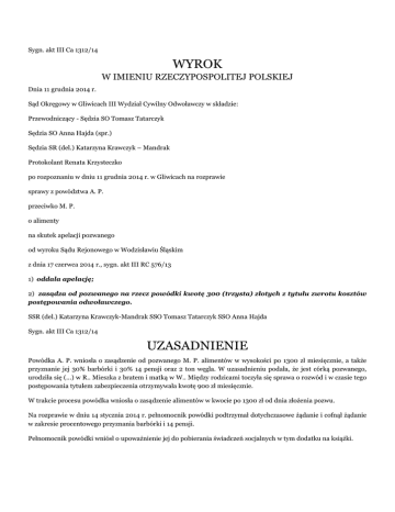 Sygn. akt III Ca 1312/14 WYROK W IMIENIU RZECZYPOSPOLITEJ POLSKIEJ Dnia 11 grudnia 2014 r. Sąd Okręgowy w Gliwicach III Wydział Cywilny Odwoławczy w składzie: Przewodniczący - Sędzia SO Tomasz Tatarczyk Sędzia SO Anna Hajda (spr.) Sędzia SR (del.) Katarzyna Krawczyk – Mandrak Protokolant Renata Krzysteczko po rozpoznaniu w dniu 11 grudnia 2014 r. w Gliwicach na rozprawie sprawy z powództwa A. P. przeciwko M. P. o alimenty na skutek apelacji pozwanego od wyroku Sądu Rejonowego w Wodzisławiu Śląskim z dnia 17 czerwca 2014 r., sygn. akt III RC 576/13 1) oddala apelację; 2) zasądza od pozwanego na rzecz powódki kwotę 300 (trzysta) złotych z tytułu zwrotu kosztów postępowania odwoławczego. SSR (del.) Katarzyna Krawczyk-Mandrak SSO Tomasz Tatarczyk SSO Anna Hajda Sygn. akt III Ca 1312/14 UZASADNIENIE Powódka A. P. wniosła o zasądzenie od pozwanego M. P. alimentów w wysokości po 1300 zł miesięcznie, a także przyznanie jej 30% barbórki i 30% 14 pensji oraz 2 ton węgla. W uzasadnieniu podała, że jest córką pozwanego, urodziła się (...) w R.. Mieszka z bratem i matką w W.. Między rodzicami toczyła się sprawa o rozwód i w czasie tego postępowania tytułem zabezpieczenia otrzymywała kwotę 900 zł miesięcznie. W trakcie procesu powódka wniosła o zasądzenie alimentów w kwocie po 1300 zł od dnia złożenia pozwu. Na rozprawie w dniu 14 stycznia 2014 r. pełnomocnik powódki podtrzymał dotychczasowe żądanie i cofnął żądanie w zakresie procentowego przyznania barbórki i 14 pensji. Pełnomocnik powódki wniósł o upoważnienie jej do pobierania świadczeń socjalnych w tym dodatku na książki. Pełnomocnik pozwanego uznał żądanie do kwoty po 800 zł miesięcznie, zgodził się na przyznanie powódce 2 ton węgla i cofnięcia powództwa w pozostałej części. Wyrokiem z dnia 17 czerwca 2014 roku Sąd Rejonowy w Wodzisławiu Śląskim w punkcie pierwszym zasądził od pozwanego na rzecz powódki alimenty w kwocie po 900,00 złotych miesięcznie za okres od dnia 1 października 2013 roku do dnia 31 maja 2014 roku, w punkcie drugim zasądzono od pozwanego na rzecz powódki alimenty w kwocie po 1.300,00 złotych miesięcznie, począwszy od dnia 1 czerwca 2014 roku do dnia 20-go każdego miesiąca z ustawowymi odsetkami w razie zwłoki w płatności którejkolwiek z rat. Punktem trzecim wyroku zobowiązano pozwanego do dostarczania 2 ton węgla rocznie na rzecz powódki w terminie do 15 lipca każdego roku, począwszy od 2014 roku, a punktem czwartym upoważniono powódkę do pobierania wszystkich świadczeń socjalnych przyznawanych pozwanemu przez pracodawcę na dziecko wraz z dodatkiem szkolnym na podręczniki. W pozostałej części powództwo zostało oddalone, nadto orzekł Sąd Rejonowy o kosztach procesu i nieuiszczonych kosztach sądowych, a także w przedmiocie rygoru natychmiastowej wykonalności. Podstawą tej treści rozstrzygnięcia były następujące ustalenia faktyczne poczynione przez Sąd Rejonowy. Wyrokiem Sądu Okręgowego w Gliwicach O/Z w R. z dnia 30 lipca 2013r. rozwiązano przez rozwód małżeństwo I. P. i pozwanego M. P. z winy obu stron. Wykonywanie władzy rodzicielskiej nad małoletnim synem Ł. P. ur. (...) powierzono matce, ograniczając władzę rodzicielską ojca do prawa współdecydowania o istotnych sprawach dziecka takich jak sposób leczenia, wybór szkoły i zawodu, a nadto ograniczając władzę rodzicielską stron poprzez poddanie jej wykonywania stałemu nadzorowi kuratora sądowego. Pozwanego zobowiązano do płacenia alimentów na rzecz syna w wysokości po 800 zł miesięcznie, a także dostarczania po 2 tony węgla rocznie, a nadto upoważniono matkę do pobierania wszelkich świadczeń socjalnych przyznawanych pozwanemu przez pracodawcę na dziecko wraz z dodatkiem szkolnym na podręczniki. W wyroku orzeczono eksmisję pozwanego z budynku mieszkalnego położonego w W. przy ulicy (...) z powodu stosowania przemocy w rodzinie. Powódka z bratem i z matką od sierpnia 2010 r. zamieszkała w rodzinnym domu matki (którego właścicielem była siostra powódki), który usytuowany był naprzeciw domu stron. Mieli do swojej dyspozycji jeden pokój na parterze budynku. W domu tym zamieszkiwali rodzice matki powódki, a także siostra matki z mężem i dzieckiem. Powódka była świadkiem nagannego zachowania wobec matki. Również wobec powódki pozwany zachowywał się w niedopuszczalny sposób. Powódka w reakcji na tę sytuację ujawniała skłonność do rozwijania symptomów somatycznych (bóle głowy, gardła, brzucha), wymagającej fachowej pomocy. Na wyżywienie powódki matka przeznaczała 600 zł miesięcznie. Zdarzało się, że powódka spożywała posiłki na mieście, na ubiór 200 zł, na leki (antydepresanty i przeciwkrwotoczne) – 100 zł, bilet miesięczny 40 zł, wycieczki, wyjścia szkolne ok. 50 zł, kino, basen ok. 100 zł miesięcznie. W czasie pożycia rodziców powódka pobierała korepetycje z języka angielskiego, które kosztowały 170 zł miesięcznie. Małoletni syn pozwanego Ł. miał 12 lat i koszty jego utrzymania oceniono na kwotę 1100 zł miesięcznie. Przy ustaleniu alimentów na rzecz syna pozwanego w wysokości po 800 zł miesięcznie Sąd miał na uwadze, że na pozwanym ciąży również obowiązek alimentacyjny wobec powódki jak również tą okoliczność, że wobec orzeczenia eksmisji pozwanego będzie on potrzebować środków na zapewnienie sobie warunków mieszkaniowych. Pozwany zarabiał ok. 4500 zł netto miesięcznie i otrzymywał liczne dodatki z tytułu pracy w kopalni. Uznać zatem należało, ze zasądzone alimenty leżą w zakresie jego możliwości zarobkowych, tym bardziej, że spłata kredytów zaciągnięty na remont samochodu, czy pieca nie może się odbywać kosztem nie zaspokojenia usprawiedliwionych potrzeb małoletniego dziecka. Pozwany zaciągając pożyczki winien był liczyć się ze spoczywającym na nim obowiązkiem alimentacyjnym
