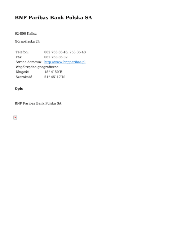 BNP Paribas Bank Polska SA 62-800 Kalisz Górnośląska 24 Telefon: 062 753 36 46, 753 36 48 Fax: 062 753 36 32 Strona domowa: http://www.bnpparibas.pl Współrzędne geograficzne: Długość 18° 4′ 50″E Szerokość 51° 45′ 17″N Opis BNP Paribas Bank Polska SA