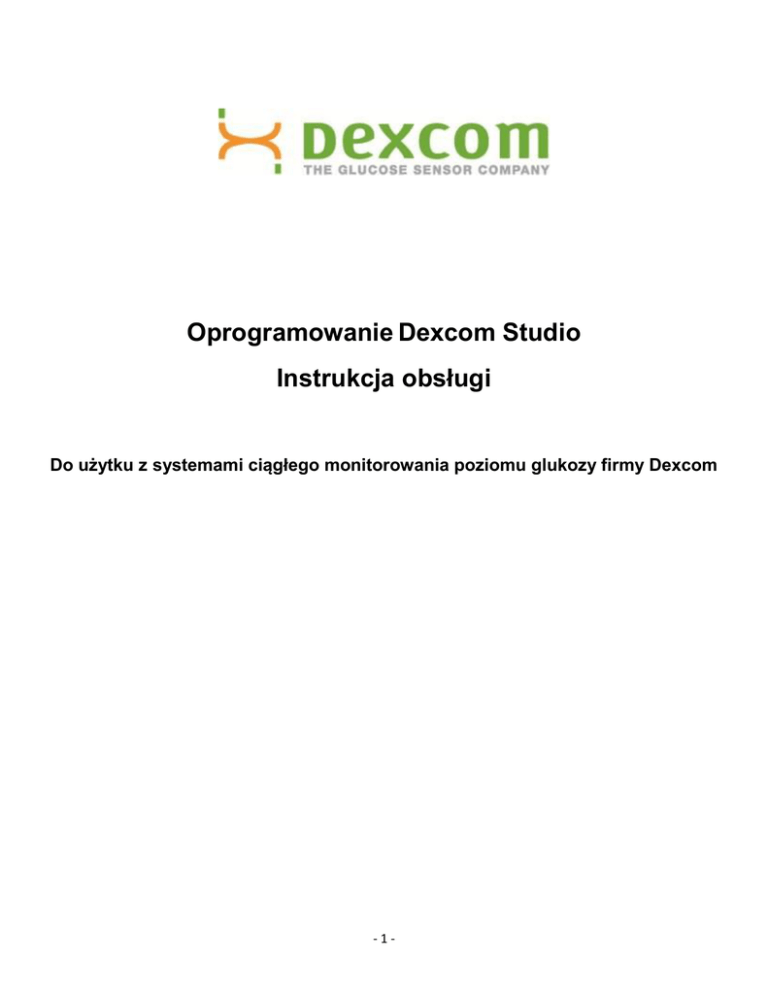 Oprogramowanie Dexcom Studio Instrukcja obsługi Do użytku z systemami ciągłego monitorowania poziomu glukozy firmy Dexcom -1- Spis treści 1 OGÓLNE INFORMACJE O OPROGRAMOWANIU DEXCOM STUDIO DATA MANAGER ...... 4 1.1 KONTAKT Z POMOCĄ TECHNICZNĄ FIRMY DEXCOM, INC. ........................................................... 4 1.2 ZGODNOŚĆ SYSTEMU I MINIMALNE WYMAGANIA SYSTEMOWE.................................................... 5 1.3 WAŻNE INFORMACJE, Z KTÓRYMI NALEŻY SIĘ ZAPOZNAĆ PRZED ROZPOCZĘCIEM KORZYSTANIA Z OPROGRAMOWANIA ..................................................................................................... 6 1.4 INSTALOWANIE OPROGRAMOWANIA DEXCOM STUDIO ............................................................. 7 1.5 PIERWSZE URUCHOMIENIE OPROGRAMOWANIA ...................................................................... 7 2 OPROGRAMOWANIE DEXCOM STUDIO – PODSTAWOWE INFORMACJE DOT. NAWIGACJI .................................................................................................................... 8 2.1 2.2 2.3 2.4 2.5 3 POBIERANIE DANYCH Z ODBIORNIKA DEXCOM .............................................................. 9 3.1 3.2 4 URUCHAMIANIE OPROGRAMOWANIA................................................................................... 8 PASEK MENU ................................................................................................................. 8 PASEK ZAKŁADEK ............................................................................................................ 8 OKNA PODRĘCZNE........................................................................................................... 9 ZAMYKANIE OPROGRAMOWANIA ........................................................................................ 9 PODŁĄCZANIE ODBIORNIKA DEXCOM DO KOMPUTERA .............................................................. 9 PRZYPISYWANIE POBRANYCH DANYCH DO BAZY DANYCH PACJENTA ............................................ 10 WYKRESY/RAPORTY ..................................................................................................... 10 4.1 4.2 4.3 4.4 4.5 4.6 4.7 4.8 4.9 4.10 4.11 4.12 ZMIANA BIEŻĄCEGO PACJENTA ......................................................................................... 11 PRZEGLĄDANIE, DRUKOWANIE I ZAPISYWANIE WYKRESÓW/RAPORTÓW ...................................... 11 ZAKŁADKA WZORCÓW .................................................................................................... 12 ZAKŁADKA RAPORTU SUKCESU .......................................................................................... 13 GLUCOSE TREND TAB (ZAKŁADKA TRENDÓW POZIOMU GLUKOZY) ............................................. 14 HOURLY STATS TAB (ZAKŁADKA STATYSTYK GODZINOWYCH).................................................... 15 DAILY TRENDS TAB (ZAKŁADNA TRENDÓW DZIENNYCH) .......................................................... 16 DISTRIBUTION TAB (ZAKŁADKA ROZKŁADU) ......................................................................... 17 DAILY STATS TAB (ZAKŁADKA STATYSTYK DZIENNYCH) ............................................................ 17 A1C RECORDS TAB (ZAKŁADKA WYNIKÓW A1C)................................................................... 18 WŁASNE USTAWIENIA WYKRESÓW/RAPORTÓW .................................................................... 18 SZYBKI DRUK ............................................................................................................... 20 -2- 5 ZARZĄDZANIE PACJENTAMI ......................................................................................... 20 5.1 5.2 5.3 5.4 5.5 5.6 5.7 5.8 6 OPCJE ........................................................................................................................... 23 6.1 6.2 6.3 6.4 6.5 6.6 6.7 6.8 6.9 7 ZEROWANIE BAZY DANYCH ODBIORNIKA DEXCOM ................................................................. 27 AKTYWACJA FUNKCJI KLINICZNYCH .................................................................................... 27 UKRYWANIE I ODKRYWANIE DANYCH NA WYŚWIETLACZU ODBIORNIKA ....................................... 28 WYŚWIETLANIE UKRYTYCH DANYCH NA WYKRESACH/RAPORTACH OPROGRAMOWANIA .................. 28 IMPORTOWANIE BAZY DANYCH PACJENTÓW DM3 DO OPROGRAMOWANIA DEXCOM STUDIO .......... 28 INSTALOWANIE STEROWNIKA ODBIORNIKA .......................................................................... 28 POMOC ........................................................................................................................ 29 8.1 8.2 8.3 9 GLUCOSE DISPLAY UNITS (JEDNOSTKI WYŚWIETLANIA POZIOMU GLUKOZY).................................. 23 PATIENT DATA EXPORT (EKSPORTOWANIE DANYCH PACJENTÓW).............................................. 23 D EFAULT CHART/REPORT (DOMYŚLNY WYKRES/RAPORT) ...................................................... 24 QUICK PRINT CONFIGURATION (KONFIGURACJA SZYBKIEGO DRUKU) .......................................... 24 HEALTH CARE PROFESSIONALS (PRACOWNICY OPIEKI ZDROWOTNEJ).......................................... 24 PATIENT DISPLAY (WYŚWIETLANIE PACJENTA)...................................................................... 24 GLUCOSE RANGE LISTS (LISTY ZAKRESÓW POZIOMU GLUKOZY) ................................................. 25 APPLICATION APPEARANCE (WYGLĄD APLIKACJI).................................................................. 26 MANAGE OPTIONS AND SETTINGS (ZARZĄDZANIE OPCJAMI I USTAWIENIAMI) .............................. 26 NARZĘDZIA................................................................................................................... 27 7.1 7.2 7.3 7.4 7.5 7.6 8 ORGANIZOWANIE I SORTOWANIE LISTY PACJENTÓW............................................................... 20 WYBIERANIE BIEŻĄCEGO PACJENTA .................................................................................... 21 EDYTOWANIE DANYCH PAC