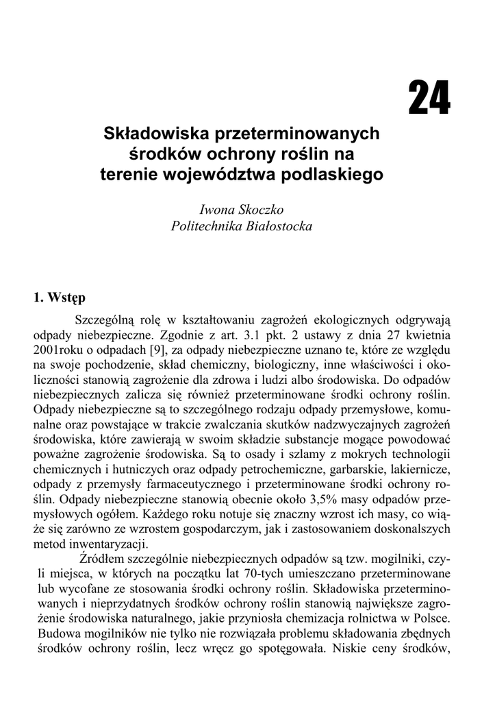 Składowiska przeterminowanych środków ochrony roślin na terenie województwa podlaskiego 24 Iwona Skoczko Politechnika Białostocka 1. Wstęp Szczególną rolę w kształtowaniu zagroŜeń ekologicznych odgrywają odpady niebezpieczne. Zgodnie z art. 3.1 pkt. 2 ustawy z dnia 27 kwietnia 2001roku o odpadach [9], za odpady niebezpieczne uznano te, które ze względu na swoje pochodzenie, skład chemiczny, biologiczny, inne właściwości i okoliczności stanowią zagroŜenie dla zdrowa i ludzi albo środowiska. Do odpadów niebezpiecznych zalicza się równieŜ przeterminowane środki ochrony roślin. Odpady niebezpieczne są to szczególnego rodzaju odpady przemysłowe, komunalne oraz powstające w trakcie zwalczania skutków nadzwyczajnych zagroŜeń środowiska, które zawierają w swoim składzie substancje mogące powodować powaŜne zagroŜenie środowiska. Są to osady i szlamy z mokrych technologii chemicznych i hutniczych oraz odpady petrochemiczne, garbarskie, lakiernicze, odpady z przemysły farmaceutycznego i przeterminowane środki ochrony roślin. Odpady niebezpieczne stanowią obecnie około 3,5% masy odpadów przemysłowych ogółem. KaŜdego roku notuje się znaczny wzrost ich masy, co wiąŜe się zarówno ze wzrostem gospodarczym, jak i zastosowaniem doskonalszych metod inwentaryzacji. Źródłem szczególnie niebezpiecznych odpadów są tzw. mogilniki, czyli miejsca, w których na początku lat 70-tych umieszczano przeterminowane lub wycofane ze stosowania środki ochrony roślin. Składowiska przeterminowanych i nieprzydatnych środków ochrony roślin stanowią największe zagroŜenie środowiska naturalnego, jakie przyniosła chemizacja rolnictwa w Polsce. Budowa mogilników nie tylko nie rozwiązała problemu składowania zbędnych środków ochrony roślin, lecz wręcz go spotęgowała. Niskie ceny środków, Iwona Skoczko centralna ich dystrybucja, nie uwzględniająca lokalnych potrzeb oraz brak elastyczności w gospodarce środkami ochrony roślin doprowadziły do ciągłego gromadzenia się przeterminowanych i nieprzydatnych rolniczo preparatów. Po wypełnieniu mogilników nieraz kontynuowano ich składowanie tuŜ obok w miejscach do tego nie przygotowanych i nie odpowiadających podstawowym warunkom bezpieczeństwa. Z biegiem czasu narosło zagroŜenie zarówno ze strony niewłaściwych miejsc składowania, jak i samych mogilników. Błędy w konstrukcji, nie zawsze właściwe materiały budowlane ulegające korozji oraz długotrwała erozja, doprowadziły do rozszczelniania niektórych mogilników i emisji składowanych środków do środowiska. Szacuje się, Ŝe łączna ilość substancji trujących złoŜonych w tych mogilnikach wynosi około 10 tys. ton róŜnego rodzaju środków, w tym: Chemikalia – około 165 ton, • Trucizny – około 25 ton, • Środki szkodliwe – około 40 ton, Środki ochrony roślin – około 2360 ton i około 2800m3, Chemikalia, łącznie ze środkami ochrony roślin – około 500 ton, Opakowania – około 130 ton i około 140.000 szt. i około 1200 m3. Podane wartości są przybliŜone, z uwagi na brak pełnej dokumentacji mogilników. Szacuje się, Ŝe jeszcze blisko 800 „nieoficjalnych” dołów gromadzi co najmniej 12 tys. ton substancji niebezpiecznych. Nie podejmowano próby dokładnego określenia ilości i składu „zawartości” wszystkich mogilników [1]. NajwaŜniejsza jest jednak nie ilość trucizn, ale to, jak zostały zabezpieczone. Z dotychczasowych pobieŜnych i wyrywkowych kontroli wynika, Ŝe najgorzej jest na wschodzie Polski, w dawnym województwie białostockim. W latach 1998÷1999 organy Inspekcji przeprowadziły 108 kontroli omawianych obiektów, zakończonych wydaniem zarządzeń pokontrolnych. Dotyczyły one m.in.: uporządkowania terenu mogilników (wykoszenie traw, uzupełnienie ogrodzenia i oznakowania), wykonania ekspertyzy technicznej ich szczelności oraz przeprowadzenia badań wód gruntowych z piezometrów. Dotychczasowe prace wykazują konieczność sukcesywnej likwidacji wszystkich mogilników. W pierwszej kolejności powinny ulec unieszkodliwieniu mogilniki zlokalizowane nad zbiornikami wód podziemnych i w pobliŜu jakichkolwiek wód powierzchniowych, jak równieŜ pól uprawnych. Ze zgromadzonych przez PIOŚ danych wynika, Ŝe ponad sto z oficjalnie zarejestrowanych znajduje się w odległości mniejszej niŜ 1 km od ujęć wody pitnej, 75 - w pobliŜu rzek i jezior, a 138 niedaleko od zabudowy mieszkaniowej. Powstały one w latach 60 i 70., kiedy zaczęto masowo wycofywać szkodliwe pestycydy - głównie DDT (1973 rok), jako składowiska tymczasowe, prowizoryczne, bez wcześniejszego rozeznania warunków hydrogeologicznych, bez badań podłoŜa geologicznego. 510 Środkowo-Pomorskie Towarzystwo Naukowe Ochrony Środowiska Składowiska przeterminowanych środków ochrony roślin ... Połowa z nich nie ma jakiejkolwiek dokumentacji. Dziś nie da się nawet powiedzieć, co jeszcze zawierają poza przeterminowanymi środkami ochrony roślin. Najgorzej jest w byłym województwie szczecińskim, gdzie większość składowisk znajduje się na terenach zagroŜonych i nawiedzanych przez powodzie (dane Instytutu Ochrony Roślin w Poznaniu). W byłym województwie gdańskim, ze względu na niebezpieczeństwo katastrofy ekologicznej, mają zostać zlikwidowane toksyczne zbiorniki pod Wejherowem. Inspektorat zajął się składowiskami, poniewaŜ nikt ich nie pilnuje, a stan techniczny obiektów moŜe doprowadzić do katastrofy ekologicznej. Na przykład w okolicach Cieszyna składowiska zawierające metale cięŜkie nie mają dna. W byłym województwie kieleckim pestycydy leŜą niejednokrotnie w odsłoniętych dołach ziemnych nie przysypanych nawet ziemią [8]. Fot. 1. Odsłonięte pestycydy w mogilniku w Miławce, pow. kielecki Photo 1. Exposed pesticides in burial in Miławka, Kielce district W 1999 roku organy Inspekcji przeprowadziły aktualizację rejestru mogilników. Na d