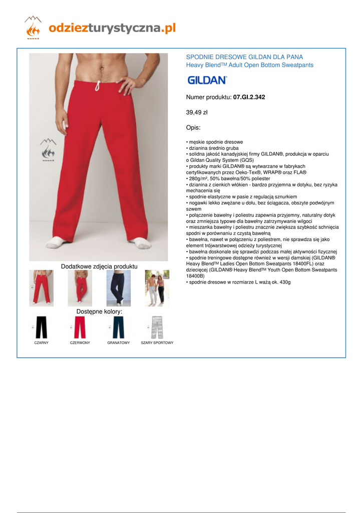 SPODNIE DRESOWE GILDAN DLA PANA Heavy Blend™ Adult Open Bottom Sweatpants Numer produktu: 07.GI.2.342 39,49 zł Opis: • męskie spodnie dresowe • dzianina średnio gruba • solidna jakość kanadyjskiej firmy GILDAN®, produkcja w oparciu o Gildan Quality System (GQS) • produkty marki GILDAN® są wytwarzane w fabrykach certyfikowanych przez Oeko-Tex®, WRAP® oraz FLA® • 280g/m², 50% bawełna/50% poliester • dzianina z cienkich włókien - bardzo przyjemna w dotyku, bez ryzyka mechacenia się • spodnie elastyczne w pasie z regulacją sznurkiem • nogawki lekko zwężane u dołu, bez ściągacza, obszyte podwójnym szwem • połączenie bawełny i poliestru zapewnia przyjemny, naturalny dotyk oraz zmniejsza typowe dla bawełny zatrzymywanie wilgoci • mieszanka bawełny i poliestru znacznie zwiększa szybkość schnięcia spodni w porównaniu z czystą bawełną • bawełna, nawet w połączeniu z poliestrem, nie sprawdza się jako element trójwarstwowej odzieży turystycznej • bawełna doskonale się sprawdzi podczas małej aktywności fizycznej • spodnie treningowe dostępne również w wersji damskiej (GILDAN® Heavy Blend™ Ladies Open Bottom Sweatpants 18400FL) oraz dziecięcej (GILDAN® Heavy Blend™ Youth Open Bottom Sweatpants 18400B) • spodnie dresowe w rozmiarze L ważą ok. 430g Dodatkowe zdjęcia produktu Dostępne kolory: CZARNY Powered by TCPDF (www.tcpdf.org) CZERWONY GRANATOWY SZARY SPORTOWY