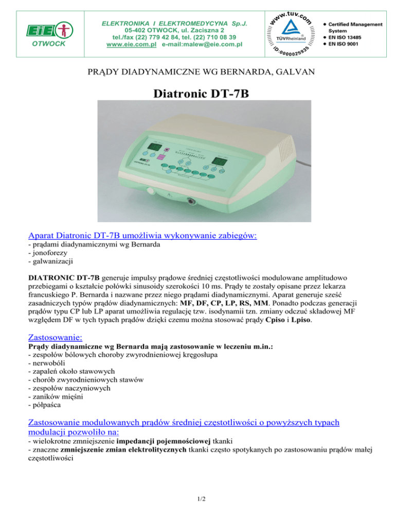 OTWOCK ELEKTRONIKA I ELEKTROMEDYCYNA Sp.J. 05-402 OTWOCK, ul. Zaciszna 2 tel./fax (22) 779 42 84, tel. (22) 710 08 39 www.eie.com.pl e-mail:[email protected] PRĄDY DIADYNAMICZNE WG BERNARDA, GALVAN Diatronic DT-7B Aparat Diatronic DT-7B umoŜliwia wykonywanie zabiegów: - prądami diadynamicznymi wg Bernarda - jonoforezy - galwanizacji DIATRONIC DT-7B generuje impulsy prądowe średniej częstotliwości modulowane amplitudowo przebiegami o kształcie połówki sinusoidy szerokości 10 ms. Prądy te zostały opisane przez lekarza francuskiego P. Bernarda i nazwane przez niego prądami diadynamicznymi. Aparat generuje sześć zasadniczych typów prądów diadynamicznych: MF, DF, CP, LP, RS, MM. Ponadto podczas generacji prądów typu CP lub LP aparat umoŜliwia regulację tzw. isodynamii tzn. zmiany odczuć składowej MF względem DF w tych typach prądów dzięki czemu moŜna stosować prądy Cpiso i Lpiso. Zastosowanie: Prądy diadynamiczne wg Bernarda mają zastosowanie w leczeniu m.in.: - zespołów bólowych choroby zwyrodnieniowej kręgosłupa - nerwobóli - zapaleń około stawowych - chorób zwyrodnieniowych stawów - zespołów naczyniowych - zaników mięśni - półpaśca Zastosowanie modulowanych prądów średniej częstotliwości o powyŜszych typach modulacji pozwoliło na: - wielokrotne zmniejszenie impedancji pojemnościowej tkanki - znaczne zmniejszenie zmian elektrolitycznych tkanki często spotykanych po zastosowaniu prądów małej częstotliwości 1/2 Jonoforezą (lub jontoforezą) nazywa się zabieg elektroleczniczy polegający na wprowadzeniu do tkanek za pomocą prądu stałego jonów działających leczniczo. Zabieg ten stosuje się w leczeniu stanów zapalnych, zespołów bólowych, nerwobóli, utrudnionych zrostów kostnych, owrzodzeniach. Galwanizacja jest to zabieg elektroleczniczy polegający na przepływie prądu stałego przez części ciała chorego poddawane leczeniu. Zabieg ten stosuje się przy nerwobólach, polineuropatiach, zespołach bólowych choroby zwyrodnieniowej kręgosłupa, zaburzeniach krąŜenia obwodowego, utrudnionych zrostach kostnych. Dane aparatu: natęŜenie prądu: - prąd średni dla DF - prąd średni dla MF 0-26 mA 0-13 mA zmiana natęŜenia prądu MF przy isodynamii 75-100% prąd galwaniczny 0-20 mA wymiary aparatu 290 x 108 x 200 mm masa aparatu 2.5 kg WyposaŜenie dostarczane standardowo z aparatem: - 2 x elektroda silikonowa E-S 50 - 2 x podkład wiskozowy P-50 - 2 x elektroda aluminiowa E-A 75 - 2 x podkład wiskozowy P-75 - 2 x elektroda aluminiowa E-A 10 - 2 x podkład wiskozowy P-10 - 1 x przewód do podłączenia elektrod K-2L - 1 x przewód do elektrod specjalnych K-J - 1 x opaska O-R1 rozmiar (50x500mm) - 1 x opaska O-R2 rozmiar (50x800mm) - 1 x taśma aluminiowa TA-0,5 - 1 x bezpiecznik T-0.315A - 1 x instrukcja uŜytkowania. 2/2