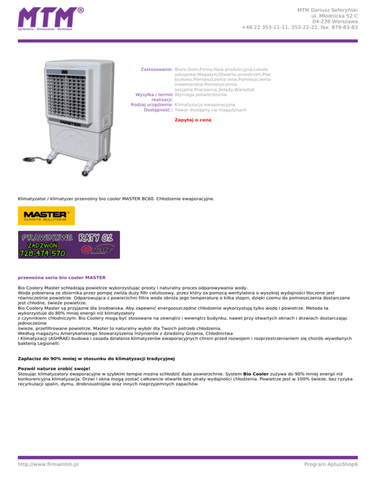 MTM Dariusz Seferyński ul. Młodnicka 52 C 04-239 Warszawa +48 22 353-11-11, 353-22-22, fax. 879-83-83 Zastosowanie: Biuro,Dom,Firma,Hala produkcyjna,Lokale usługowe,Magazyn,Otwarta przestrzeń,Plac budowy,Pomieszczenia inne,Pomieszczenia inwentarskie,Pomieszczenia socjalne,Pracownia,Składy,Warsztat Wysyłka / termin Wymaga potwierdzenia realizacji: Rodzaj urządzenia: Klimatyzacja ewaporacyjna Dostępność:: Towar dostępny na magazynach Zapytaj o cenę Klimatyzator / klimatyzer przenośny bio cooler MASTER BC60. Chłodzenie ewaporacyjne. przenośna seria bio cooler MASTER Bio Coolery Master schładzają powietrze wykorzystując prosty i naturalny proces odparowywania wody. Woda pobierana ze zbiornika przez pompę zwilża duży filtr celulozowy, przez który za pomocą wentylatora o wysokiej wydajności tłoczone jest równocześnie powietrze. Odparowująca z powierzchni filtra woda obniża jego temperaturę o kilka stopni, dzięki czemu do pomieszczenia dostarczane jest chłodne, świeże powietrze. Bio Coolery Master są przyjazne dla środowiska. Aby zapewnić energooszczędne chłodzenie wykorzystują tylko wodę i powietrze. Metoda ta wykorzystuje do 80% mniej energii niż klimatyzatory z czynnikiem chłodniczym. Bio Coolery mogą być stosowane na zewnątrz i wewnątrz budynku, nawet przy otwartych oknach i drzwiach dostarczając jednocześnie świeże, przefiltrowane powietrze. Master to naturalny wybór dla Twoich potrzeb chłodzenia. Według magazynu Amerykańskiego Stowarzyszenia Inżynierów z dziedziny Grzania, Chłodnictwa i Klimatyzacji (ASHRAE) budowa i zasada działania klimatyzerów ewaporacyjnych chroni przed rozwojem i rozprzestrzenianiem się chorób wywołanych bakterią Legionelli. Zapłacisz do 90% mniej w stosunku do klimatyzacji tradycyjnej Pozwól naturze zrobić swoje! Stosując klimatyzatory ewaporacyjne w szybkim tempie można schłodzić duże powierzchnie. System Bio Cooler zużywa do 90% mniej energii niż konkurencyjna klimatyzacja. Drzwi i okna mogą zostać całkowicie otwarte bez utraty wydajności chłodzenia. Powietrze jest w 100% świeże, bez ryzyka recyrkulacji spalin, dymu, drobnoustrojów oraz innych nieprzyjemnych zapachów. http://www.firmamtm.pl Program AptusShop6 MTM Dariusz Seferyński ul. Młodnicka 52 C 04-239 Warszawa +48 22 353-11-11, 353-22-22, fax. 879-83-83 Zalety klimatyzera mobilnego Bio Cooler BC60: Koła ułatwiające transport Tryb automatycznej zmiany pozycji łopatek Nie wymagają instalacji Przyjazne dla środowiska: brak kompresora oraz czynnika chłodniczego Niskie zużycie energii Oczyszczają powietrze z dymu, kurzu oraz nieprzyjemnych zapachów Pilot zdalnego sterowania Jonizator Możliwość stosowania środków zapachowych Automatyczny dopływ wody Dane techniczne Model Maksymalny przepływ powietrza Wydajność chłodzenia Zużycie energii Zużycie wody http://www.firmamtm.pl Bio Cooler BC60 6000 m3/h 6 kW 0,280 kW 7 l/h max Program AptusShop6 MTM Dariusz Seferyński ul. Młodnicka 52 C 04-239 Warszawa +48 22 353-11-11, 353-22-22, fax. 879-83-83 Prędkości wentylatora Powierzchnia chłodząca System wodny Wymiary (szer. x gł. x wys.) Waga netto (pusty / z wodą) Przeznaczony do schłodzenia powierzchni Poziom hałasu Przyłącze wody http://www.firmamtm.pl Powered by TCPDF (www.tcpdf.org) 3 50 dm3 pojemność zbiornika 57 litrów 560 x 780 x 1380mm 35 / 92 kg 60 m2 62 dB(A) tak, 1/2" Program AptusShop6