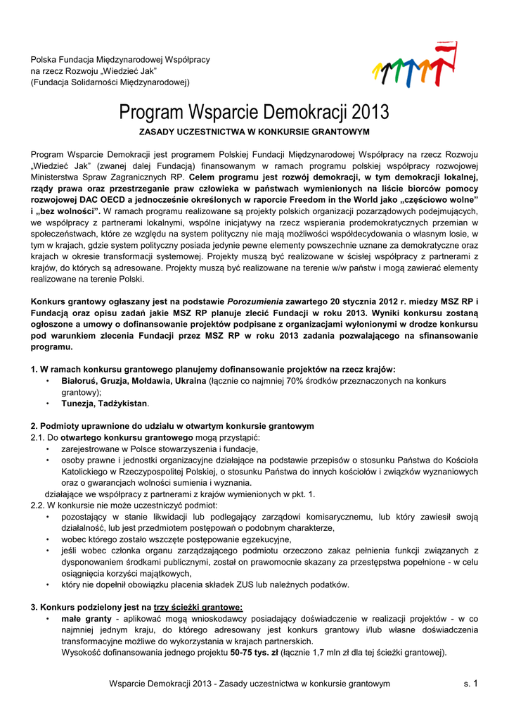 Polska Fundacja Międzynarodowej Współpracy na rzecz Rozwoju „Wiedzieć Jak” (Fundacja Solidarności Międzynarodowej) Program Wsparcie Demokracji 2013 ZASADY UCZESTNICTWA W KONKURSIE GRANTOWYM Program Wsparcie Demokracji jest programem Polskiej Fundacji Międzynarodowej Współpracy na rzecz Rozwoju „Wiedzieć Jak” (zwanej dalej Fundacją) finansowanym w ramach programu polskiej współpracy rozwojowej Ministerstwa Spraw Zagranicznych RP. Celem programu jest rozwój demokracji, w tym demokracji lokalnej, rządy prawa oraz przestrzeganie praw człowieka w państwach wymienionych na liście biorców pomocy rozwojowej DAC OECD a jednocześnie określonych w raporcie Freedom in the World jako „częściowo wolne” i „bez wolności”. W ramach programu realizowane są projekty polskich organizacji pozarządowych podejmujących, we współpracy z partnerami lokalnymi, wspólne inicjatywy na rzecz wspierania prodemokratycznych przemian w społeczeństwach, które ze względu na system polityczny nie mają możliwości współdecydowania o własnym losie, w tym w krajach, gdzie system polityczny posiada jedynie pewne elementy powszechnie uznane za demokratyczne oraz krajach w okresie transformacji systemowej. Projekty muszą być realizowane w ścisłej współpracy z partnerami z krajów, do których są adresowane. Projekty muszą być realizowane na terenie w/w państw i mogą zawierać elementy realizowane na terenie Polski. Konkurs grantowy ogłaszany jest na podstawie Porozumienia zawartego 20 stycznia 2012 r. miedzy MSZ RP i Fundacją oraz opisu zadań jakie MSZ RP planuje zlecić Fundacji w roku 2013. Wyniki konkursu zostaną ogłoszone a umowy o dofinansowanie projektów podpisane z organizacjami wyłonionymi w drodze konkursu pod warunkiem zlecenia Fundacji przez MSZ RP w roku 2013 zadania pozwalającego na sfinansowanie programu. 1. W ramach konkursu grantowego planujemy dofinansowanie projektów na rzecz krajów: • Białoruś, Gruzja, Mołdawia, Ukraina (łącznie co najmniej 70% środków przeznaczonych na konkurs grantowy); • Tunezja, Tadżykistan. 2. Podmioty uprawnione do udziału w otwartym konkursie grantowym 2.1. Do otwartego konkursu grantowego mogą przystąpić: • zarejestrowane w Polsce stowarzyszenia i fundacje, • osoby prawne i jednostki organizacyjne działające na podstawie przepisów o stosunku Państwa do Kościoła Katolickiego w Rzeczypospolitej Polskiej, o stosunku Państwa do innych kościołów i związków wyznaniowych oraz o gwarancjach wolności sumienia i wyznania. działające we współpracy z partnerami z krajów wymienionych w pkt. 1. 2.2. W konkursie nie może uczestniczyć podmiot: • pozostający w stanie likwidacji lub podlegający zarządowi komisarycznemu, lub który zawiesił swoją działalność, lub jest przedmiotem postępowań o podobnym charakterze, • wobec którego zostało wszczęte postępowanie egzekucyjne, • jeśli wobec członka organu zarządzającego podmiotu orzeczono zakaz pełnienia funkcji związanych z dysponowaniem środkami publicznymi, został on prawomocnie skazany za przestępstwa popełnione - w celu osiągnięcia korzyści majątkowych, • który nie dopełnił obowiązku płacenia składek ZUS lub należnych podatków. 3. Konkurs podzielony jest na trzy ścieżki grantowe: • małe granty - aplikować mogą wnioskodawcy posiadający doświadczenie w realizacji projektów - w co najmniej jednym kraju, do którego adresowany jest konkurs grantowy i/lub własne doświadczenia transformacyjne możliwe do wykorzystania w krajach partnerskich. Wysokość dofinansowania jednego projektu 50-75 tys. zł (łącznie 1,7 mln zł dla tej ścieżki grantowej). Wsparcie Demokracji 2013 - Zasady uczestnictwa w konkursie grantowym s. 1 Termin składania wniosków – 2 stycznia 2013 r. Decyduje data zarejestrowania w elektronicznym generatorze wniosków oraz data nadania pocztą wersji papierowej zgłoszenia. • duże granty - aplikować mogą wnioskodawcy mający doświadczenie w realizacji projektów w co najmniej jednym kraju, do którego adresowany jest konkurs grantowy a jednocześnie mający w okresie 2010-2012 doświadczenie w gospodarowaniu polskimi środkami publicznymi w kwocie nie mniejszej niż 100 tys. zł w skali jednego wybranego roku kalendarzowego; Wysokość dofinansowania 100-350 tys. zł (łącznie 5,02 mln zł dla tej ścieżki grantowej); Termin składania wniosków – 2 stycznia 2013 r. Decyduje data zarejestrowania w elektronicznym generatorze wniosków oraz data nadania pocztą wersji papierowej zgłoszenia. • projekty modułowe – w ramach tej ścieżki grantowej przewidziana jest możliwość ubiegania się o dofinansowanie projektów składających się z dwóch niezależnych i realizowanych sekwencyjnie modułów w latach 2013-2014. Moduł przeznaczony do realizacji w roku 2013 będzie dofinansowany w ramach programu Wsparcie Demokracji 2013. Drugi moduł będzie realizowany na podstawie umowy dofinansowania zawartej w roku budżetowym 2014 pod warunkiem prawidłowej, terminowej i zgodnej z umową realizacji pierwszego modułu projektu a jednocześnie zleceniu Fundacji przez MSZ w roku 2014 zadania pozwalającego na sfinansowanie projektu. W ramach ścieżki projekty modułowe aplikować mogą wnioskodawcy mający co najmniej trzyletnie doświadczenie w realizacji projektów w co najmniej jednym kraju, do którego adresowany jest konkurs grantowy, a jednocześnie w okresie 2010-2012 mający doświadczenie w gospodarowaniu polskimi środkami publicznymi w kwocie nie mniejszej niż 100 tys. zł w skali jednego wybranego roku kalendarzowego potwierdzone zaakceptowanym rozliczeniem z wykorzystanych środków. Wysokość dofinansowania jednego projektu 100-250 tys. w roku 2013 (łączna pula środków: 1,6 mln zł dla tej ścieżki grantowej) i 100-300 tys. zł w roku 2014; Termin składania wniosków – 28 lutego 2013 r. Decyduje data zarejestrowania w elektronicznym generato
