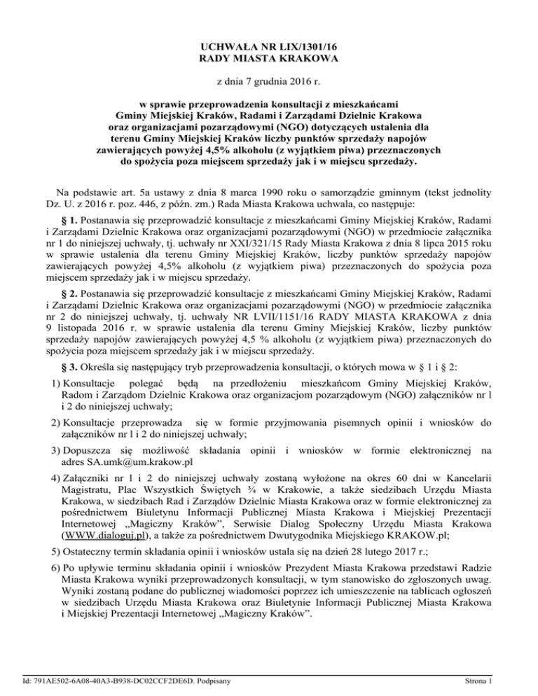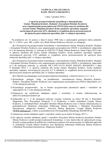UCHWAŁA NR LIX/1301/16 RADY MIASTA KRAKOWA z dnia 7 grudnia 2016 r. w sprawie przeprowadzenia konsultacji z mieszkańcami Gminy Miejskiej Kraków, Radami i Zarządami Dzielnic Krakowa oraz organizacjami pozarządowymi (NGO) dotyczących ustalenia dla terenu Gminy Miejskiej Kraków liczby punktów sprzedaży napojów zawierających powyżej 4,5% alkoholu (z wyjątkiem piwa) przeznaczonych do spożycia poza miejscem sprzedaży jak i w miejscu sprzedaży. Na podstawie art. 5a ustawy z dnia 8 marca 1990 roku o samorządzie gminnym (tekst jednolity Dz. U. z 2016 r. poz. 446, z późn. zm.) Rada Miasta Krakowa uchwala, co następuje: § 1. Postanawia się przeprowadzić konsultacje z mieszkańcami Gminy Miejskiej Kraków, Radami i Zarządami Dzielnic Krakowa oraz organizacjami pozarządowymi (NGO) w przedmiocie załącznika nr 1 do niniejszej uchwały, tj. uchwały nr XXI/321/15 Rady Miasta Krakowa z dnia 8 lipca 2015 roku w sprawie ustalenia dla terenu Gminy Miejskiej Kraków, liczby punktów sprzedaży napojów zawierających powyżej 4,5% alkoholu (z wyjątkiem piwa) przeznaczonych do spożycia poza miejscem sprzedaży jak i w miejscu sprzedaży. § 2. Postanawia się przeprowadzić konsultacje z mieszkańcami Gminy Miejskiej Kraków, Radami i Zarządami Dzielnic Krakowa oraz organizacjami pozarządowymi (NGO) w przedmiocie załącznika nr 2 do niniejszej uchwały, tj. uchwały NR LVII/1151/16 RADY MIASTA KRAKOWA z dnia 9 listopada 2016 r. w sprawie ustalenia dla terenu Gminy Miejskiej Kraków, liczby punktów sprzedaży napojów zawierających powyżej 4,5 % alkoholu (z wyjątkiem piwa) przeznaczonych do spożycia poza miejscem sprzedaży jak i w miejscu sprzedaży. § 3. Określa się następujący tryb przeprowadzenia konsultacji, o których mowa w § 1 i § 2: 1) Konsultacje polegać będą na przedłożeniu mieszkańcom Gminy Miejskiej Kraków, Radom i Zarządom Dzielnic Krakowa oraz organizacjom pozarządowym (NGO) załączników nr l i 2 do niniejszej uchwały; 2) Konsultacje przeprowadza się w formie przyjmowania pisemnych opinii i wniosków do załączników nr l i 2 do niniejszej uchwały; 3) Dopuszcza się możliwość składania opinii i wniosków w formie elektronicznej na adres [email protected] 4) Załączniki nr l i 2 do niniejszej uchwały zostaną wyłożone na okres 60 dni w Kancelarii Magistratu, Plac Wszystkich Świętych ¾ w Krakowie, a także siedzibach Urzędu Miasta Krakowa, w siedzibach Rad i Zarządów Dzielnic Miasta Krakowa oraz w formie elektronicznej za pośrednictwem Biuletynu Informacji Publicznej Miasta Krakowa i Miejskiej Prezentacji Internetowej „Magiczny Kraków”, Serwisie Dialog Społeczny Urzędu Miasta Krakowa (WWW.dialoguj.pl), a także za pośrednictwem Dwutygodnika Miejskiego KRAKOW.pl; 5) Ostateczny termin składania opinii i wniosków ustala się na dzień 28 lutego 2017 r.; 6) Po upływie terminu składania opinii i wniosków Prezydent Miasta Krakowa przedstawi Radzie Miasta Krakowa wyniki przeprowadzonych konsultacji, w tym stanowisko do zgłoszonych uwag. Wyniki zostaną podane do publicznej wiadomości poprzez ich umieszczenie na tablicach ogłoszeń w siedzibach Urzędu Miasta Krakowa oraz Biuletynie Informacji Publicznej Miasta Krakowa i Miejskiej Prezentacji Internetowej „Magiczny Kraków”. Id: 791AE502-6A08-40A3-B938-DC02CCF2DE6D. Podpisany Strona 1 § 4. Wykonanie uchwały powierza się Prezydentowi Miasta Krakowa. § 5. Uchwała wchodzi w życie z dniem podjęcia. Wiceprzewodniczący Rady Miasta Krakowa Dominik Jaśkowiec Id: 791AE502-6A08-40A3-B938-DC02CCF2DE6D. Podpisany Strona 2