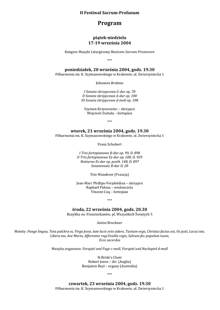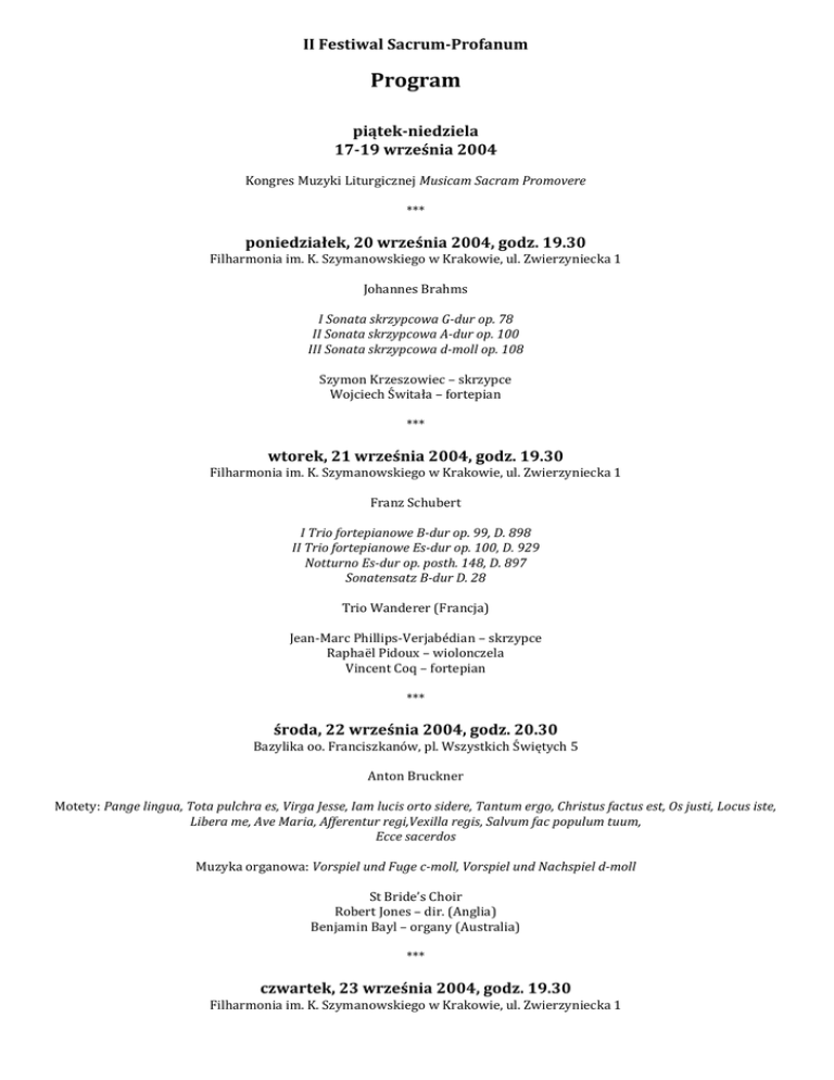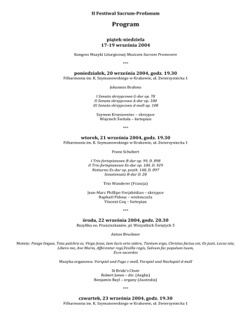 II Festiwal Sacrum-Profanum Program piątek-niedziela 17-19 września 2004 Kongres Muzyki Liturgicznej Musicam Sacram Promovere *** poniedziałek, 20 września 2004, godz. 19.30 Filharmonia im. K. Szymanowskiego w Krakowie, ul. Zwierzyniecka 1 Johannes Brahms I Sonata skrzypcowa G-dur op. 78 II Sonata skrzypcowa A-dur op. 100 III Sonata skrzypcowa d-moll op. 108 Szymon Krzeszowiec – skrzypce Wojciech Świtała – fortepian *** wtorek, 21 września 2004, godz. 19.30 Filharmonia im. K. Szymanowskiego w Krakowie, ul. Zwierzyniecka 1 Franz Schubert I Trio fortepianowe B-dur op. 99, D. 898 II Trio fortepianowe Es-dur op. 100, D. 929 Notturno Es-dur op. posth. 148, D. 897 Sonatensatz B-dur D. 28 Trio Wanderer (Francja) Jean-Marc Phillips-Verjabédian – skrzypce Raphaël Pidoux – wiolonczela Vincent Coq – fortepian *** środa, 22 września 2004, godz. 20.30 Bazylika oo. Franciszkanów, pl. Wszystkich Świętych 5 Anton Bruckner Motety: Pange lingua, Tota pulchra es, Virga Jesse, Iam lucis orto sidere, Tantum ergo, Christus factus est, Os justi, Locus iste, Libera me, Ave Maria, Afferentur regi,Vexilla regis, Salvum fac populum tuum, Ecce sacerdos Muzyka organowa: Vorspiel und Fuge c-moll, Vorspiel und Nachspiel d-moll St Bride’s Choir Robert Jones – dir. (Anglia) Benjamin Bayl – organy (Australia) *** czwartek, 23 września 2004, godz. 19.30 Filharmonia im. K. Szymanowskiego w Krakowie, ul. Zwierzyniecka 1 Joseph Haydn Symfonia D-dur „Salomonowa” Hob. I/104 Koncert wiolonczelowy C-dur Hob. VIIb/1 Symfonia G-dur „Oksfordzka” Hob. I/92 Taipei Philharmonic Orchestra Paul Tien-Chi Lin - dir. (Tajwan) Felix Fan – wiolonczela (USA) *** piątek-niedziela 24-26 września 2004, godz. 21.00 Hala walcowni Ispat Polska Stal Oddział w Krakowie, Ujastek 1 Wolfgang Amadeusz Mozart Requiem Iwona Hossa – sopran Edyta Piasecka* – sopran Anna Lubańska – alt Elżbieta Janus* – alt Adam Zdunikowski – tenor Jarosław Bręk – bas Orkiestra i Chór Filharmonii im. K. Szymanowskiego w Krakowie Tomasz Bugaj – dir. reżyseria, scenografia: Maciej Sobociński aranżacja przestrzeni: Piotr Chuchacz, Benedykt Bury, Rafał Chowaniec (K3 - pracownia projektowa) realizacja światła: Grzegorz Barszczewski *obsada koncertu w dn. 24 września