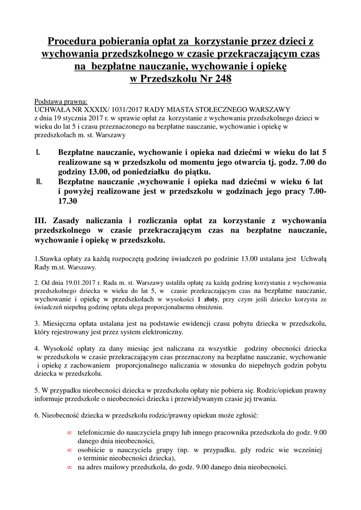 Procedura pobierania opłat za korzystanie przez dzieci z wychowania przedszkolnego w czasie przekraczającym czas na bezpłatne nauczanie, wychowanie i opiekę w Przedszkolu Nr 248 Podstawa prawna: UCHWAŁA NR XXXIX/ 1031/2017 RADY MIASTA STOŁECZNEGO WARSZAWY z dnia 19 stycznia 2017 r. w sprawie opłat za korzystanie z wychowania przedszkolnego dzieci w wieku do lat 5 i czasu przeznaczonego na bezpłatne nauczanie, wychowanie i opiekę w przedszkolach m. st. Warszawy I. II. Bezpłatne nauczanie, wychowanie i opieka nad dziećmi w wieku do lat 5 realizowane są w przedszkolu od momentu jego otwarcia tj. godz. 7.00 do godziny 13.00, od poniedziałku do piątku. Bezpłatne nauczanie ,wychowanie i opieka nad dziećmi w wieku 6 lat i powyżej realizowane jest w przedszkolu w godzinach jego pracy 7.0017.30 III. Zasady naliczania i rozliczania opłat za korzystanie z wychowania przedszkolnego w czasie przekraczającym czas na bezpłatne nauczanie, wychowanie i opiekę w przedszkolu. 1.Stawka opłaty za każdą rozpoczętą godzinę świadczeń po godzinie 13.00 ustalana jest Uchwałą Rady m.st. Warszawy. 2. Od dnia 19.01.2017 r. Rada m. st. Warszawy ustaliła opłatę za każdą godzinę korzystania z wychowania przedszkolnego dziecka w wieku do lat 5, w czasie przekraczającym czas na bezpłatne nauczanie, wychowanie i opiekę w przedszkolach w wysokości 1 złoty, przy czym jeśli dziecko korzysta ze świadczeń niepełną godzinę opłata ulega proporcjonalnemu obniżeniu. 3. Miesięczna opłata ustalana jest na podstawie ewidencji czasu pobytu dziecka w przedszkolu, który rejestrowany jest przez system elektroniczny. 4. Wysokość opłaty za dany miesiąc jest naliczana za wszystkie godziny obecności dziecka w przedszkolu w czasie przekraczającym czas przeznaczony na bezpłatne nauczanie, wychowanie i opiekę z zachowaniem proporcjonalnego naliczania w stosunku do niepełnych godzin pobytu dziecka w przedszkolu. 5. W przypadku nieobecności dziecka w przedszkolu opłaty nie pobiera się. Rodzic/opiekun prawny informuje przedszkole o nieobecności dziecka i przewidywanym czasie jej trwania. 6. Nieobecność dziecka w przedszkolu rodzic/prawny opiekun może zgłosić: • • • telefonicznie do nauczyciela grupy lub innego pracownika przedszkola do godz. 9.00 danego dnia nieobecności, osobiście u nauczyciela grupy (np. w przypadku, gdy rodzic wie wcześniej o terminie nieobecności dziecka), na adres mailowy przedszkola, do godz. 9.00 danego dnia nieobecności. 7. Opłatę za korzystanie z wychowania przedszkolnego w czasie przekraczającym czas na bezpłatne nauczanie, wychowanie i opiekę, wnosi się w okresach miesięcznych, w terminie do 10 dnia miesiąca następującego po miesiącu, którego opłata dotyczy – opłata pobierana jest „z dołu” (za miesiąc wrzesień rodzic/prawny opiekun dokonuje wpłaty w październiku). 8. Opłatę wnosi się w formie gotówkowej w wyznaczonym terminie u kierownika gospodarczego w przedszkolu lub dokonuje się wpłaty na podane przez kierownika gospodarczego konto bankowe należące do przedszkola. III. Zasady udzielania zwolnienia i ulgi w opłatach za korzystanie z wychowania przedszkolnego w czasie przekraczającym czas na bezpłatne nauczanie, wychowanie i opiekę. 1. Zwalnia się z opłaty za korzystanie z wychowania przedszkolnego w czasie przekraczającym czas na bezpłatne nauczanie, wychowanie i opiekę: a) wychowanka rodzinnego domu dziecka działającego na terenie m.st. Warszawy, wychowanka placówki opiekuńczo-wychowawczej typu rodzinnego prowadzonej na terenie m.st. Warszawy oraz dziecko umieszczone w rodzinie zastępczej zamieszkującej na terenie m.st. Warszawy; b) jeżeli dochód na osobę w rodzinie dziecka, ustalony zgodnie z ustawą z dnia 12 marca 2004 r. o pomocy społecznej (Dz.U. z 2016 poz.930,1583,1948,2174) nie przekracza 75% minimalnego wynagrodzenia za pracę ustalonego na podstawie ustawy z dnia 10 października 2002 r. o minimalnym wynagrodzeniu za pracę (Dz. U. z 2015 r, poz.2008 oraz z 2016r.,poz.1265), zwanego dalej „minimalnym wynagrodzeniem"; c) dziecko posiadające orzeczenie o potrzebie kształcenia specjalnego, o którym mowa w art. 71b ust. 3 ustawy o systemie oświaty. 2.Obniża się do wysokości 50% opłatę za korzystanie z wychowania przedszkolnego w czasie przekraczającym czas na bezpłatne nauczanie, wychowanie i opiekę, jeżeli dochód na osobę w rodzinie dziecka przekracza 75%, lecz nie przekracza 100% minimalnego wynagrodzenia. 3. Jeżeli do przedszkola uczęszcza dziecko: a) którego rodzeństwo uczęszcza do żłobka lub klubu dziecięcego wpisanego do rejestru żłobków i klubów dziecięcych prowadzonego przez Prezydenta m.st. Warszawy, dziennego opiekuna wpisanego do wykazu dziennych opiekunów prowadzonego przez Prezydenta m.st. Warszawy lub do przedszkola publicznego lub niepublicznego prowadzonego na terenie m.st. Warszawy, publicznego lub niepublicznego punktu przedszkolnego lub zespołu wychowania przedszkolnego prowadzonego na terenie m.st. Warszawy; b) znajdujące się pod opieką opiekuna prawnego sprawującego jednocześnie opiekę nad przynajmniej dwojgiem dzieci uczęszczających do przedszkoli, innych form wychowania przedszkolnego lub form opieki nad dziećmi do lat 3, o których mowa w pkt 3a.wysokość opłaty za korzystanie z wychowania przedszkolnego przez to dziecko wynosi 75% opłaty. 4. W razie zbiegu tytułów uprawniających do częściowego zwolnienia z opłat określonych w pkt. 2 lub 3 , przysługuje tylko jedno zwolnienie wybrane przez rodzica . 5. Wniosek o obniżenie lub zwolnienie z opłaty za korzystanie z wychowania przedszkolnego w czasie przekraczającym czas na bezpłatne nauczanie, wychowanie i opiekę rodzice /prawni opiekunowie dziecka uczęszczającego do przedszkola składają do dyrektora przedszkola lub osoby przez niego wyznaczonej do dnia 10 każdego miesiąca. IV. Dokumenty wymagane do uzyskania obniżenia lub zwolnienia z opłaty: 