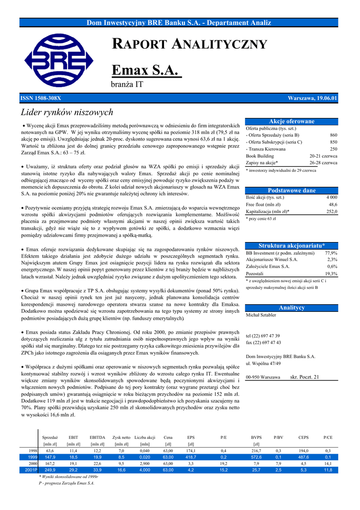 Dom Inwestycyjny BRE Banku S.A. - Departament Analiz RAPORT ANALITYCZNY Emax S.A. branża IT ISSN 1508-308X Warszawa, 19.06.01 Lider rynków niszowych • Wycenę akcji Emax przeprowadziliśmy metodą porównawczą w odniesieniu do firm integratorskich notowanych na GPW. W jej wyniku otrzymaliśmy wycenę spółki na poziomie 318 mln zł (79,5 zł na akcję po emisji). Uwzględniając jednak 20-proc. dyskonto sugerowana cena wynosi 63,6 zł na 1 akcję. Wartość ta zbliżona jest do dolnej granicy przedziału cenowego zaproponowanego wstępnie przez Zarząd Emax S.A.: 63 – 75 zł. • Uważamy, iż struktura oferty oraz podział głosów na WZA spółki po emisji i sprzedaży akcji stanowią istotne ryzyko dla nabywających walory Emax. Sprzedaż akcji po cenie nominalnej odbiegającej znacząco od wyceny spółki oraz ceny emisyjnej powoduje ryzyko zwiększenia podaży w momencie ich dopuszczenia do obrotu. Z kolei udział nowych akcjonariuszy w głosach na WZA Emax S.A. na poziomie poniżej 20% nie gwarantuje należytej ochrony ich interesów. • Pozytywnie oceniamy przyjętą strategię rozwoju Emax S.A. zmierzającą do wsparcia wewnętrznego wzrostu spółki akwizycjami podmiotów oferujących rozwiązania komplementarne. Możliwość płacenia za przejmowane podmioty własnymi akcjami w naszej opinii zwiększa wartość takich transakcji, gdyż nie wiąże się to z wypływem gotówki ze spółki, a dodatkowo wzmacnia więzi pomiędzy udziałowcami firmy przejmowanej a spółką-matką. • Emax oferuje rozwiązania dedykowane skupiając się na zagospodarowaniu rynków niszowych. Efektem takiego działania jest zdobycie dużego udziału w poszczególnych segmentach rynku. Największym atutem Grupy Emax jest osiagnięcie pozycji lidera na rynku rozwiązań dla sektora energetycznego. W naszej opinii popyt generowany przez klientów z tej branży będzie w najbliższych latach wzrastał. Należy jednak uwzględniać ryzyko związane z dużym upolitycznieniem tego sektora. • Grupa Emax współpracuje z TP S.A. obsługując systemy wysyłki dokumentów (ponad 50% rynku). Chociaż w naszej opinii rynek ten jest już nasycony, jednak planowana konsolidacja centrów korespondencji masowej narodowego operatora stwarza szanse na nowe kontrakty dla Emaksa. Dodatkowo można spodziewać się wzrostu zapotrzebowania na tego typu systemy ze strony innych podmiotów posiadających dużą grupę klientów (np. funduszy emerytalnych). • Emax posiada status Zakładu Pracy Chronionej. Od roku 2000, po zmianie przepisów prawnych dotyczących rozliczania ulg z tytułu zatrudniania osób niepełnosprawnych jego wpływ na wyniki spółki stał się marginalny. Dlatego tez nie postrzegamy ryzyka całkowitego zniesienia przywilejów dla ZPCh jako istotnego zagrożenia dla osiąganych przez Emax wyników finansowych. • Współpraca z dużymi spółkami oraz operowanie w niszowych segmentach rynku pozwalają spółce kontynuować stabilny rozwój i wzrost wyników zbliżony do wzrostu całego rynku IT. Ewentualne większe zmiany wyników skonsolidowanych spowodowane będą poczynionymi akwizycjami i włączeniem nowych podmiotów. Podpisane do tej pory kontrakty (oraz wygrane przetargi choć bez podpisanych umów) gwarantują osiągnięcie w roku bieżącym przychodów na poziomie 152 mln zł. Dodatkowe 119 mln zł jest w trakcie negocjacji i prawdopodopbieństwo ich pozyskania szacujemy na 70%. Plany spółki przewidują uzyskanie 250 mln zł skonsolidowanych przychodów oraz zysku netto w wysokości 16,6 mln zł. Sprzedaż EBIT EBITDA [mln zł] [mln zł] [mln zł] Zysk netto Liczba akcji [mln zł] [mln] Cena EPS [zł] [zł] P/E Akcje oferowane Oferta publiczna (tys. szt.) - Oferta Sprzedaży (seria B) - Oferta Subskrypcji (seria C) - Transza Kierowana Book Building Zapisy na akcje* 860 850 250 20-21 czerwca 26-28 czerwca * inwestorzy indywidualni do 29 czerwca Podstawowe dane Ilość akcji (tys. szt.) 4 000 Free float (mln zł) Kapitalizacja (mln zł)* 48,6 252,0 * przy cenie 63 zł Struktura akcjonariatu* BB Investment (z podm. zależnymi) Akcjonariusze Winuel S.A. Założyciele Emax S.A. 77,9% 2,3% 0,6% Pozostali 19,3% * z uwzględnieniem nowej emisji akcji serii C i sprzedaży maksymalnej ilości akcji serii B Analitycy Michał Sztabler tel (22) 697 47 39 fax (22) 697 47 43 Dom Inwestycyjny BRE Banku S.A. ul. Wspólna 47/49 00-950 Warszawa BVPS P/BV skr. Poczt. 21 CEPS P/CE [zł] 1998 63,6 11,4 12,2 7,0 0,040 63,00 174,1 0,4 216,7 0,3 194,0 0,3 1999 147,9 18,5 19,9 8,5 0,020 63,00 418,7 0,2 572,6 0,1 487,6 0,1 2000 167,2 19,1 22,6 9,5 2,900 63,00 3,3 19,2 7,9 7,9 4,5 14,1 2001P 249,9 29,2 33,9 16,6 4,000 63,00 4,2 15,2 25,7 2,5 5,3 11,8 * Wyniki skonsolidowane od 1999r P - prognoza Zarządu Emax S.A. Dom Inwestycyjny BRE Banku S.A. I. Emax Emax – przedmiot działalności Firma Emax powstała jako spółka z o.o. w marcu 1988r. Założycielami były 4 osoby fizyczne: W. Dziewolski, P. Kardach, P. Rozwadowski oraz P. Turno. Pod koniec 2000r podjęto decyzję o przekształceniu w spółkę akcyjną. Spółka zajmuje się dostawą kompleksowych rozwiązań informatycznych i integracją systemów komputerowych. Głównymi klientami Emaksu są podmioty z sektora bankowego, jednostki służby zdrowia oraz duże przedsiębiorstwa infrastrukturalne (przede wszystkim z branży energetycznej). Według rankingu Computerworld Top 200 (edycja 2001) spółka znalazła się wśród 50 największych firm informatycznych działających w 2000r na polskim rynku. W porównaniu do integratorów notowanych na GPW uzyskane w ubiegłym roku przychody pozwoliły jej zająć 6. pozycję. Obecnie w skład Grupy Kapitałowej Emax oprócz spółki-matki wchodzą trzy firmy informatyczne: Winuel, Max Elektronik oraz Bi.com. Wiąże się to z realizacją strategii spółki zmierzającej do wsparcia rozwoju Emaksa poprzez akwizycje innych firm z branży. II. Wycena Wycenę spółki Emax przeprowadziliśmy w oparciu o met