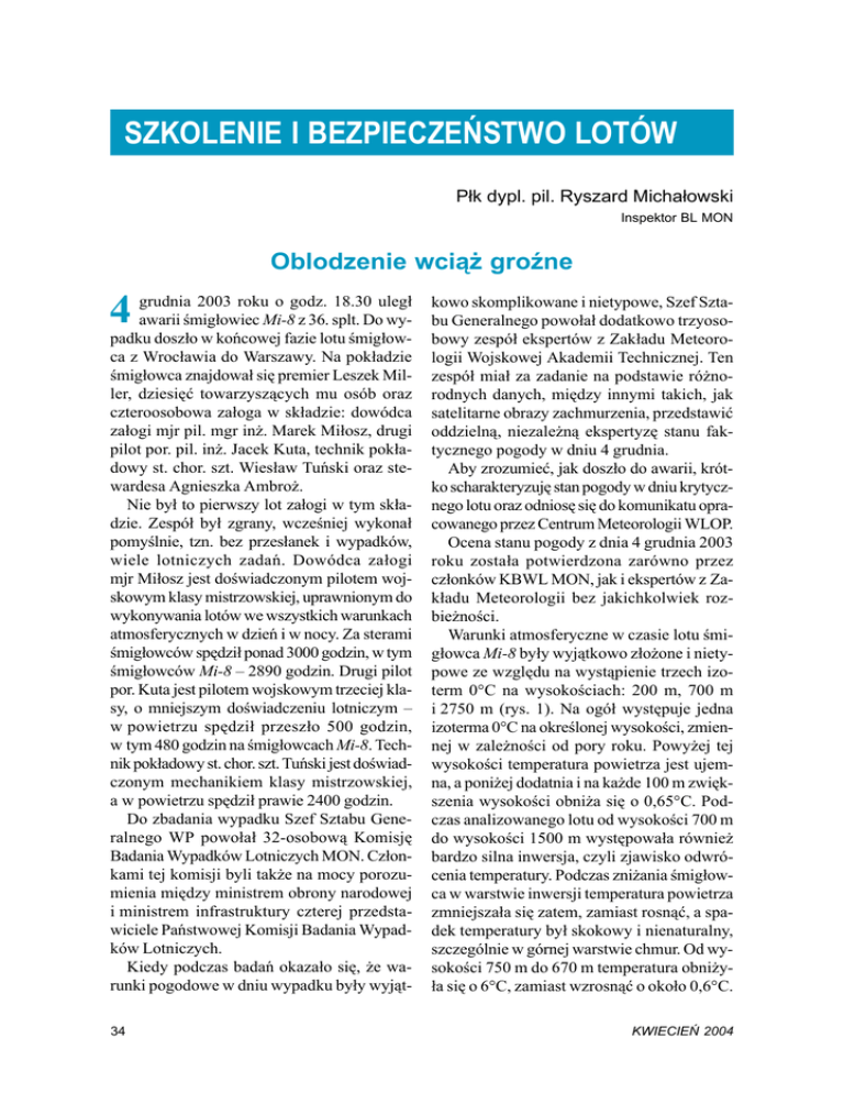 SZKOLENIE I BEZPIECZEŃSTWO LOTÓW Płk dypl. pil. Ryszard Michałowski Inspektor BL MON Oblodzenie wciąż groźne 4 grudnia 2003 roku o godz. 18.30 uległ awarii śmigłowiec Mi-8 z 36. splt. Do wypadku doszło w końcowej fazie lotu śmigłowca z Wrocławia do Warszawy. Na pokładzie śmigłowca znajdował się premier Leszek Miller, dziesięć towarzyszących mu osób oraz czteroosobowa załoga w składzie: dowódca załogi mjr pil. mgr inż. Marek Miłosz, drugi pilot por. pil. inż. Jacek Kuta, technik pokładowy st. chor. szt. Wiesław Tuński oraz stewardesa Agnieszka Ambroż. Nie był to pierwszy lot załogi w tym składzie. Zespół był zgrany, wcześniej wykonał pomyślnie, tzn. bez przesłanek i wypadków, wiele lotniczych zadań. Dowódca załogi mjr Miłosz jest doświadczonym pilotem wojskowym klasy mistrzowskiej, uprawnionym do wykonywania lotów we wszystkich warunkach atmosferycznych w dzień i w nocy. Za sterami śmigłowców spędził ponad 3000 godzin, w tym śmigłowców Mi-8 – 2890 godzin. Drugi pilot por. Kuta jest pilotem wojskowym trzeciej klasy, o mniejszym doświadczeniu lotniczym – w powietrzu spędził przeszło 500 godzin, w tym 480 godzin na śmigłowcach Mi-8. Technik pokładowy st. chor. szt. Tuński jest doświadczonym mechanikiem klasy mistrzowskiej, a w powietrzu spędził prawie 2400 godzin. Do zbadania wypadku Szef Sztabu Generalnego WP powołał 32-osobową Komisję Badania Wypadków Lotniczych MON. Członkami tej komisji byli także na mocy porozumienia między ministrem obrony narodowej i ministrem infrastruktury czterej przedstawiciele Państwowej Komisji Badania Wypadków Lotniczych. Kiedy podczas badań okazało się, że warunki pogodowe w dniu wypadku były wyjąt34 kowo skomplikowane i nietypowe, Szef Sztabu Generalnego powołał dodatkowo trzyosobowy zespół ekspertów z Zakładu Meteorologii Wojskowej Akademii Technicznej. Ten zespół miał za zadanie na podstawie różnorodnych danych, między innymi takich, jak satelitarne obrazy zachmurzenia, przedstawić oddzielną, niezależną ekspertyzę stanu faktycznego pogody w dniu 4 grudnia. Aby zrozumieć, jak doszło do awarii, krótko scharakteryzuję stan pogody w dniu krytycznego lotu oraz odniosę się do komunikatu opracowanego przez Centrum Meteorologii WLOP. Ocena stanu pogody z dnia 4 grudnia 2003 roku została potwierdzona zarówno przez członków KBWL MON, jak i ekspertów z Zakładu Meteorologii bez jakichkolwiek rozbieżności. Warunki atmosferyczne w czasie lotu śmigłowca Mi-8 były wyjątkowo złożone i nietypowe ze względu na wystąpienie trzech izoterm 0°C na wysokościach: 200 m, 700 m i 2750 m (rys. 1). Na ogół występuje jedna izoterma 0°C na określonej wysokości, zmiennej w zależności od pory roku. Powyżej tej wysokości temperatura powietrza jest ujemna, a poniżej dodatnia i na każde 100 m zwiększenia wysokości obniża się o 0,65°C. Podczas analizowanego lotu od wysokości 700 m do wysokości 1500 m występowała również bardzo silna inwersja, czyli zjawisko odwrócenia temperatury. Podczas zniżania śmigłowca w warstwie inwersji temperatura powietrza zmniejszała się zatem, zamiast rosnąć, a spadek temperatury był skokowy i nienaturalny, szczególnie w górnej warstwie chmur. Od wysokości 750 m do 670 m temperatura obniżyła się o 6°C, zamiast wzrosnąć o około 0,6°C. KWIECIEŃ 2004 Komunikat meteorologiczny opracowany przez Centrum Meteorologiczne WLOP na czas przelotu śmigłowca był nieprecyzyjny i nie zawierał informacji o możliwości wystąpienia słabego oblodzenia ani informacji o wystąpieniu izotermy 0°C na wysokości 700 m. Meteorolodzy z WLOP nie przewidzieli nietypowego gwałtownego spadku temperatury w warstwie chmur od wysokości 750 m do 670 m, wyeksponowali natomiast występowanie takich niebezpiecznych zjawisk pogody, jak niskie podstawy chmur, słaba widzialność z powodu silnego zamglenia, opady mżawki na przeważającym obszarze kraju. Tak opracowany komunikat meteorologiczny zafałszował obraz pogody, która faktycznie była inna. Załoga, bazując na tym komunikacie, nie korzystała z innych informacji, np. dostarczanych przez cywilne stacje meteorologiczne. Zgodnie z procedurami załogi wojskowych statków powietrznych wykonujące loty z VIP-mi na pokładzie mają obowią- zek, niezależnie od lotniska startu, wykorzystywania wyłącznie komunikatów opracowanych przez dyżurnych synoptyków z Centrum Meteorologicznego WLOP. Załoga wystartowała z lotniska we Wrocławiu o godz. 17.03. Przed startem nie włączyła instalacji przeciwoblodzeniowej ogrzewania wlotów silników na zakres pracy „RĘCZNY”, tylko pozostawiła przełączniki w położeniu pracy automatycznej. Pozostawienie przełączników w takim położeniu oznacza, że instalacja przeciwoblodzeniowa włącza się automatycznie w momencie, kiedy nastąpi oblodzenie sygnalizatora RIO-3, umieszczonego we wlocie do wentylatora (podgrzewany jest tylko prawy silnik). Pomimo mało precyzyjnego komunikatu meteorologicznego załoga była zobligowana do włączenia podgrzewów silników podczas startu i lądowania na zakres „RĘCZNY” (wówczas podgrzewane byłyby wloty dwóch silników), ponieważ temperatura na lotnisku Trasa przelotu śmigłowca Mi-8 w dniu 4 grudnia 2003 roku (godz. 17.03 - 18.30 LMT) Przegląd WLOP 35 startu wynosiła +4°C, prognozowana zaś na lotnisku Warszawa Okęcie +1°C. W instrukcji techniki pilotowania śmigłowca Mi-8 istnieje zapis, w którym stwierdza się, że przełączniki podgrzewów wlotów silników należy włączyć na zakres „RĘCZNY”, gdy temperatura powietrza wynosi +5°C i mniej, przy czym nie wyjaśnia się sensu fizycznego takiego postępowania. Fakt braku tego wyjaśnienia zaważył na działaniu załogi: podczas startu świadomie podjęła ona nieracjonalną decyzję o niewłączeniu instalacji na zakres pracy „RĘCZNY”. Ponieważ wloty silników ogrzewane są powietrzem ze spręż