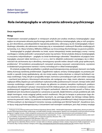 Robert Szewczyk Uniwersytet Opolski Rola światopoglądu w utrzymaniu zdrowia psychicznego Zarys zagadnienia Wstęp Przedmiotem rozważań podjętych w niniejszym artykule jest analiza struktury światopoglądu i jego wpływ na utrzymanie zdrowia psychicznego jednostki1. Definicja światopoglądu, jaką w nich przyjmuję, jest słownikowa, prawdopodobnie najczęściej podawana, odnoszącą się do światopoglądu indywidualnego człowieka, ale zakresowo mieszczącą się w rozważaniach czołowych filozofów analizujących tę kwestię, m.in. Maxa Schelera, Wilhelma Diltheya czy Innocentego Bocheńskiego na gruncie polskim. Światopogląd to pogląd człowieka na świat, wyraz interpretacji świata zawierający oceny i normy wynikające z wiedzy jednostki i uznawanych przez nią wartości. Temat artykułu dotyczy światopoglądu w znaczeniu indywidualnym – poglądu na świat konkretnego człowieka2. Niezależnie od pojęcia światopoglądu używam także terminu p o s t a w a. Jest to składnik osobowości wyrażający się w skłonnościach do zachowania się w określony, stereotypowy sposób wobec danych osób, grup społecznych, problemów3. W kontekście prowadzonych rozważań postawą nazywam uzewnętrznione, wyrażone w działaniach przyjmowane wartości i normy wchodzących w skład światopoglądu. W artykule podaję kilka przykładów z praktyki psychoterapeutycznej, ponieważ stanowić one będą dobrą ilustrację tytułowej problematyki. Zagadnienie wpływu zmiany światopoglądu na postawę jednostki w sposób mniej spektakularny, ale nie mniej ważny można dostrzec w różnych technikach rozwoju osobistego. Tutaj, tak jak w przypadku terapii, rozmowa z prowadzącymi (jak sami siebie nazywają – coachami) jest jednym z kluczowych elementów, ale następuje ona i daje, moim zdaniem, zazwyczaj najlepsze efekty dopiero po samodzielnym wykonaniu kilku podstawowych ćwiczeń. Istnieje wiele szkół rozwoju osobistego, większość z nich skupia się głównie na zmianie nawyków myślowych, praktyce wizualizacji określonych sytuacji i stosowania technik relaksacyjnych, jak również na edukacji z zakresu podstawowych zagadnień psychologii. W krajach zachodnich, obecnie również powoli w Polsce, taka działalność jest stosunkowo popularna i uznawana za sposób, dzięki któremu umysł, podobnie jak ciało dzięki treningom, może osiągnąć pełnię swoich możliwości. Nie jest to terapia w potocznym tego słowa rozumieniu, ale ma z nią kilka punktów stycznych, np. pomaga pozbyć się różnego rodzaju lęków, wzmacnia pewność siebie, czy podsuwa wskazówki dotyczące prawidłowych relacji interpersonalnych. W Polsce jednym ze słynniejszych trenerów rozwoju osobistego jest Michał Pasterski4. Zasadniczo tym, co łączy sesję psychoterapeutyczną z ćwiczeniami nad rozwojem osobistym, jest chęć zmiany swojego 1 Posługuję się tutaj definicją podaną przez Światową Organizację Zdrowia (WHO – World Health Organization), według której „zdrowie jest pełnią dobrostanu fizycznego, psychicznego i społecznego, a nie tylko brakiem choroby i niedomagania”. Zgodnie z tym twierdzeniem utrzymanie zdrowia wymaga pielęgnacji i ciągłego rozwoju, a także umiejętności przywracania stale zakłócanej równowagi i przystosowania się do zachodzących zmian. 2 „Ostatecznym korzeniem światopoglądu jest życie (indywidualne, niepowtarzalne – R. S.). […] życie każdej jednostki wytwarza właściwy sobie świat”; cyt. za: W. Dilthey, O Istocie filozofii i inne pisma, przeł. E. Paczkowska-Łagowska, Warszawa 1987, s. 120. 3 Na podstawie: Encyklopedia Popularna PWN, Warszawa 1996, s. 673. 4 „Mądry rozwój osobisty to przyjemny i naturalny proces. Zmiana nie musi oznaczać wprowadzania trudnej rewolucji życiowej, przecież większość z nas właśnie tego boi się najbardziej. Możesz zmieniać i rozwijać siebie we własnym, spokojnym tempie, czerpiąc z tego procesu frajdę i przyjemność”; cyt. za: M. Pasterski, Blog o rozwoju osobistym, dostępny online: http.://michalpasterski.pl/2013/07/rozwoj-osobisty-jest-jak/ [ostatnia wizyta 10.02.2015]. www.tekstotekafilozoficzna.pl 35 Nr 4 (2015) ISSN 2299-8152 Rola światopoglądu w utrzymaniu zdrowia psychicznego życia i pełne zaangażowanie osób w nich uczestniczących. Jest to wymóg podstawowy, o którym będę wspominał w dalszej części artykułu. Struktura światopoglądu5 Analizując budowę światopoglądu, można wyróżnić w nim trzy podstawowe rodzaje sądów: 1. Sądy opisowe, czyli jak i z czego zbudowany jest świat. Jest to synteza wiedzy o świecie oparta na wiedzy własnej (interpretacji świata, własnego doświadczenia) i wiedzy naukowej. 2. Sądy wartościujące, czyli co jest uznawane za wartość. Zawsze w tle wypowiedzi oceniającej jest hierarchia wartości, przyjmowana świadomie lub bezwiednie. 3. Sądy normatywne, czyli jakie działania podejmować. Jak postępować na podstawie własnej wiedzy i wyznawanych wartości. Do sądów normatywnych często zakresowo wspólnych ze światopoglądem należą także m.in. normy moralne, obyczajowe i prawne. Dodatkowym elementem światopoglądu są odpowiedzi na pytania egzystencjalne o sens życia, śmierci czy cierpienia6. Ten element dotyczy jednak bardziej światopoglądu w formie ogólnego stanowiska (światopogląd religijny, filozoficzny, ideologia), niż indywidualnego poglądu, który (z wyjątkami) co prawda daje jakieś szczątkowe odpowiedzi na te pytania, ale nie jest to wykładnia systematyczna i spójna. Innym elementem wartym zaznaczenia w strukturze światopoglądu jest zaproponowana przez Bocheńskiego tzw. hipoteza wyjaśniająca7. Jest ona zarówno ogólnym uzasadnieniem, jak również czymś leżącym u podstaw światopoglądu. Hipoteza wyjaśniająca to naczelna idea, wartość, którą przyjmuje dany człowiek. Poprzez nią następuje uzasadnienie i wartościowanie obserwowanych zjawisk, przeżywanego 