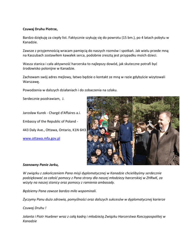 Czuwaj Druhu Piotrze, Bardzo dziękuję za ciepły list. Faktycznie szykuję się do powrotu (15 bm.), po 4 latach pobytu w Kanadzie. Zawsze z przyjemnością wracam pamięcią do naszych rozmów i spotkań. Jak wielu przede mną na Kaszubach zostawiłem kawałek serca, podobnie zresztą jest przypadku moich dzieci. Wasza stanica i cała aktywność harcerska to najlepszy dowód, jak skuteczne potrafi być środowisko polonijne w Kanadzie. Zachowam swój adres mejlowy, łatwo będzie o kontakt ze mną w razie gdybyście wizytowali Warszawę. Powodzenia w dalszych działaniach i do zobaczenia na szlaku. Serdecznie pozdrawiam, J. Jarosław Kurek - Chargé d'Affaires a.i. Embassy of the Republic of Poland 443 Daly Ave., Ottawa, Ontario, K1N 6H3 www.ottawa.mfa.gov.pl Szanowny Panie Jarku, W związku z zakończeniem Pana misji dyplomatycznej w Kanadzie chcielibyśmy serdecznie podziękować za całość pomocy z Pana strony dla naszej młodziezy harcerskiej w ZHRwK, za wizyty na naszej stanicy oraz pomocy z ramienia ambasady. Będziemy Pana zawsze bardzo miło wspominali. Życzymy Panu dużo zdrowia, pomyślności oraz dalszych sukcesów w dyplomatycznej karierze Czuwaj Druhu ! Jolanta i Piotr Huebner wraz z całą kadrą i młodzieżą Związku Harcerstwa Rzeczypospolitej w Kanadzie