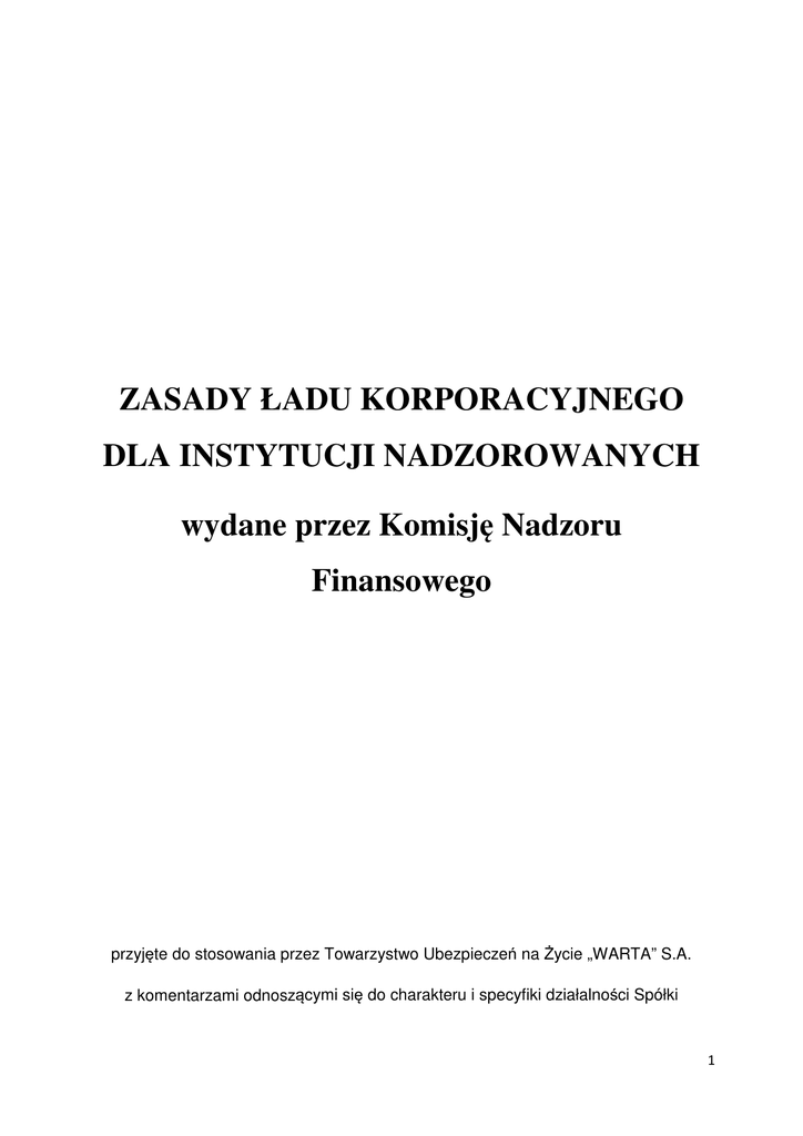 ZASADY ŁADU KORPORACYJNEGO DLA INSTYTUCJI NADZOROWANYCH wydane przez Komisję Nadzoru Finansowego przyjęte do stosowania przez Towarzystwo Ubezpieczeń na Życie „WARTA” S.A. z komentarzami odnoszącymi się do charakteru i specyfiki działalności Spółki 1 Rozdział 1 Organizacja i struktura organizacyjna 1. 2. 3. 4. 1. 2. § 1. Organizacja instytucji nadzorowanej powinna umożliwiać osiąganie długoterminowych celów prowadzonej działalności. Organizacja instytucji nadzorowanej powinna obejmować zarządzanie i sprawowanie kontroli, systemy sprawozdawczości wewnętrznej, przepływu i ochrony informacji oraz obiegu dokumentów, co powinno być należycie uregulowane w regulacjach wewnętrznych. Organizacja instytucji nadzorowanej powinna być odzwierciedlona w strukturze organizacyjnej. Instytucja nadzorowana powinna zapewnić jawność uregulowanej w regulacjach wewnętrznych struktury organizacyjnej poprzez zamieszczenie przynajmniej podstawowej struktury organizacyjnej na stronie internetowej. § 2. Instytucja nadzorowana powinna posiadać przejrzystą oraz adekwatną do skali i charakteru prowadzonej działalności oraz podejmowanego ryzyka strukturę organizacyjną, w której podległość służbowa, zadania oraz zakres obowiązków i odpowiedzialności są wyraźnie przypisane i odpowiednio podzielone. Struktura organizacyjna powinna obejmować i odzwierciedlać cały obszar działalności instytucji nadzorowanej wyraźnie wyodrębniając każdą kluczową funkcję w obrębie wykonywanych zadań. Dotyczy to zarówno podziału zadań jak i odpowiedzialności pomiędzy członków organu zarządzającego instytucji nadzorowanej, a także podziału zadań i odpowiedzialności pomiędzy komórki organizacyjne centrali, jednostki terenowe oraz poszczególne stanowiska albo grupy stanowisk. Struktura organizacyjna powinna zostać tak określona, by nie zachodziły wątpliwości co do zakresu zadań i odpowiedzialności odpowiednich komórek organizacyjnych, jednostek terenowych i stanowisk lub grup stanowisk, a zwłaszcza, by nie dochodziło do nakładania się na siebie obowiązków i odpowiedzialności komórek organizacyjnych, jednostek terenowych i stanowisk lub grup stanowisk. § 3. Instytucja nadzorowana obowiązana jest przestrzegać wymogów wynikających z przepisów prawa oraz uwzględniać rekomendacje nadzorcze wydane przez odpowiednie organy nadzoru, w szczególności przez KNF lub odpowiednio EBA (European Banking Authority), ESMA (European Securities and Markets Authority), EIOPA (European Insurance and Occupational Pensions Authority), a także zobowiązania lub deklaracje składane wobec organów nadzoru oraz uwzględniać indywidualne zalecenia wydane przez organy nadzoru. 1. 2. 3. 4. § 4. Instytucja nadzorowana powinna określić własne cele strategiczne uwzględniając charakter oraz skalę prowadzonej działalności. Organizacja instytucji nadzorowanej powinna umożliwiać osiąganie zakładanych strategicznych celów z uwzględnieniem konieczności efektywnego monitorowania ryzyka występującego w jej działalności. Organizacja instytucji nadzorowanej powinna umożliwiać niezwłoczne podejmowanie odpowiednich działań w sytuacjach nagłych, gdy konieczne jest odstąpienie lub nie jest możliwe realizowanie przyjętych celów strategicznych z powodu nieoczekiwanych zmian w otoczeniu gospodarczym lub prawnym instytucji nadzorowanej albo, gdy dalsza realizacja przyjętych celów może prowadzić do naruszenia norm określonych regulacjami dotyczącymi prowadzenia działalności przez daną instytucję nadzorowaną lub ustalonych zasad postępowania. Organizacja instytucji nadzorowanej powinna zapewniać, że: 2 1) 2) 3) 1. 2. 3. 1. 2. wykonywanie zadań z zakresu działalności podmiotu jest powierzane osobom posiadającym niezbędną wiedzę i umiejętności, nad którymi nadzór sprawują osoby posiadające także odpowiednie doświadczenie, określając zakres powierzanych zadań bierze się pod uwagę możliwość właściwego i rzetelnego wykonania tych zadań na danym stanowisku, prawa pracowników są należycie chronione, a ich interesy należycie uwzględniane, w szczególności poprzez stosowanie przejrzystych i obiektywnych zasad zatrudniania i wynagradzania, oceny, a także nagradzania i awansu zawodowego. § 5. Tworząc strukturę organizacyjną lub dokonując w niej zmian należy zapewnić spójność, w szczególności z podstawowym aktem ustrojowym w sprawie utworzenia i funkcjonowania instytucji nadzorowanej oraz sposobu działania jej organów. Powyższy wymóg odnoszący się do struktury organizacyjnej powinien być zachowany również w odniesieniu do innych dokumentów wewnętrznych związanych z organizacją i funkcjonowaniem poszczególnych komórek organizacyjnych i stanowisk centrali, a także jednostek terenowych i ich komórek organizacyjnych czy stanowisk lub grup stanowisk. Pracownikom instytucji nadzorowanej należy zapewnić odpowiedni dostęp do informacji o zakresach uprawnień, obowiązkach i odpowiedzialności poszczególnych komórek organizacyjnych. § 6. W przypadku wprowadzenia w instytucji nadzorowanej anonimowego sposobu powiadamiania organu zarządzającego lub organu nadzorującego o nadużyciach w tejże instytucji nadzorowanej, powinna być zapewniona możliwość korzystania z tego narzędzia przez pracowników bez obawy negatywnych konsekwencji ze strony kierownictwa i innych pracowników instytucji nadzorowanej. Organ zarządzający powinien przedstawiać organowi nadzorującemu raporty dotyczące powiadomień o poważnych nadużyciach. § 7. Instytucja nadzorowana stosuje plany ciągłości działania mające na celu zapewnianie ciągłości działania i ograniczenia strat na wypadek poważnych zakłóceń w działalności podmiotu. Rozdział 2 Relacja z udziałowcami instytucji nadzorowanej 1. 2. 3. 4. 1. § 8. Instytucja nadzorowana powinna działać w interesie wszystkich udziałowców z poszanowa