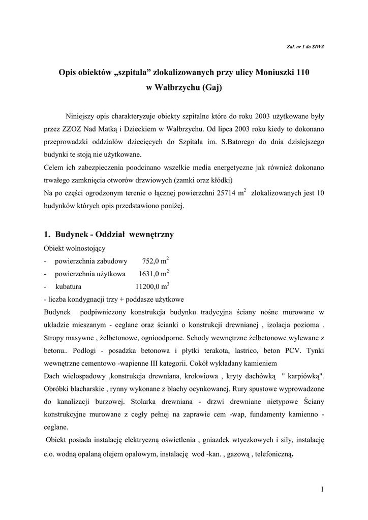 Zał. nr 1 do SIWZ Opis obiektów „szpitala” zlokalizowanych przy ulicy Moniuszki 110 w Wałbrzychu (Gaj) Niniejszy opis charakteryzuje obiekty szpitalne które do roku 2003 uŜytkowane były przez ZZOZ Nad Matką i Dzieckiem w Wałbrzychu. Od lipca 2003 roku kiedy to dokonano przeprowadzki oddziałów dziecięcych do Szpitala im. S.Batorego do dnia dzisiejszego budynki te stoją nie uŜytkowane. Celem ich zabezpieczenia poodcinano wszelkie media energetyczne jak równieŜ dokonano trwałego zamknięcia otworów drzwiowych (zamki oraz kłódki) Na po części ogrodzonym terenie o łącznej powierzchni 25714 m2 zlokalizowanych jest 10 budynków których opis przedstawiono poniŜej. 1. Budynek - Oddział wewnętrzny Obiekt wolnostojący - powierzchnia zabudowy 752,0 m2 - powierzchnia uŜytkowa 1631,0 m2 - kubatura 11200,0 m3 - liczba kondygnacji trzy + poddasze uŜytkowe Budynek podpiwniczony konstrukcja budynku tradycyjna ściany nośne murowane w układzie mieszanym - ceglane oraz ścianki o konstrukcji drewnianej , izolacja pozioma . Stropy masywne , Ŝelbetonowe, ognioodporne. Schody wewnętrzne Ŝelbetonowe wylewane z betonu.. Podłogi - posadzka betonowa i płytki terakota, lastrico, beton PCV. Tynki wewnętrzne cementowo -wapienne III kategorii. Cokół wykładany kamieniem Dach wielospadowy ,konstrukcja drewniana, krokwiowa , kryty dachówką '' karpiówką". Obróbki blacharskie , rynny wykonane z blachy ocynkowanej. Rury spustowe wyprowadzone do kanalizacji burzowej. Stolarka drewniana - drzwi drewniane nietypowe Ściany konstrukcyjne murowane z cegły pełnej na zaprawie cem -wap, fundamenty kamienno ceglane. Obiekt posiada instalację elektryczną oświetlenia , gniazdek wtyczkowych i siły, instalację c.o. wodną opalaną olejem opałowym, instalację wod -kan. , gazową , telefoniczną. 1 2. Budynek - Pawilon zakaźny, Przychodnia Neurologiczna Obiekt wolnostojący : - powierzchnia zabudowy 1083,9 m2 - powierzchnia uŜytkowa 3832,5 m2 - kubatura 1624,6 m3 - liczna kondygnacji trzy + uŜytkowe poddasze Budynek zabytkowy podlega ochronie konserwatora zabytków ,całkowicie podpiwniczony , konstrukcja budynku tradycyjna ściany nośne murowane w układzie mieszanym - ceglane oraz ścianki o konstrukcji drewnianej , izolacja pozioma . Ściany konstrukcyjne murowane , z cegły pełnej na zaprawie cem -wap, fundamenty kamienno -ceglane. Stropy masywne , Ŝelbetonowe, ognioodporne. Schody wewnętrzne Ŝelbetonowe wylewane z betonu. Zewnętrzne wejściowe , na podsypce piaskowej a stopnie wylewane. Podłogi - posadzka betonowa i płytki terakota, lastrico, beton PCV. Tynki wewnętrzne cementowo -wapienne III kategorii. Cokół wykładany kamieniem Dach wielospadowy ,konstrukcja drewniana, krokwiowa , kryty papą. Obróbki blacharskie , rynny wykonane z blachy ocynkowanej. Rury spustowe wyprowadzone do kanalizacji burzowej. Stolarka drewniana - drzwi drewniane nietypowe. Obiekt posiada instalację elektryczną oświetlenia , gniazdek wtyczkowych i siły, instalację c.o. wodną opalaną olejem opałowym. Instalację wod -kan., sanitarną , gazową , telefoniczną, instalację odgromową 3. Budynek - hotel w budowie - powierzchnia zabudowy 250 m2 - powierzchnia uŜytkowa 0 m2 - kubatura 0 m3 - liczba kondygnacji jedna Budynek w budowie - wolnostojący , częściowo zrealizowany stan surowy otwarty , murowany konstrukcja budynku tradycyjna ściany nośne murowane- ceglane , izolacja pozioma . Ściany konstrukcyjne murowane , cegła na zaprawie cem -wap, fundamenty betonowe z betonu Ŝwirowego. Stropy Ŝelbetowe 1 kondygnacji 2 Obiekt nie posiada stolarki drzwiowej, okiennej, instalacji elektrycznej, instalacji c.o. wod kan, sanitarnej, telefonicznej. 4. Budynek - laboratorium, apteka - powierzchnia zabudowy 367,0 m2 - powierzchnia uŜytkowa 754,9 m2 - kubatura 6164 m3 - liczba kondygnacji trzy Budynek podpiwniczony , konstrukcja budynku tradycyjna ściany nośne murowane z cegły pełnej , izolacja pozioma . Ściany konstrukcyjne murowane , z cegły pełnej na zaprawie cem -wap, fundamenty betonowe z betonu Ŝwirowego. Stropy masywne , Ŝelbetowe, ognioodporne. Schody wewnętrzne Ŝelbetowe wylewane z betonu. Zewnętrzne wejściowe , na podsypce piaskowej a stopnie wylewane. Podłogi - posadzka betonowa i płytki terakota, lastrico, beton PCV. Tynki wewnętrzne cementowo -wapienne III kategorii. Dach płaski , kryty papą. Obróbki blacharskie , rynny wykonane z blachy ocynkowanej. Rury spustowe wyprowadzone do kanalizacji burzowej. Stolarka drewniana - drzwi drewniane nietypowe. Obiekt posiada windę towarową., instalację elektryczną oświetlenia , gniazdek wtyczkowych i siły, instalację c.o. wodną opalaną olejem opałowym. Instalację wod -kan., sanitarną , gazową , telefoniczną, instalację odgromową 5. Budynek - pralnia - powierzchnia zabudowy 315,0 m2 - powierzchnia uŜytkowa 128,4 m2 - kubatura - 1691 m3 liczba kondygnacji dwie Budynek gospodarczy wolnostojący , konstrukcja budynku tradycyjna ściany nośne murowane z cegły pełnej w części parterowej obudowany panelami pcv , izolacja pozioma . Ściany konstrukcyjne murowane , z cegły pełnej betonowe z betonu Ŝwirowego. Stropy na zaprawie cem -wap, fundamenty , Ŝelbetowe, ognioodporne. Schody wewnętrzne Ŝelbetowe wylewane z betonu. Podłogi - posadzka betonowa i płytki , beton ,PCV. Tynki wewnętrzne cementowo -wapienne III kategorii. Dach dwuspadowy , kryty dachówką "karpiówką". Obróbki blacharskie , rynny wykonane z blachy ocynkowanej. Rury spustowe wyprowadzone do kanalizacji burzowej. Stolarka drewniana - drzwi drewniane nietypowe. 3 Obiekt posiada , instalację elektryczną oświetlenia , gniazdek wtyczkowych i siły, instalację c.o. wodną opalaną olejem opałowym. Instalację wod -kan., sanitarną , gazową , telefoniczną, instalację odgromową 6. Budynek - Prosektorium , warsztaty , magazyny Obiekt wolnostojący - powierzchnia zabudowy 361,0 m2 - powierzchnia uŜytkowa - kubatura - liczb