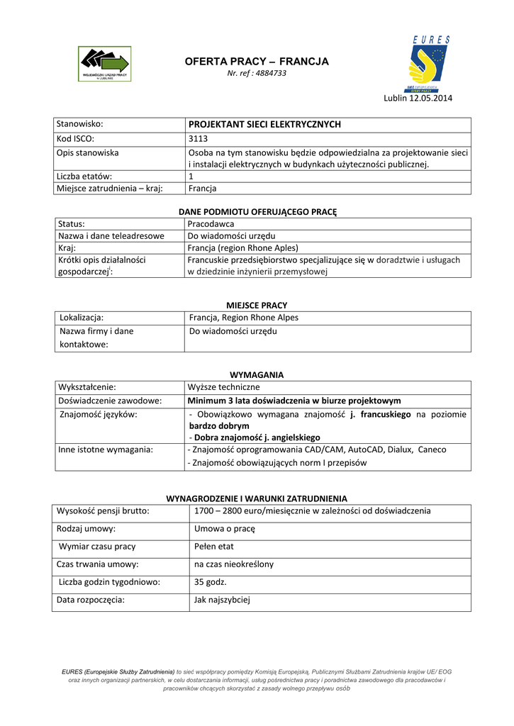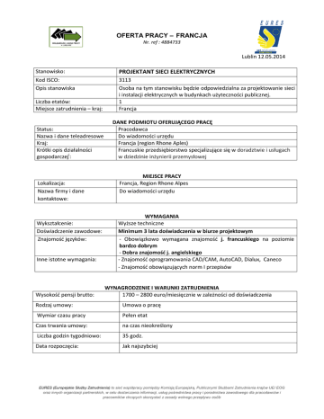 OFERTA PRACY – FRANCJA Nr. ref : 4884733 Lublin 12.05.2014 Stanowisko: PROJEKTANT SIECI ELEKTRYCZNYCH Kod ISCO: Opis stanowiska 3113 Osoba na tym stanowisku będzie odpowiedzialna za projektowanie sieci i instalacji elektrycznych w budynkach użyteczności publicznej. 1 Francja Liczba etatów: Miejsce zatrudnienia – kraj: Status: Nazwa i dane teleadresowe Kraj: Krótki opis działalności gospodarczeji: Lokalizacja: Nazwa firmy i dane kontaktowe: Wykształcenie: Doświadczenie zawodowe: Znajomość języków: Inne istotne wymagania: Wysokość pensji brutto: DANE PODMIOTU OFERUJĄCEGO PRACĘ Pracodawca Do wiadomości urzędu Francja (region Rhone Aples) Francuskie przedsiębiorstwo specjalizujące się w doradztwie i usługach w dziedzinie inżynierii przemysłowej MIEJSCE PRACY Francja, Region Rhone Alpes Do wiadomości urzędu WYMAGANIA Wyższe techniczne Minimum 3 lata doświadczenia w biurze projektowym - Obowiązkowo wymagana znajomość j. francuskiego na poziomie bardzo dobrym - Dobra znajomość j. angielskiego - Znajomość oprogramowania CAD/CAM, AutoCAD, Dialux, Caneco - Znajomość obowiązujących norm I przepisów WYNAGRODZENIE I WARUNKI ZATRUDNIENIA 1700 – 2800 euro/miesięcznie w zależności od doświadczenia Rodzaj umowy: Umowa o pracę Wymiar czasu pracy Pełen etat Czas trwania umowy: na czas nieokreślony Liczba godzin tygodniowo: 35 godz. Data rozpoczęcia: Jak najszybciej EURES (Europejskie Służby Zatrudnienia) to sieć współpracy pomiędzy Komisją Europejską, Publicznymi Służbami Zatrudnienia krajów UE/ EOG oraz innych organizacji partnerskich, w celu dostarczania informacji, usług pośrednictwa pracy i poradnictwa zawodowego dla pracodawców i pracowników chcących skorzystać z zasady wolnego przepływu osób SPOSÓB SKŁADANIA WNIOSKU Wymagane dokumenty CV - z dopiskiem – PROJECTEURS EN ELECTRICITE TERTIAIRE - + List motywacyjny Język, w którym muszą być sporządzone przedkładane dokumenty: Do kogo należy wysłać dokumenty: Gdzie należy wysłać dokumenty: Dane teleadresowe doradcy EURES lub przedstawiciela pracodawcy: Język francuski Termin przedkładania podań o pracę 30.06.2014r. Do doradcy Eures we Włoszech [email protected] Doradca Eures Provincia di Torino Servizio Coordinamento CPI - Eures V.Bologna 153, 10154 - Torino - ITALIA Phone + 39 011 9403717 / 711 Phone + 39 011 8614817 e mail: [email protected] WAŻNOŚĆ Uprzejmie informujemy, że pracodawca skontaktuje się wyłącznie z wybranymi kandydatami. UWAGA: 1. Umowa z zagranicznym pracodawcą zostanie zawarta zgodnie z prawem kraju zatrudnienia. Oznacza to, że wszystkie roszczenia odnośnie do warunków, które obejmuje umowa, można kierować wyłącznie do odpowiedniego sądu w kraju zatrudnienia. Publiczne służby zatrudnienia (EURES) nie mogą pośredniczyć ani reprezentować pracownika w sądzie kraju zatrudnienia w przypadku sporu z pracodawcą. 2. Publiczne służby zatrudnienia (EURES) dokładają wszelkich starań, aby zapewnić rzetelność i wiarygodność ofert pracy zgłoszonych w lokalnym urzędzie pracy. Należy wyjaśnić, że oferta pracy została zgłoszona przez stronę trzecią i EURES nie odpowiada za ewentualne rozbieżności między warunkami pracy określonymi w ofercie pracy i warunkami oferowanymi przez potencjalnego pracodawcę. 3. Publiczne służby zatrudnienia (EURES) informują, że będą zbierać, przetwarzać i przekazywać potencjalnym pracodawcom zgodnie z przepisami dotyczącymi ochrony danych osobowych wszystkie dane osobowe dostarczone przez osoby poszukujące pracy. EURES (Europejskie Służby Zatrudnienia) to sieć współpracy pomiędzy Komisją Europejską, Publicznymi Służbami Zatrudnienia krajów UE/ EOG oraz innych organizacji partnerskich, w celu dostarczania informacji, usług pośrednictwa pracy i poradnictwa zawodowego dla pracodawców i pracowników chcących skorzystać z zasady wolnego przepływu osób