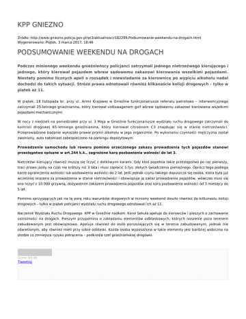 KPP GNIEZNO Źródło: http://www.gniezno.policja.gov.pl/wl3/aktualnosci/182299,Podsumowanie-weekendu-na-drogach.html Wygenerowano: Piątek, 3 marca 2017, 18:46 PODSUMOWANIE WEEKENDU NA DROGACH Podczas minionego weekendu gnieźnieńscy policjanci zatrzymali jednego nietrzeźwego kierującego i jednego, który kierował pojazdem wbrew sądowemu zakazowi kierowania wszelkimi pojazdami. Niestety pomimo licznych apeli o rozsądek i niewsiadanie za kierownicę po wypiciu alkoholu nadal dochodzi do takich sytuacji. Stróże prawa odnotowali również kilkanaście kolizji drogowych – tylko w piątek aż 11. W piątek, 18 listopada br. przy ul. Armii Krajowej w Gnieźnie funkcjonariusze referatu patrolowo – interwencyjnego zatrzymali 25-letniego gnieźnianina, który kierował volkswagenem golf wbrew sądowemu zakazowi kierowania wszelkimi pojazdami mechanicznymi. W nocy z niedzieli na poniedziałek przy ul. 3 Maja w Gnieźnie funkcjonariusze wydziału ruchu drogowego zatrzymali do kontroli drogowej 65-letniego gnieźnianina, który kierował citroenem C3 znajdując się w stanie nietrzeźwości. Przeprowadzone badanie wykazało prawie promil alkoholu w jego organizmie. Po wykonaniu czynności mężczyzna został zwolniony, auto natomiast zabezpieczono na parkingu depozytowym. Prowadzenie samochodu lub roweru pomimo orzeczonego zakazu prowadzenia tych pojazdów stanowi przestępstwo opisane w art.244 k.k., zagrożone karą pozbawienia wolności do lat 3. Nietrzeźwi kierujący również muszą się liczyć z dotkliwymi karami. Gdy ktoś popełnia takie przestępstwo po raz pierwszy, traci prawo jazdy na czas nie krótszy niż 3 lata i musi zapłacić 5 tys. złotych świadczenia pieniężnego. Oprócz tego podlega karze ograniczenia wolności lub pozbawienia wolności do 2 lat. Jeśli jednak czynu takiego dopuszcza się osoba, która była już wcześniej skazana za prowadzenia w stanie nietrzeźwości i obowiązuje ją zakaz prowadzenia pojazdów, wówczas musi się ona liczyć z 10 000 grzywną, dożywotnim zakazem prowadzenia pojazdów oraz karą pozbawienia wolności od 3 miesięcy do 5 lat. Pomimo sprzyjających jak na tę porę roku warunków drogowych w miniony weekend doszło również do kilkunastu kolizji drogowych – tylko w piątek policjanci wydziału ruchu drogowego odnotowali ich aż 11. Naczelnik Wydziału Ruchu Drogowego KPP w Gnieźnie nadkom. Karol Sekula apeluje do kierowców i pieszych o zachowanie ostrożności na drogach. Pieszym przypomina o zakładaniu elementów odblaskowych, których noszenie poza terenem zabudowanym jest obowiązkowe. Apeluje również do osób poruszających się w terenie zabudowanym, jednak nie oświetlonym, aby również mieli przy sobie odblaski. Każda osoba wyposażona w takie elementy jest bardziej widoczna na drodze co zmniejsza ryzyko potrącenia – podkreśla szef gnieźnieńskiej drogówki. Ocena: 0/5 (0) Tweetnij