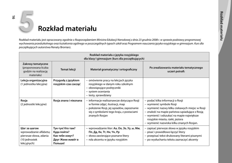 Rozkład materiału Rozkład materiału jest opracowany zgodnie z Rozporządzeniem Ministra Edukacji Narodowej z dnia 23 grudnia 2008 r. w sprawie podstawy programowej wychowania przedszkolnego oraz kształcenia ogólnego w poszczególnych typach szkół oraz Programem nauczania języka rosyjskiego w gimnazjum. Kurs dla początkujących autorstwa Renaty Broniarz. Rozkład materiału z języka rosyjskiego dla klasy I gimnazjum (kurs dla początkujących) Zakresy tematyczne (proponowana liczba godzin na realizację materiału) Temat lekcji Po zrealizowaniu materiału tematycznego uczeń potrafi: Materiał gramatyczny i ortograficzny Lekcja organizacyjna (1 jednostka lekcyjna) Przygodę z językiem rosyjskim czas zacząć − omówienie pracy na lekcjach języka rosyjskiego w danym roku szkolnym − obowiązujące podręczniki − system oceniania − testy, sprawdziany Rosja (2 jednostki lekcyjne) Rosja znana i nieznana − informacje realioznawcze dotyczące Rosji w formie zdjęć, ilustracji, map − położenie Rosji, jej sąsiadów, zapoznanie się z symbolami tego kraju, z postaciami znanych Rosjan − − − − − Шаг за шагом wprowadzanie alfabetu; pierwsze słowa, zdania (10 jednostek lekcyjnych) Тук-тук! Кто там? Куда пойти? Как тебя зовут? Друг Жени живёт в Польше! − wprowadzanie liter: Аа, Оо, Ээ, Уу, ы, Мм, Пп, Дд, Кк, Тт, Нн, Чч, Рр − słowa zawierające poznane litery − rola akcentu w języku rosyjskim − − − − podać kilka informacji o Rosji wymienić symbole Rosji wymienić nazwy kilku ciekawych miejsc w Rosji znaleźć na mapie państwa sąsiadujące z Rosją wymienić i odszukać na mapie największe rosyjskie miasta, rzeki, jeziora − wymienić nazwiska kilku znanych Rosjan. zapisać pierwsze słowa w języku rosyjskim pisać i prawidłowo łączyć litery przepisać tekst drukowany literami pisanymi po wysłuchaniu tekstu zaznaczyć akcenty Rozkład materiału 16 5 − wprowadzanie liter: Гг, Бб, Фф, Йй, Зз, Хх, Вв − wymowa samogłoski o w pozycji akcentowanej i nieakcentowanej − wprowadzanie liter: Ее, Ёё, Юю, Яя − oznaczanie miękkości spółgłosek za pomocą liter jotowanych (е, ё, ю, я) oraz ь − odpowiedź na pytanie: Как тебя зовут? − wprowadzanie liter: Жж, Шш, Цц, Лл, ь − wymowa spółgłosek: ж, ш, ц, л − wprowadzanie liter: Щщ, ъ − pisownia samogłosek po spółgłoskach ж, ш, ц oraz ч, щ − rola i funkcje znaków twardego i miękkiego − pisownia wyrazów здравствуй, пожалуйста, что, чтобы − czasowniki I koniugacji: жить, знать, играть w czasie teraźniejszym − pisownia znaku miękkiego w zakończeniu bezokolicznika -ть i w 2. os. lp. czasowników w czasie teraźniejszym − rola intonacji w języku rosyjskim − podział języków słowiańskich − zadawać proste pytania typu: Кто это?, Что это? i odpowiadać na nie − przedstawić się i zapytać o imię − przeliterować swoje imię i nazwisko − powiedzieć z pamięci alfabet i poprawnie kaligrafować litery − uporządkować słowa w porządku alfabetycznym − po uprzednim przygotowaniu poprawnie przeczytać tekst drukowany i pisany odręcznie − zadawać pytania i odpowiadać na nie (twierdząco i przecząco) − zadać pytanie i odpowiedzieć, dokąd zmierza dana osoba − zastosować konstrukcję: у меня есть − odmieniać czasowniki należące do I koniugacji: играть, знать, жить − powiedzieć, gdzie kto mieszka − nazywać mieszkańców niektórych państw europejskich − rozumieć ze słuchu proste informacje, z którymi zetknął się wcześniej − określić kontekst bardzo prostej wypowiedzi Привет, это я! Сколько ей лет? Андреас говорит понемецки Несколько слов о себе − formy grzecznościowe stosowane przy powitaniu i pożegnaniu − krótkie warianty imion rosyjskich − tworzenie imion odojcowskich − rzeczowniki rodzaju żeńskiego zakończone na: -а, -я: мама, песня − przyimek о, об − mianownik liczebników głównych 0–30 w połączeniu z rzeczownikami: год, года, лет − przywitać się i pożegnać stosownie do okoliczności i pory dnia − tworzyć krótkie warianty imion i tzw. отчество, czyli imię odojcowskie − liczyć do 30 − wymienić i zapisać nazwy krajów i stolic europejskich w języku rosyjskim − nazwać obywateli tych krajów i języki, jakimi się posługują 17 Rozkład materiału ФИО (фамилия, имя, отчество) o sobie samym; dane personalne; przedstawianie się, wiek, miejsce zamieszkania (kraj) (9 jednostek lekcyjnych) Женщина объясняет задачу Схватка с алфавитом! Будьте знакомы! zawieranie znajomości; przedstawianie osób trzecich; narodowość; kraj; miejsce zamieszkania; adres; wiek (8 jednostek lekcyjnych) Temat lekcji Давайте познакомимся! Запиши мне свой адрес! Жёлтый как солнце Поздравлять можно по-разному Materiał gramatyczny i ortograficzny Po zrealizowaniu materiału tematycznego uczeń potrafi: − określanie wieku różnych osób za pomocą konstrukcji кому? сколько лет? − pisownia znaku miękkiego w liczebnikach głównych 0–30 − czasownik звать w zwrocie: меня зовут − nazwy języków obcych, krajów i ich obywateli − wyrażenie жить в w połączeniu z nazwą kraju − wybrane formy gramatyczne zaimków pytających кто?, что? − zadawać pytania o wiek, pochodzenie, miejsce zamieszkania i umieć na nie odpowiedzieć − przedstawić siebie i powiedzieć kilka słów o sobie i innych − stosować konstrukcję: жить в ... − odmieniać rzeczowniki rodzaju żeńskiego: м