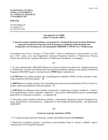 KR-021-2/09 PAŃSTWOWA WYśSZA SZKOŁA ZAWODOWA im. ANGELUSA SILESIUSA w WAŁBRZYCHU REKTOR 58-300 Wałbrzych ul. Zamkowa 4 tel. 074 641 92 00 Zarządzenie nr 2/2009 z dnia 13 stycznia 2009 r. w sprawie zasad rozdziału funduszy otrzymanych z Fundacji Rozwoju Systemu Edukacji (Agencji Narodowej Programu LLP-Erasmus) na działania zdecentralizowane Programu LLP-Erasmus na rok akademicki 2008/2009 w PWSZ AS w Wałbrzychu Na podstawie art. 66 ust. 2 ustawy z 27 lipca 2005 r. Prawo o szkolnictwie wyŜszym (Dz.U. nr 164, poz. 1365 z późn. zm.) oraz Regulaminu realizacji Programu Erasmus w Państwowej WyŜszej Szkole Zawodowej im. Angelusa Silesiusa w Wałbrzychu zarządzam, co następuje: §1 1. W roku akademickim 2008/2009 Państwowa WyŜsza Szkoła Zawodowa im. Angelusa Silesiusa w Wałbrzychu otrzyma od Fundacji Rozwoju Systemu Edukacji, pełniącej rolę Agencji Narodowej Programu ERASMUS grant w łącznej kwocie 29940 Euro w podziale na: a) 21780 Euro na wypłatę grantów dla wyjeŜdŜających studentów (SMS); liczba wyjazdów stanowiąca podstawę obliczenia grantu – 15 b) 4800 Euro na wypłatę grantów dla wyjeŜdŜających nauczycieli akademickich (STA); liczba wyjazdów stanowiąca podstawę obliczenia grantu – 6 c) 3360 Euro na dofinansowanie działań związanych z organizacją wymiany studentów i nauczycieli akademickich; liczba wyjazdów studentów i nauczycieli akademickich łącznie gwarantująca grant OM we wskazanej wysokości – co najmniej 21 2. Otrzymany grant zostanie podzielony zgodnie z zaleceniami Narodowej Agencji Programu Erasmus, określonymi w dokumencie pt. „Załącznik VI. Przewodnik dla Beneficjenta – rok akademicki 2008/2009”. §2 Grant na wyjazdy studentów (SMS) 1. W wyniku przeprowadzonej rekrutacji zostało zakwalifikowanych 14 studentów. 2. Planowane wysokości grantów w podziale na poszczególne kraje (w ramach „widełek” sugerowanych przez NA Programu Erasmus): Kraj Czechy Litwa Turcja Portugalia Liczba studentów 2 2+2 1+2 1+2+2 Stawka na miesiąc 235 EUR 235 EUR 280 EUR 374 EUR Kierunek studiów Filologia (j. angielski) Politologia, filologia polska Filologia (j. angielski), turystyka i rekreacja Administracja, politologia, turystyka i rekreacja 3. Nie rozdzielona w wyniku powyŜszej alokacji kwota grantu, jak równieŜ pozostające w trakcie realizacji wyjazdów ewentualne dalsze rezerwy grantu zostaną przeznaczone na dodatkową kwalifikację studentów na wyjazdy lub przedłuŜenie pobytu studenta o kolejny semestr w uczelni partnerskiej w semestrze letnim roku akademickiego 2008/09. §3 Grant na wyjazdy nauczycieli (STA) 1. W ramach kwoty 4800 EURO przeznaczonej na rok akademicki 2008/09 w wyniku złoŜonych do końca listopada 2008 roku i zaopiniowanych przez Dyrektorów Instytutów wniosków na wyjazdy kadry akademickiej zaplanowanych zostało 6 wyjazdów nauczycieli celem prowadzenia zajęć. 2. Planowane wysokości grantów w podziale na poszczególne kraje (w ramach „widełek” sugerowanych przez NA Programu Erasmus na trwający 1 tydzień wyjazd): Kraj Liczba nauczycieli Czechy Litwa Portugalia 1 3 2 Stawka na tydzień 650 EUR 750 EUR 950 EUR Instytut Instytut Humanistyczny Instytut Społeczno-Prawny Instytut Turystyki i Rekreacji 3. Pozostające w trakcie realizacji wyjazdów ewentualne rezerwy grantu zostaną rozdysponowane na częściowe dofinansowanie kosztów podróŜy. §4 Grant na organizację wymiany studentów i pracowników (OM) 1. Otrzymany grant (limit: 3360 EUR przy realizacji 21 wyjazdów) przeznaczony zostaje na realizację działań związanych z organizacją wymiany studentów i nauczycieli akademickich i pozostaje w dyspozycji Koordynatora Uczelnianego Programu Erasmus. 2. Uczelnia przeznaczy grant m.in. na: dofinansowanie 3 wizyt monitorujących lub wizyt przygotowawczych. §5 Zarządzenie wchodzi w Ŝycie z dniem podpisania, z mocą obowiązującą od 01.10.2008 r. REKTOR prof. zw. dr hab. ElŜbieta Lonc