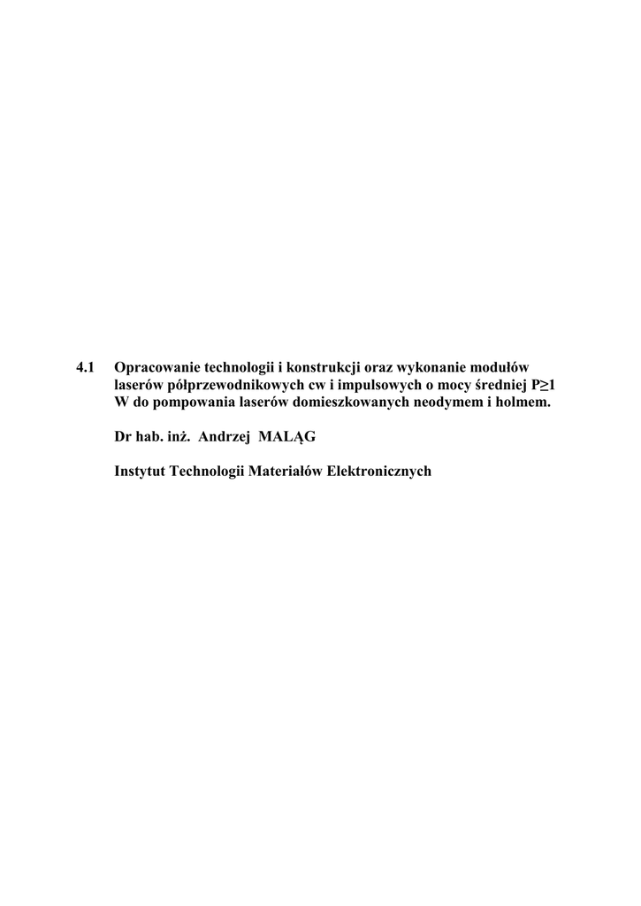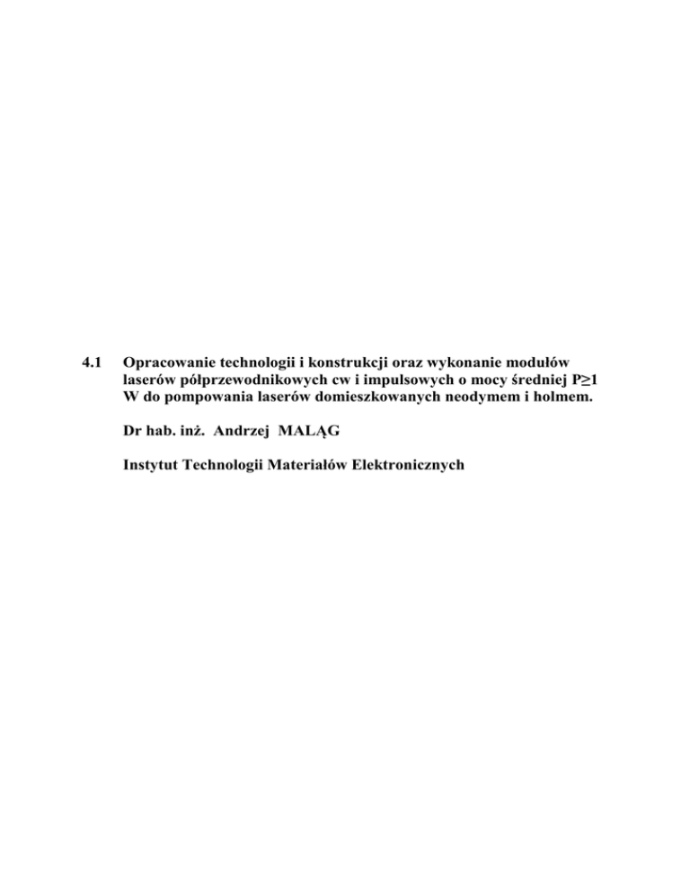 4.1 Opracowanie technologii i konstrukcji oraz wykonanie modułów laserów półprzewodnikowych cw i impulsowych o mocy średniej P≥1 W do pompowania laserów domieszkowanych neodymem i holmem. Dr hab. inż. Andrzej MALĄG Instytut Technologii Materiałów Elektronicznych DIODA LASEROWA 810 nm 1.5W DANE TECHNICZNE Charakterystyka: Struktura DBSCH SQW Gain Guiding GaAsP/AlGaAs/GaAs Długość fali emisji: 800 - 815 nm Nominalna moc optyczna: 1.5 W CW Dopuszczalne napięcie wsteczne: 2V Polaryzacja TM Temperatura pracy (CW): od 5 do 55°C Temperatura składowania: od 0 do 75°C 3.0 2 1 moc optyczna P [W] R 0.5 1.27 3 2.54 2.5 1.5 1.0 P 0.5 Tobudowy = 18oC 0.5 0.0 0.0 0.0 0.5 Ø 9.0±0.025 1.0 1.5 prad diody [A] ±0.1 Ø 6.2 ±0.1 Ø 3.0 charakterystyka kierunkowa 3.4 3.6 5.1 8 I = 1.6 A moc optyczna [a.u.] ±0.8 znormalizowana intensywnosc charakterystyka spektralna 0.7 o T = 16 C I = 1.6 A o T = 18 C Ø 0.48 1. 2. 3. 2.0 U 1.0 Katoda diody laserowej Anoda diody laserowej ---------------- 805 806 807 808 809 810 811 λ [nm] 1.0 P=1W 0.8 0.6 FWHM 0.4 Θ⊥= 16 o ΘII= 6 o 0.2 0.0 -30 -20 -10 0 10 20 30 kat od normalnej [deg] Właściwości optyczne i elektryczne (T=20°C) Symbol Dł. fali emisji wiązki las. [nm] Prąd progowy [A] Prąd nominalny [A] Napięcie nominalne [V] Zewn. sprawność kwantowa [W/A] Powierzchnia emitująca [μm × μm] Rozbieżność wiązki || [°] Rozbieżność wiązki ⊥ [°] λ Ith Iop Uop η θ|| θ⊥ Wartość min. 800 0.35 0.9 5 15 INSTITUTE OF ELECTRONIC MATERIALS TECHNOLOGY 133 Wólczyńska Str., 01-919 WARSAW, POLAND Wartość typowa 0.4 1.1 1 (⊥) × 100 (II) 6 16 Wartość maks. 815 0.42 1.7 2.1 Warunki pomiaru P0 = 1.5 W 7 17 P0 = 1.5 W P0 = 1.5 W P0 = 1.5 W P0 = 1.5 W napiecie na diodzie U [V] 1.5 DIODA LASEROWA 810 nm 3 W DANE TECHNICZNE Charakterystyka: moc optyczna P [W] 3 U 2 1 2 1 P Tobudowy = 18oC 0 0 0 1 2 prad diody [A] 3 4 I= 3A I= 2A I=1A znormalizowana intensywnosc znormalizowana intensywnosc 1.0 P=2W 0.8 o 0.6 Θ⊥= 16 FWHM o ΘII= 11 0.4 0.2 0.0 -30 -20 -10 0 10 20 30 Θ (od normalnej) [deg] o 802 803 804 805 806 λ 807 808 charakterystyki kierunkowe charakterystyki spektralne T=18 C 809 810 [nm] Właściwości optyczne i elektryczne (T=20°C) Symbol Dł. fali emisji wiązki las. [nm] Prąd progowy [A] Prąd nominalny [A] Napięcie nominalne [V] Zewn. sprawność kwantowa [W/A] Powierzchnia emitująca [μm × μm] Rozbieżność wiązki || [°] Rozbieżność wiązki ⊥ [°] λ Ith Iop Uop η θ|| θ⊥ Wartość min. 805 0.7 0.9 10 15 INSTITUTE OF ELECTRONIC MATERIALS TECHNOLOGY 133 Wólczyńska Str., 01-919 WARSAW, POLAND Wartość typowa 0.8 3.5 2 1.1 1 (⊥) × 200 (II) 11 16 Wartość maks. 815 0.9 4 2.1 Warunki pomiaru P0 = 2.5 W 13 17 P0 = 2 W P0 = 2 W P0 = 3 W P0 = 3 W napiecie na diodzie U [V] 3 Struktura DBSCH SQW Gain Guiding GaAsP/AlGaAs/GaAs Długość fali emisji: 800 - 815 nm Nominalna moc optyczna: 3 W CW Dopuszczalne napięcie wsteczne: 2V Polaryzacja TM Temperatura pracy (CW): od 5 do 55°C Temperatura składowania: od 0 do 75°C