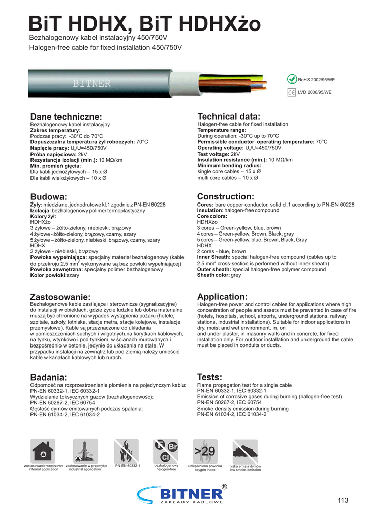 BiT HDHX, BiT HDHXżo Bezhalogenowy kabel instalacyjny 450/750V Halogen-free cable for fixed installation 450/750V RoHS RoHS 2002/95/WE LVD 2006/95/WE Dane techniczne: Technical data: Budowa: Construction: Halogen-free cable for fixed installation Temperature range: During operation: -30°C up to 70°C Permissible conductor operating temperature: 70°C Operating voltage: U0/U=450/750V Test voltage: 2kV Insulation resistance (min.): 10 MΩ/km Minimum bending radius: single core cables – 15 x Ø multi core cables – 10 x Ø Bezhalogenowy kabel instalacyjny Zakres temperatury: Podczas pracy: -30°C do 70°C Dopuszczalna temperatura żył roboczych: 70°C Napięcie pracy: U0/U=450/750V Próba napięciowa: 2kV Rezystancja izolacji (min.): 10 MΩ/km Min. promień gięcia: Dla kabli jednożyłowych – 15 x Ø Dla kabli wielożyłowych – 10 x Ø Żyły: miedziane, jednodrutowe kl.1 zgodnie z PN-EN 60228 Izolacja: bezhalogenowy polimer termoplastyczny Kolory żył: HDHXżo 3 żyłowe – żółto-zielony, niebieski, brązowy 4 żyłowe - żółto-zielony, brązowy, czarny, szary 5 żyłowe – żółto-zielony, niebieski, brązowy, czarny, szary HDHX 2 żyłowe - niebieski, brązowy Powłoka wypełniająca: specjalny materiał bezhalogenowy (kable 2 do przekroju 2,5 mm wykonywane są bez powłoki wypełniającej) Powłoka zewnętrzna: specjalny polimer bezhalogenowy Kolor powłoki:szary Cores: bare copper conductor, solid cl.1 according to PN-EN 60228 Insulation: halogen-free compound Core colors: HDHXżo 3 cores – Green-yellow, blue, brown 4 cores – Green-yellow, Brown, Black, gray 5 cores – Green-yellow, blue, Brown, Black, Gray HDHX 2 cores - blue, brown Inner Sheath: special halogen-free compound (cables up to 2 2.5 mm cross-section is performed without inner sheath) Outer sheath: special halogen-free polymer compound Sheath color: grey Zastosowanie: Application: Badania: Tests: Bezhalogenowe kable zasilające i sterownicze (sygnalizacyjne) do instalacji w obiektach, gdzie życie ludzkie lub dobra materialne muszą być chronione na wypadek wystąpienia pożaru (hotele, szpitale, szkoły, lotniska, stacje metra, stacje kolejowe, instalacje przemysłowe). Kable są przeznaczone do układania w pomieszczeniach suchych i wilgotnych,na korytkach kablowych, na tynku, wtynkowo i pod tynkiem, w ścianach murowanych i bezpośrednio w betonie, jedynie do układania na stałe. W przypadku instalacji na zewnątrz lub pod ziemią należy umieścić kable w kanałach kablowych lub rurach. Odporność na rozprzestrzenianie płomienia na pojedynczym kablu: PN-EN 60332-1, IEC 60332-1 Wydzielanie toksycznych gazów (bezhalogenowość): PN-EN 50267-2, IEC 60754 Gęstość dymów emitowanych podczas spalania: PN-EN 61034-2, IEC 61034-2 F Br Cl zastosowanie wnętrzowe zastosowanie w przemyśle internal application industrial application PN-EN 60332-1 bezhalogenowy halogen-free Halogen-free power and control cables for applications where high concentration of people and assets must be prevented in case of fire (hotels, hospitals, school, airports, underground stations, railway stations, industrial installations). Suitable for indoor applications in dry, moist and wet environment, in, on and under plaster, in masonry walls and in concrete, for fixed installation only. For outdoor installation and underground the cable must be placed in conduits or ducts. Flame propagation test for a single cable PN-EN 60332-1, IEC 60332-1 Emission of corrosive gases during burning (halogen-free test) PN-EN 50267-2, IEC 60754 Smoke density emission during burning PN-EN 61034-2, IEC 61034-2 >29 uniepalniona powłoka oxygen index niska emisja dymów low smoke emission ® 113 BiT HDHX, BiT HDHXżo Bezhalogenowy kabel instalacyjny 450/750V Halogen-free cable for fixed installation 450/750V kable z żyłą ochronną HDHXżo / cables with green-yellow core HDHXżo Nr kat. n x mm Cat. no. n x mm S63701 S63702 S63703 S63705 S63706 S63707 S63709 S63710 S63711 S63713 S63714 S63715 S63716 S63717 S63718 3 x 1,0 4 x 1,0 5 x 1,0 3 x 1,5 4 x 1,5 5 x 1,5 3 x 2,5 4 x 2,5 5 x 2,5 3x4 4x4 5x4 3x6 4x6 5x6 2 2 Średnica zewnętrzna [mm] Outer diameter [mm] 8,0 8,7 9,4 8,4 9,2 9,9 9,3 10,2 11,0 11,2 12,3 13,2 12,7 14,0 15,1 Przybliżona waga kabla [kg/km] Approximate cable weight [kg/km] 99 119 141 117 142 169 156 191 230 246 300 357 335 411 490 kable bez żyły ochronnej HDHX / cables without green-yellow core HDHX Cu [kg/km] Nr kat. n x mm Cu [kg/km] Cat. no. n x mm 28,8 38,4 48,0 43,2 57,6 72,0 72,0 96,0 120,0 115,2 153,6 192,0 172,8 230,4 288,0 S63700 S63704 S63708 S63712 2 x 1,0 2 x 1,5 2 x 2,5 2x4 2 2 Średnica zewnętrzna [mm] Outer diameter [mm] 7,6 8,0 8,8 10,7 Zakłady Kablowe BITNER zastrzegają sobie prawo do zmiany specyfikacji bez wcześniejszego uprzedzenia. Uwaga: Na życzenie klienta wykonujemy przewody z inną ilością żył lub o innych przekrojach niż podane w tabeli. The Cable Factory Bitner reserves the right to modify specifications without prior notification. Note: If so requested by the customer, we can manufacture cables with a different number of conductors or cross sections different from those set forward in the table. ® 114 Przybliżona waga kabla [kg/km] Approximate cable weight [kg/km] 83 97 126 203 Cu [kg/km] Cu [kg/km] 19,2 28,8 48,0 76,8