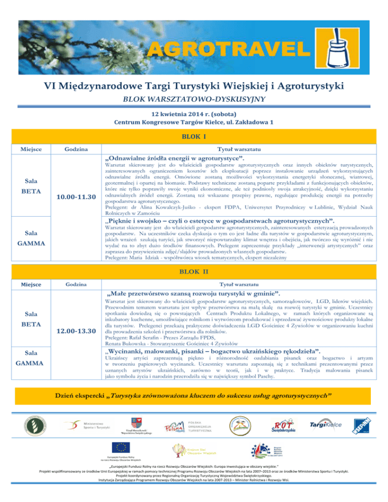 VI Międzynarodowe Targi Turystyki Wiejskiej i Agroturystyki BLOK WARSZTATOWO-DYSKUSYJNY 12 kwietnia 2014 r. (sobota) Centrum Kongresowe Targów Kielce, ul. Zakładowa 1 BLOK I Miejsce Godzina Tytuł warsztatu „Odnawialne źródła energii w agroturystyce”. Sala BETA 10.00-11.30 Warsztat skierowany jest do właścicieli gospodarstw agroturystycznych oraz innych obiektów turystycznych, zainteresowanych ograniczeniem kosztów ich eksploatacji poprzez instalowanie urządzeń wykorzystujących odnawialne źródła energii. Omówione zostaną możliwości wykorzystania energetyki słonecznej, wiatrowej, geotermalnej i opartej na biomasie. Podstawy techniczne zostaną poparte przykładami z funkcjonujących obiektów, które nie tylko poprawiły swoje wyniki ekonomiczne, ale też podniosły swoja atrakcyjność, dzięki wykorzystaniu odnawialnych źródeł energii. Zostaną też wskazane przepisy prawne, regulujące produkcję energii na potrzeby gospodarstwa agroturystycznego. Prelegent: dr Alina Kowalczyk-Juśko - ekspert FDPA, Uniwersytet Przyrodniczy w Lublinie, Wydział Nauk Rolniczych w Zamościu „Pięknie i swojsko – czyli o estetyce w gospodarstwach agroturystycznych”. Warsztat skierowany jest do właścicieli gospodarstw agroturystycznych, zainteresowanych estetyzacją prowadzonych gospodarstw. Na uczestników czeka dyskusja o tym co jest ładne dla turystów w gospodarstwie agroturystycznym, jakich wrażeń szukają turyści, jak stworzyć niepowtarzalny klimat wnętrza i obejścia, jak twórczo się wyróżnić i nie wydać na to zbyt dużo środków finansowych. Prelegent zaprezentuje przykłady „interwencji artystycznych” oraz zaprasza do przywiezienia zdjęć/slajdów prowadzonych własnych gospodarstw. Prelegent: Maria Idziak - współtwórca wiosek tematycznych, ekspert niezależny Sala GAMMA BLOK II Miejsce Godzina Tytuł warsztatu „Małe przetwórstwo szansą rozwoju turystyki w gminie”. Sala BETA 12.00-13.30 Warsztat jest skierowany do właścicieli gospodarstw agroturystycznych, samorządowców, LGD, liderów wiejskich. Przewodnim tematem warsztatu jest wpływ przetwórstwa na małą skalę na rozwój turystyki w gminie. Uczestnicy spotkania dowiedzą się o powstających Centrach Produktu Lokalnego, w ramach których organizowane są inkubatory kuchenne, umożliwiające rolnikom i wytwórcom produkować i sprzedawać żywnościowe produkty lokalne dla turystów. Prelegenci przekażą praktyczne doświadczenia LGD Gościniec 4 Żywiołów w organizowaniu kuchni dla prowadzenia szkoleń i przetwórstwa dla rolników. Prelegent: Rafał Serafin - Prezes Zarządu FPDS, Renata Bukowska - Stowarzyszenie Gościniec 4 Żywiołów „Wycinanki, malowanki, pisanki – bogactwo ukraińskiego rękodzieła”. Sala GAMMA Ukraińscy artyści zaprezentują piękno i różnorodność ozdabiania pisanek oraz bogactwo i artyzm w tworzeniu papierowych wycinanek. Uczestnicy warsztatu zapoznają się z technikami prezentowanymi przez uznanych artystów ukraińskich, zarówno w teorii, jak i w praktyce. Tradycja malowania pisanek jako symbolu życia i narodzin przerodziła się w największy symbol Paschy. Dzień ekspercki „Turystyka zrównoważona kluczem do sukcesu usług agroturystycznych” Europejski Fundusz Rolny na rzecz Rozwoju Obszarów Wiejskich „Europejski Fundusz Rolny na rzecz Rozwoju Obszarów Wiejskich: Europa inwestująca w obszary wiejskie.” Projekt współfinansowany ze środków Unii Europejskiej w ramach pomocy technicznej Programu Rozwoju Obszarów Wiejskich na lata 2007–2013 oraz ze środków Ministerstwa Sportu i Turystyki. Projekt koordynowany przez Regionalną Organizację Turystyczną Województwa Świętokrzyskiego. Instytucja Zarządzająca Programem Rozwoju Obszarów Wiejskich na lata 2007-2013 – Minister Rolnictwa i Rozwoju Wsi. Polska Organizacja Turystyczna organizuje Dzień Ekspercki w celu promocji i upowszechnienia swoich działań na rzecz turystyki wiejskiej. Warsztat dedykowany jest szerokiemu gronu odbiorców. W ramach przedsięwzięcia odbędą się następujące bloki tematyczne: Miejsce Bloki tematyczne Godzina Oferta skrojona na miarę skandynawskiego turysty 10.00 – 10.30 Portret turysty z rynku skandynawskiego. Turystyka zrównoważona w ofercie turystycznej w krajach skandynawskich. Trendy w krajach skandynawskich. Prelegent: Małgorzata Hudyma - Dyrektor POIT w Sztokholmie Wypoczynek turysty świadomego ekologicznie – a turystyka wiejska 10.30 – 11.10 Sala DELTA 11.10 – 11.30 Charakterystyka profilu "ekoturysty" (na co zwracają uwagę, jakich poszukują doświadczeń). Popyt na odpowiedzialne podróżowanie, prezentacja statystyk. Green marketing czyli jak komunikować turystykę zrównoważoną, wg modelu: komu, dlaczego, co, gdzie, jak? Standardy zrównoważonej agroturystyki. Prelegent: Anula Galewska – niezależny ekspert, doradza małym i średnim firmom z branży turystycznej w zakresie zrównoważonego rozwoju . Przerwa kawowa Ekocertyfikaty i ich rola w wzmacnianiu atrakcyjności ofert agroturystycznych 11.30 – 11.50 Przegląd certyfikatów i ekolabelingu w Europie. Prelegent: Patrycja Manthey - współpracownik Instytutu na Rzecz Ekorozwoju Podnoszenie poziomu jakości ekologicznej ofert agroturystycznych w Polsce 11.50 -12.10 Prezentacja projektu „Agroturystyka przyjazna Naturze 2000” - cykl szkoleń. Prelegent: Jolanta Kamieniecka – Niezależny Ekspert Instytutu na rzecz Ekorozwoju Wdrożenie i promocja sytemu kategoryzacji Wiejskiej Bazy Noclegowej 12.10 – 12.50 Kategoryzacja jako mechanizm wpływający na podnoszenie jakości usług i produktów w turystyce wiejskiej i agroturystyce. Prelegent: Wiesław Czerniec – prezes Zarządu Polskiej Federacji Turystyki Wiejskiej "GG" Podejście biznesowe do turystyki wiejskiej 12.50 – 13.30 Idea klastrowania. Innowacyjność. Podejście publiczno-prywatne. Prelegent: Jacek Zdrojewski - niezależny ekspert, Firma TREK Doradztwo i Szkolenia Szcze