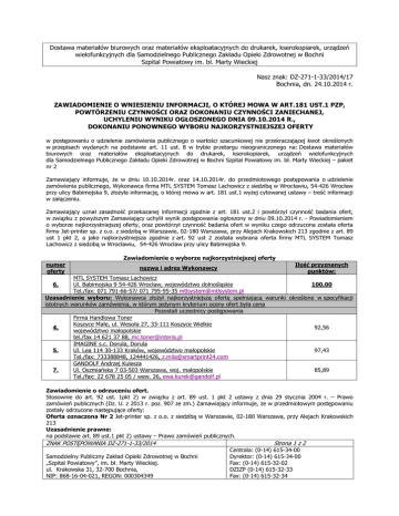 Dostawa materiałów biurowych oraz materiałów eksploatacyjnych do drukarek, kserokopiarek, urządzeń wielofunkcyjnych dla Samodzielnego Publicznego Zakładu Opieki Zdrowotnej w Bochni Szpital Powiatowy im. bł. Marty Wieckiej Nasz znak: DZ-271-1-33/2014/17 Bochnia, dn. 24.10.2014 r. ZAWIADOMIENIE O WNIESIENIU INFORMACJI, O KTÓREJ MOWA W ART.181 UST.1 PZP, POWTÓRZENIU CZYNNOŚCI ORAZ DOKONANIU CZYNNOŚCI ZANIECHANEJ, UCHYLENIU WYNIKU OGŁOSZONEGO DNIA 09.10.2014 R., DOKONANIU PONOWNEGO WYBORU NAJKORZYSTNIEJSZEJ OFERTY w postępowaniu o udzielenie zamówienia publicznego o wartości szacunkowej nie przekraczającej kwot określonych w przepisach wydanych na podstawie art. 11 ust. 8 w trybie przetargu nieograniczonego na: Dostawa materiałów biurowych oraz materiałów eksploatacyjnych do drukarek, kserokopiarek, urządzeń wielofunkcyjnych dla Samodzielnego Publicznego Zakładu Opieki Zdrowotnej w Bochni Szpital Powiatowy im. bł. Marty Wieckiej – pakiet nr 2 Zamawiający informuje, Ŝe w dniu 10.10.2014r. oraz 14.10.2014r. do przedmiotowego postępowania o udzielenie zamówienia publicznego, Wykonawca firma MTL SYSTEM Tomasz Lachowicz z siedzibą w Wrocławiu, 54-426 Wrocław przy ulicy Babimojska 9, złoŜyła informację, o której mowa w art. 181 ust.1 wyŜej cytowanej ustawy – treść informacji w załączeniu. Zamawiający uznał zasadność przekazanej informacji zgodnie z art. 181 ust.2 i powtórzył czynność badania ofert, w związku z powyŜszym Zamawiający uchylił wynik postępowania ogłoszony w dniu 09.10.2014 r. - Powiadomieniem o wyborze najkorzystniejszej oferty, oraz powtórzył czynność badania ofert w wyniku czego odrzucona została oferta firmy Jet-printer sp. z o.o. z siedzibą w Warszawie, 02-180 Warszawa, przy Alejach Krakowskich 213 zgodnie z art. 89 ust 1 pkt 2, a jako najkorzystniejsza zgodnie z art. 92 ust 2 została wybrana oferta firmy MTL SYSTEM Tomasz Lachowicz z siedzibą w Wrocławiu, 54-426 Wrocław przy ulicy Babimojska 9. Zawiadomienie o wyborze najkorzystniejszej oferty numer oferty nazwa i adres Wykonawcy Ilość przyznanych punktów: MTL SYSTEM Tomasz Lachowicz 100,00 Ul. Babimojska 9 54-426 Wrocław, województwo dolnośląskie Tel./fax: 071 791-66-57/ 071 795-95-35 [email protected] Uzasadnienie wyboru: Wykonawca złoŜył najkorzystniejszą ofertę spełniającą warunki określone w specyfikacji istotnych warunków zamówienia, w którym jedynym kryterium oceny ofert była cena Pozostali uczestnicy postępowania Firma Handlowa Toner Koszyce Małe, ul. Wesoła 27, 33-111 Koszyce Wielkie 4. 92,56 województwo małopolskie tel./fax 14 621 37 88, [email protected] IMAGINE s.c. Dorula, Dorula 5. 97,43 Ul. Lea 114 30-133 Kraków, województwo małopolskie Tel./fax: 733388848, 124441426, [email protected] GANDOLF Andrzej Kulesza 7. Ul. Oszmiańska 7 03-503 Warszawa, woj. małopolskie 85,89 Tel./fax: 22 678 25 05 / wew. 26, [email protected] 6. Zawiadomienie o odrzuceniu ofert. Stosownie do art. 92 ust. 1pkt 2) w związku z art. 89 ust. 1 pkt 2 ustawy z dnia 29 stycznia 2004 r. – Prawo zamówień publicznych (Dz. U. z 2013 r. poz. 907 ze zm.) Zamawiający informuje, Ŝe w przedmiotowym postępowaniu zostały odrzucone następujące oferty: Oferta oznaczona Nr 2 Jet-printer sp. z o.o. z siedzibą w Warszawie, 02-180 Warszawa, przy Alejach Krakowskich 213 Uzasadnienie prawne: na podstawie art. 89 ust.1 pkt 2) ustawy – Prawo zamówień publicznych. ZNAK POSTĘPOWANIA DZ-271-1-33/2014 Samodzielny Publiczny Zakład Opieki Zdrowotnej w Bochni „Szpital Powiatowy”, im. bł. Marty Wieckiej. ul. Krakowska 31, 32-700 Bochnia, NIP: 868-16-04-021, REGON: 000304349 Strona 1 z 2 Centrala: (0-14) 615-34-00 Dyrektor: (0-14) 615-34-00 Fax: (0-14) 615-32-02 DZIZP (0-14) 615-32-33 Fax: (0-14) 615-32-34 Dostawa materiałów biurowych oraz materiałów eksploatacyjnych do drukarek, kserokopiarek, urządzeń wielofunkcyjnych dla Samodzielnego Publicznego Zakładu Opieki Zdrowotnej w Bochni Szpital Powiatowy im. bł. Marty Wieckiej Uzasadnienie faktyczne: Przyczyną odrzucenia oferty z prowadzonego postępowania w sprawie udzielenia zamówienia publicznego jest fakt, Ŝe oferta nie odpowiada treści Specyfikacji Istotnych Warunków Zamówienia. Zgodnie z zapisami SIWZ Zamawiający wymagał: • dostarczenia materiałów nowych i nieregenerowanych wykonanych z części które nie były nigdy wcześniej uŜywane o parametrach technicznych nie gorszych niŜ zalecane przez producenta urządzenia, • w ramach pozycji 1, 9, 13-14, 30, 33-35, 46-49 naleŜy zaoferować oryginalne materiały eksploatacyjne tj. materiały eksploatacyjne fabrycznie nowe, pochodzące od producenta sprzętu do którego są przeznaczone, do wytworzenia których zastosowano wcześniej nieuŜywalne części i komponenty. Zgodnie z art. 29 ust 3 pzp zamawiający dopuszcza dostawę produktów równowaŜnych, przy czym przez produkt równowaŜny rozumie „produkt fabrycznie nowy do wytworzenia którego zastosowano nieuŜywalne części i komponenty, kompatybilny ze sprzętem o parametrach nie gorszych niŜ produkt oryginalny w zakresie pojemności, wydajności i jakości” Wykonawca, który składa ofertę równowaŜną zobowiązany jest zgodnie z dyspozycją art. 30 ust. 5 ustawy Prawo zamówień publicznych poinformować Zamawiającego o fakcie złoŜenia oferty równowaŜnej i wykazać, Ŝe oferowane dostawy spełniają wymogi Zamawiającego. UDOWODNIENIE RÓWNOWAśNOŚCI LEśY PO STRONIE WYKONAWCY. Wskazanie przez Wykonawcę rozwiązań równowaŜnych w ofercie bez przedstawienia dokumentów na potwierdzenie równowaŜności spowoduje wezwanie Wykonawcę do przedstawienia brakujących dokumentów w trybie art. 26 ust. 3 w związku z art. 25 ust. 1 ustawy Prawo zamówień publicznych • zaoferowania materiałów eksploatacyjnych nie naruszających praw producenta oryginalnych tonerów, tuszy oraz procesu produkcji w szczególności patentowych • zamontowanie i uŜywanie dostarczon