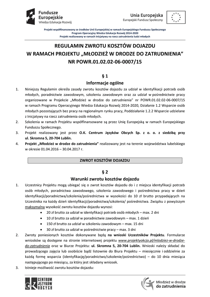 Projekt współfinansowany ze środków Unii Europejskiej w ramach Europejskiego Funduszu Społecznego Program Operacyjny Wiedza Edukacja Rozwój 2014-2020 Projekt realizowany w ramach Inicjatywy na rzecz zatrudnienia ludzi młodych REGULAMIN ZWROTU KOSZTÓW DOJAZDU W RAMACH PROJEKTU „MŁODZIEŻ W DRODZE DO ZATRUDNIENIA” NR POWR.01.02.02-06-0007/15 §1 Informacje ogólne 1. 2. 3. 4. Niniejszy Regulamin określa zasady zwrotu kosztów dojazdu za udział w identyfikacji potrzeb osób młodych, poradnictwie zawodowym, szkoleniu zawodowym oraz za udział w pośrednictwie pracy organizowane w Projekcie „Młodzież w drodze do zatrudnienia” nr POWR.01.02.02-06-0007/15 w ramach Programu Operacyjnego Wiedza Edukacja Rozwój 2014-2020, Działanie 1.2 Wsparcie osób młodych pozostających bez pracy na regionalnym rynku pracy, Poddziałanie 1.2.2 Wsparcie udzielane z Inicjatywy na rzecz zatrudnienia osób młodych. Szkolenia w ramach Projektu współfinansowane są przez Unię Europejską w ramach Europejskiego Funduszu Społecznego. Projekt realizowany jest przez O.K. Centrum Języków Obcych Sp. z o. o. z siedzibą przy ul. Skromna 5, 20-704 Lublin. Projekt „Młodzież w drodze do zatrudnienia” realizowany jest na terenie województwa lubelskiego w okresie 01.04.2016 – 30.04.2017 r. ZWROT KOSZTÓW DOJAZDU §2 Warunki zwrotu kosztów dojazdu 1. 2. 3. Uczestnicy Projektu mogą ubiegać się o zwrot kosztów dojazdu do i z miejsca identyfikacji potrzeb osób młodych, poradnictwa zawodowego, szkolenia zawodowego i pośrednictwa pracy w dzień identyfikacji/poradnictwa/szkolenia/pośrednictwa w wysokości do 10 zł brutto przypadających na Uczestnika na każdy dzień identyfikacji/poradnictwa/szkolenia/ pośrednictwa. Związku z powyższym maksymalna wysokość zwrotu kosztów dojazdu wynosi: 20 zł brutto za udział w identyfikacji potrzeb osób młodych – max. 2 dni 10 zł brutto za udział w poradnictwie zawodowym – max. 1 dzień 150 zł brutto za udział w szkoleniu zawodowym – max. 15 dni 30 zł brutto za udział w pośrednictwie pracy – max. 3 dni Zwroty poniesionych kosztów dokonywane będą na wnioski Uczestników Projektu. Formularze wniosków są dostępne na stronie internetowej projektu www.projektyokcjo.pl/mlodziez-w-drodzedo-zatrudnienia oraz w Biurze Projektu: ul. Skromna 5, 20-704 Lublin. Wnioski należy składać do prowadzącego zajęcia lub osobiście bądź listownie do Biura Projektu – miesięcznie i oddzielnie za każdą formę wsparcia (identyfikację/poradnictwo/szkolenie/pośrednictwo) – do 10 dnia miesiąca następującego po miesiącu, za który jest składany wniosek. Istnieje możliwość zwrotu kosztów dojazdu: Projekt współfinansowany ze środków Unii Europejskiej w ramach Europejskiego Funduszu Społecznego Program Operacyjny Wiedza Edukacja Rozwój 2014-2020 Projekt realizowany w ramach Inicjatywy na rzecz zatrudnienia ludzi młodych 4. 5. komunikacją publiczną, samochodem prywatnym, dowożenie Uczestnika Projektu przez osoby trzecie samochodem prywatnym Istnieje możliwość jednokrotnego uzupełnienia ewentualnych braków w wymaganych dokumentach. Wnioski składane po terminie i niekompletne dokumenty nie będą brane pod uwagę. Liczba Uczestników, którzy mogą skorzystać ze zwrotu kosztów dojazdu jest ograniczona i mogą go otrzymać jedynie 40% Uczestników Projektu z każdej grupy. W przypadku złożenia większej ilości wniosków, w pierwszej kolejności będą brane pod uwagę osoby dojeżdżające spoza miejsca odbywania się danej formy wsparcia, bądź osoby ponoszące zbyt wysokie koszty dojazdu. §3 Dokumenty Koszty podróży komunikacją publiczną Uczestnikom Projektu przysługuje zwrot w wysokości udokumentowanych kosztów przejazdu najtańszym środkiem komunikacji publicznej na danej trasie* (koszt wynikający z załączonych biletów), jednak nie więcej niż 10 zł brutto/dzień identyfikacji/poradnictwa/szkolenia/pośrednictwa. Wymagane dokumenty: 1) poprawnie wypełniony wniosek Uczestnika Projektu o zwrot kosztów dojazdu komunikacją publiczną, 2) udokumentowanie poniesienia kosztów przejazdu (w obie strony w dniu identyfikacji/poradnictwa/szkolenia/pośrednictwa) w postaci: biletów komunikacji publicznej (bilety kolejowe II klasy, bilety PKS, bilety komunikacji miejskiej i podmiejskiej – jednorazowych lub długoterminowych np. imiennych miesięcznych rozliczanych odpowiednio za czas trwania poradnictwa/szkolenia/pośrednictwa (koszt biletu miesięcznego/20 dni x ilość dni identyfikacji/poradnictwa/szkolenia/pośrednictwa)) Bilety muszą być niezniszczone i czytelne. W przypadku znacznego stopnia ich uszkodzenia Organizator nie będzie zwracał za nie środków finansowych. Koszty podróży samochodem prywatnym Uczestnikom Projektu przysługuje zwrot w wysokości odpowiadającej iloczynowi ilości przejazdów i ceny najtańszego biletu transportu publicznego na danej trasie*, jednak nie więcej niż 10 zł brutto/ dzień identyfikacji/poradnictwa/szkolenia/pośrednictwa. Wymagane dokumenty: 1) poprawnie wypełniony wniosek Uczestnika Projektu o zwrot kosztów dojazdu samochodem prywatnym, 2) kserokopia prawa jazdy oraz kserokopia dowodu rejestracyjnego pojazdu z dopiskiem „Potwierdzam za zgodność z oryginałem (imię i nazwisko, podpis Uczestnika Projektu)” (w przypadku gdy Uczestnik Projektu nie widnieje jeszcze na dowodzie rejestracyjnym jako Projekt współfinansowany ze środków Unii Europejskiej w ramach Europejskiego Funduszu Społecznego Program Operacyjny Wiedza Edukacja Rozwój 2014-2020 Projekt realizowany w ramach Inicjatywy na rzecz zatrudnienia ludzi młodych właściciel lub współwłaściciel pojazdu należy dołączyć kserokopię umowy kupna-sprzedaży pojazdu) (poświadczone za zgodność z oryginałem) 3) zaświadczenie przewoźnika wykonującego usługi w zakresie komunikacji publicznej o cenie najtańszego biletu na danej trasie lub w przypadku odmowy wydania przez pr