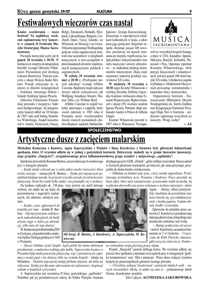 NOWA gazeta gostyñska 39/07 KULTURA 9 Festiwalowych wieczorów czas nasta³ Koniec oczekiwania rusza festiwal! Na najbli¿szy weekend zaplanowano trzy koncerty w ramach II Festiwalu Muzyki Oratoryjnej Musica Sacromontana. Pocz¹tek muzycznej uczty ju¿ w pi¹tek 28 wrzenia o 20:30. W barokowym wnêtrzu wiêtogórskiej bazyliki wyst¹pi Orkiestra Filharmonii Poznañskiej pod dyrekcj¹ £ukasza Borowicza. Podczas koncertu z okazji 80-lecia Radia Merkury Poznañ us³yszymy m. in. utwory ze zbiorów wiêtogórskich Symfoniê Antoniego Habela i Grande Symfoniê Ignaza Pleyela. Orkiestra Filharmonii Poznañskiej powsta³a z inicjatywy Tadeusza Szeligowskiego. Jej inauguracyjny koncert odby³ siê 10 listopada 1947 roku pod batut¹ Stanis³awa Wis³ockiego. Zespó³ koncertowa³ w Austrii, Niemczech, Francji, Belgii, Szwajcarii, Holandii, Hiszpanii, Luksemburgu, Bu³garii, Czechach, Danii, Turcji, Islandii, we W³oszech, na S³owacji i na Litwie. Orkiestra reprezentuje Wielkopolskê podczas wielu zagranicznych festiwali oraz uczestniczy w projektach muzycznych, w tym szczególnie w prawykonaniach utworów wspó³czesnych kompozytorów polskich i zagranicznych. W sobotê 29 wrzenia równie¿ o 20:30 z Przebojami muzyki sakralnej wyst¹pi Affabre Concinui. Bêdziemy mogli us³yszeæ utwory takich wykonawców jak Wolfgang Amadeusz Mozart, Thomas Tallis, czy William Byrd. Affabre Concinui to zespó³ wokalny piewaj¹cy a cappella, który zosta³ za³o¿ony w 1983 roku w Poznaniu przez wychowanków dwóch znanych poznañskich chórów ch³opiêcomêskich: Stefana Stu- ligrosza i Jerzego Kurczewskiego. Koncertuje w najwiêkszych orodkach kulturalnych w kraju, a tak¿e poza jego granicami. Repertuar zespo³u obejmuje ponad 300 utworów, pocz¹wszy od muzyki renesansu po muzykê wspó³czesn¹, kolêdy polskie i ró¿nych narodów oraz ¿arty muzyczne i utwory orkiestrowe ze znakomit¹ imitacj¹ instrumentów muzycznych. Du¿¹ czêæ repertuaru stanowi¹ przeboje rozrywkowe XX wieku. W niedzielê 30 wrzenia o 18:30 zagra Kwartet Wilanowski z wybitn¹ flecistk¹ El¿biet¹ Gajewsk¹Gadzina i wirtuozem oboju Tytusem Wojnowiczem. Bêdzie to koncert z okazji 250. rocznicy urodzin Ignaza Pleyela. Patronat obj¹³ ambasador Austrii w Polsce dr Alfreda Längle. Kwartet Wilanowski powsta³ w 1967 roku w Warszawie. Wystêpo- wa³ we wszystkich krajach Europy, a tak¿e w USA, Kanadzie, Japonii, Meksyku, Brazylii, Kolumbii, Wenezueli i Peru. Ogromny repertuar Kwartetu Wilanowskiego, obok pozycji klasycznych i romantycznych zawiera ponad 100 dzie³ muzyki XX wieku. Cz³onkowie zespo³u wyk³adaj¹ w Akademiach Muzycznych prowadz¹c instrumentalne i kameralne klasy mistrzowskie. Organizatorzy festiwalu Stowarzyszenie Mi³oników Muzyki wiêtogórskiej im. Józefa Zeidlera oraz Kongregacja Oratorium wiêtego Filipa Neri w Gostyniu serdecznie zapraszaj¹ wszystkich na koncerty. Wstêp wolny! OAJ SPO£ECZEÑSTWO Artystyczne dusze z zaciêciem malarskim Michalina Konieczna z Kunowa, Agata Superczyñska z Piasków i Ilona Karolewicz z Siemowa by³y g³ównymi bohaterkami spotkania, które 11 wrzenia odby³o siê w jednej z gostyñskich kawiarni. Dziewczyny znalaz³y siê w gronie laureatów innowacyjnego projektu StacjaArt, zorganizowanego przez kilkunastoosobow¹ grupê uczniów z miejscowego ogólniaka. Spotkanie prowadzi³a Romana Bartosz, przewodnicz¹ca 6-osobowego dzia³aj¹cego przy GOK Hutnik, gdzie szlifuje swój talent. Bierze udzia³ w licznych plenerach malarskich, po których, jak sama przyznaje, przyjury w kategorii plastyka. Ka¿dy m³ody cz³owiek ma w sobie jakie zasoby twórczoci, które je¿d¿a do domu bardzo zrelaksowana. Odda³am na konkurs piêæ prac, cztery zosta³y nagrodzone. Przedtrzeba rozwijaæ zaznaczy³a R. Bartosz. Sztuka jest najstarszym pomnikiem ka¿dego narodu, bo przecie¿ wszystko zaczê³o siê od twórczoci stawiaj¹ architekturê m.in. Poznania i Krakowa. Prace powsta³y na plastycznej. wiat bez sztuki by³by nudny i nie posun¹³by siê w technice. bazie zdjêæ, które mnie zainspirowa³y i przenios³am widok na kartkê. S¹ Na konkurs wp³ynê³o ok. 130 prac, wiêc jurorzy nie mieli ³atwego to g³ównie akwarelki oraz prace wykonane w technice mieszanej mówi Agata. Malujê odk¹d pamiêtam. wyboru, ale uda³o im siê dojæ do Gdy chodzi³am do przedszkola inne porozumienia i nagrodziæ najlepdzieci bawi³y siê, a ja siada³am przy szych, ich zdaniem, m³odych artystole z kartk¹ papieru, bra³am o³óstów. wek, kredki i rysowa³am. Ka¿da z prac zg³oszonych do Zg³oszone do projektu prace auprojektu jest inna doda³a R. Bartorstwa I. Karolewicz przedstawiaj¹ tosz. Najwiêcej jest prac realistycztañcz¹c¹ dziewczynê, len¹ drogê oraz nych, ma³o abstrakcyjnych, ale ka¿dy miasteczko po³o¿one nad wod¹. artysta siêga w koñcu po abstrak Malujê praktycznie od zawsze cjê, tylko musi do tego dojrzeæ. mówi I. Karolewicz, uczennica GimM. Konieczna jest absolwentk¹ ZSO w Gostyniu, od padziernika studio- Od lewej: R. Bartosz, I. Karolewicz, A. Superczyñska, M. Ko- nazjum nr 2 w Gostyniu. Uczêszczam do Klub Plastyka Amatora, waæ bêdzie filologiê polsk¹ na UAM nieczna gdzie uczê siê wielu rzeczy. Niedaww Poznaniu. Zawsze lubi³am czytaæ ksi¹¿ki. Jêzyk polski by³ moim ulubionym no wykona³am swoj¹ pierwsz¹ pracê olejn¹. Projekt StacjaArt powoli dobiega koñca. We wrzeniu odby³y siê przedmiotem, a malarstwo traktujê jako hobby. Naprzeciwko kwatery w Poznaniu bêdê mia³a pracowniê plastyczn¹, wiêc z pewnoci¹ nie zapo- jeszcze dwa spotkania z autorami zwyciêskich prac w kategoriach grafimnê o swojej pasji i nie skoñczê tylko na czytaniu ksi¹¿ek mieje siê ka komputerowa oraz film i animacja. Przez okres wakacji wystawa Michalina. Ostatnio najczêciej malujê farbami olejnymi, ale lubiê te¿ kr¹¿y³a po poszczególnych gminach naszego powiatu. Chcielimy pokazaæ kreatywnoæ i potencja³ m³odych osób naszkicowaæ. Sztuka jest dla mnie 
