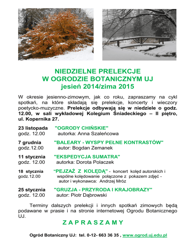 NIEDZIELNE PRELEKCJE W OGRODZIE BOTANICZNYM UJ jesień 2014/zima 2015 W okresie jesienno-zimowym, jak co roku, zapraszamy na cykl spotkań, na które składają się prelekcje, koncerty i wieczory poetycko-muzyczne. Prelekcje odbywają się w niedziele o godz. 12.00, w sali wykładowej Kolegium Śniadeckiego – II piętro, ul. Kopernika 27. 23 listopada godz. 12.00 "OGRODY CHIŃSKIE" autorka: Anna Szaleńcowa 7 grudnia godz.12.00 "BALEARY - WYSPY PEŁNE KONTRASTÓW" autor: Bogdan Zemanek 11 stycznia godz. 12.00 "EKSPEDYCJA SUMATRA" autorka: Dorota Polaczek 18 stycznia godz.12.00 "PEJZAŻ Z KOLĘDĄ" - koncert kolęd autorskich i wspólne kolędowanie połączone z pokazem zdjęć autor i wykonawca: Andrzej Mróz 25 stycznia godz. 12.00 "GRUZJA - PRZYRODA I KRAJOBRAZY" autor: Piotr Dąbrowski Terminy dalszych prelekcji i innych spotkań zimowych będą podawane w prasie i na stronie internetowej Ogrodu Botanicznego UJ. ZAPRASZAMY Ogród Botaniczny UJ: tel. 0-12- 663 36 35 , www.ogrod.uj.edu.pl