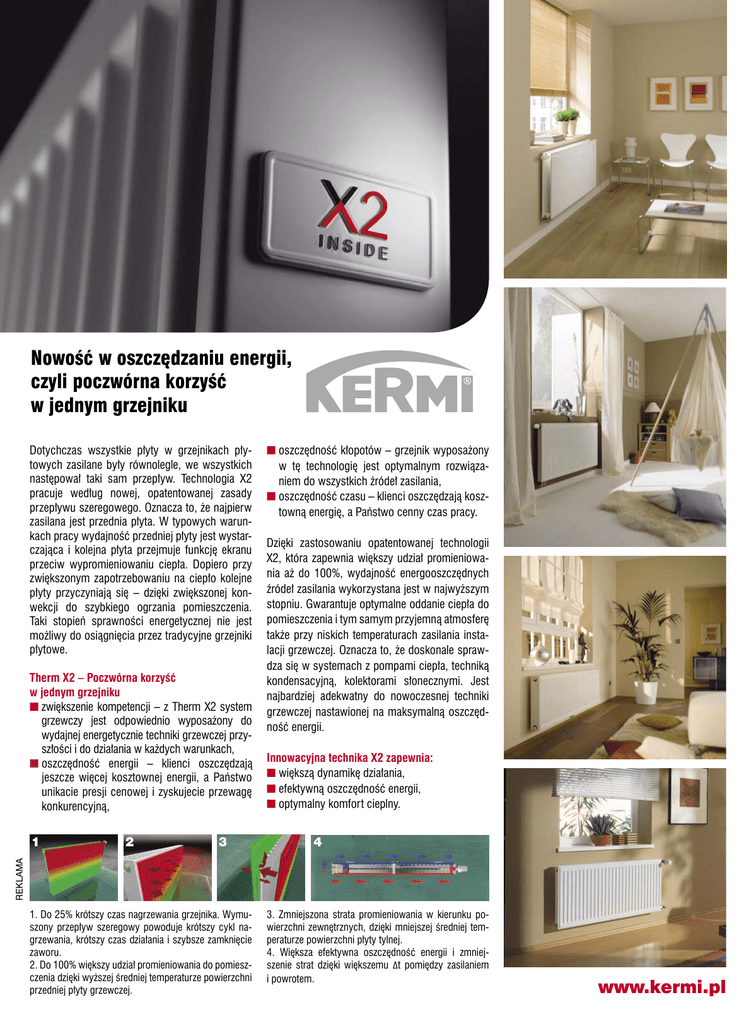 Nowość w oszczędzaniu energii, czyli poczwórna korzyść w jednym grzejniku Dotychczas wszystkie płyty w grzejnikach płytowych zasilane były równolegle, we wszystkich następował taki sam przepływ. Technologia X2 pracuje według nowej, opatentowanej zasady przepływu szeregowego. Oznacza to, że najpierw zasilana jest przednia płyta. W typowych warunkach pracy wydajność przedniej płyty jest wystarczająca i kolejna płyta przejmuje funkcję ekranu przeciw wypromieniowaniu ciepła. Dopiero przy zwiększonym zapotrzebowaniu na ciepło kolejne płyty przyczyniają się – dzięki zwiększonej konwekcji do szybkiego ogrzania pomieszczenia. Taki stopień sprawności energetycznej nie jest możliwy do osiągnięcia przez tradycyjne grzejniki płytowe. Therm X2 – Poczwórna korzyść w jednym grzejniku ■ zwiększenie kompetencji – z Therm X2 system grzewczy jest odpowiednio wyposażony do wydajnej energetycznie techniki grzewczej przyszłości i do działania w każdych warunkach, ■ oszczędność energii – klienci oszczędzają jeszcze więcej kosztownej energii, a Państwo unikacie presji cenowej i zyskujecie przewagę konkurencyjną, 2 3 Dzięki zastosowaniu opatentowanej technologii X2, która zapewnia większy udział promieniowania aż do 100%, wydajność energooszczędnych źródeł zasilania wykorzystana jest w najwyższym stopniu. Gwarantuje optymalne oddanie ciepła do pomieszczenia i tym samym przyjemną atmosferę także przy niskich temperaturach zasilania instalacji grzewczej. Oznacza to, że doskonale sprawdza się w systemach z pompami ciepła, techniką kondensacyjną, kolektorami słonecznymi. Jest najbardziej adekwatny do nowoczesnej techniki grzewczej nastawionej na maksymalną oszczędność energii. Innowacyjna technika X2 zapewnia: ■ większą dynamikę działania, ■ efektywną oszczędność energii, ■ optymalny komfort cieplny. 4 reklama 1 ■ oszczędność kłopotów – grzejnik wyposażony w tę technologię jest optymalnym rozwiązaniem do wszystkich źródeł zasilania, ■ oszczędność czasu – klienci oszczędzają kosztowną energię, a Państwo cenny czas pracy. 1. Do 25% krótszy czas nagrzewania grzejnika. Wymuszony przepływ szeregowy powoduje krótszy cykl nagrzewania, krótszy czas działania i szybsze zamknięcie zaworu. 2. Do 100% większy udział promieniowania do pomieszczenia dzięki wyższej średniej temperaturze powierzchni przedniej płyty grzewczej. 3. Zmniejszona strata promieniowania w kierunku powierzchni zewnętrznych, dzięki mniejszej średniej temperaturze powierzchni płyty tylnej. 4. Większa efektywna oszczędność energii i zmniejszenie strat dzięki większemu Dt pomiędzy zasilaniem i powrotem. www.kermi.pl
