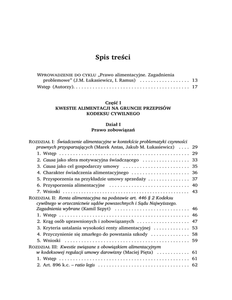 Spis treści Wprowadzenie do cyklu „Prawo alimentacyjne. Zagadnienia problemowe” (J.M. Łukasiewicz, I. Ramus) . . . . . . . . . . . . . . . . . . 13 Wstęp (Autorzy). . . . . . . . . . . . . . . . . . . . . . . . . . . . . . . . . . . . . . . . . . 17 Część I Kwestie alimentacji na gruncie przepisów kodeksu cywilnego Dział I Prawo zobowiązań Rozdział I: Świadczenie alimentacyjne w kontekście problematyki czynności prawnych przysparzających (Marek Antas, Jakub M. Łukasiewicz) . . . . 29 1. Wstęp . . . . . . . . . . . . . . . . . . . . . . . . . . . . . . . . . . . . . . . . . . . . . . . 29 2. Causa jako sfera motywacyjna świadczącego . . . . . . . . . . . . . . . . . 33 3. Causa jako cel gospodarczy umowy . . . . . . . . . . . . . . . . . . . . . . . . 35 4. Charakter świadczenia alimentacyjnego . . . . . . . . . . . . . . . . . . . . . 36 5. Przysporzenia na przykładzie umowy sprzedaży . . . . . . . . . . . . . . . 37 6. Przysporzenia alimentacyjne . . . . . . . . . . . . . . . . . . . . . . . . . . . . . 40 7. Wnioski . . . . . . . . . . . . . . . . . . . . . . . . . . . . . . . . . . . . . . . . . . . . . . . . . 43 Rozdział II: Renta alimentacyjna na podstawie art. 446 § 2 Kodeksu cywilnego w orzecznictwie sądów powszechnych i Sądu Najwyższego. Zagadnienia wybrane (Kamil Szpyt) . . . . . . . . . . . . . . . . . . . . . . . . . . . 46 1. Wstęp . . . . . . . . . . . . . . . . . . . . . . . . . . . . . . . . . . . . . . . . . . . . . . . 46 2. Krąg osób uprawnionych i zobowiązanych . . . . . . . . . . . . . . . . . . . 47 3. Kryteria ustalania wysokości renty alimentacyjnej . . . . . . . . . . . . . 53 4. Przyczynienie się zmarłego do powstania szkody . . . . . . . . . . . . . . 58 5. Wnioski . . . . . . . . . . . . . . . . . . . . . . . . . . . . . . . . . . . . . . . . . . . . . 59 Rozdział III: Kwestie związane z obowiązkiem alimentacyjnym w kodeksowej regulacji umowy darowizny (Maciej Pięta) . . . . . . . . . . . . 61 1. Wstęp . . . . . . . . . . . . . . . . . . . . . . . . . . . . . . . . . . . . . . . . . . . . . . . 61 2. Art. 896 k.c. – ratio legis . . . . . . . . . . . . . . . . . . . . . . . . . . . . . . . . . 62 6 Spis treści 3. Zmiana stanu majątku darczyńcy w świetle art. 896 k.c. . . . . . . . . 63 4. Wykonanie umowy darowizny w rozumieniu art. 896 k.c. . . . . . . . 64 5. Uszczerbek utrzymania darczyńcy . . . . . . . . . . . . . . . . . . . . . . . . . 67 6. Niemożność wykonania obowiązków alimentacyjnych przez darczyńcę . . . . . . . . . . . . . . . . . . . . . . . . . . . . . . . . . . . . . . . 68 7. Podmiot uprawniony do odwołania darowizny . . . . . . . . . . . . . . . . 69 8. Zakres odwołania darowizny . . . . . . . . . . . . . . . . . . . . . . . . . . . . . 70 9. Art. 897 k.c. – uwagi wstępne . . . . . . . . . . . . . . . . . . . . . . . . . . . . 74 10. Niedostatek w świetle art. 897 k.c. . . . . . . . . . . . . . . . . . . . . . . . . . 74 11. Stan wzbogacenia . . . . . . . . . . . . . . . . . . . . . . . . . . . . . . . . . . . . . . 76 12. Sposób wykonania obowiązku z art. 897 k.c. . . . . . . . . . . . . . . . . . 76 13. Dziedziczność i wygaśnięcie . . . . . . . . . . . . . . . . . . . . . . . . . . . . . . 77 14. Wielość obdarowanych . . . . . . . . . . . . . . . . . . . . . . . . . . . . . . . . . . 78 15. Dochodzenie roszczeń z art. 897 k.c. a nadużycie prawa w rozumieniu art. 5 k.c. . . . . . . . . . . . . . . . . . . . . . . . . . . . . . . . . . 79 16. Wykonanie obowiązku z art. 897 k.c. a niewdzięczność obdarowanego w rozumieniu art. 898 § 1 k.c. . . . . . . . . . . . . . . . . 80 17. Wnioski . . . . . . . . . . . . . . . . . . . . . . . . . . . . . . . . . . . . . . . . . . . . . 82 Rozdział IV: Umowy o funkcji alimentacyjnej (renta i dożywocie) (Alicja Moskała-Dudek) . . . . . . . . . . . . . . . . . . . . . . . . . . . . . . . . . . . . . 84 1. Wstęp . . . . . . . . . . . . . . . . . . . . . . . . . . . . . . . . . . . . . . . . . . . . . . . 84 2. Umowa renty – charakterystyka . . . . . . . . . . . . . . . . . . . . . . . . . . . 85 3. Umowa o dożywocie – charakterystyka . . . . . . . . . . . . . . . . . . . . . 89 4. Zamiana dożywocia na rentę . . . . . . . . . . . . . . . . . . . . . . . . . . . . . 93 5. Zmiana wysokości dożywotniej renty . . . . . . . . . . . . . . . . . . . . . . . 95 6. Funkcja alimentacyjna renty i dożywocia . . . . . . . . . . . . . . . . . . . . 98 7. Wpływ świadczeń spełnianych w ramach umów: renty i dożywocia na obowiązek alimentacyjny . . . . . . . . . . . . . . . . . . . 102 8. Wnioski . . . . . . . . . . . . . . . . . . . . . . . . . . . . . . . . . . . . . . . . . . . . 107 Dział II Prawo spadkowe Rozdział V: Alimenty w miejsce zachowku? Uwagi na tle ochrony osób bliskich spadkodawcy w perspektywie rekodyfikacji polskiego prawa cywilnego (Mariusz Załucki) . . . . . . . . . . . . . . . . . . . . . . . . . . . . . . . . 113 1. Wstęp . . . . . . . . . . . . . . . . . . . . . . . . . . . . . . . . . . . . . . . . . . . . . . 113 2. Ochrona osób bliskich spadkodawcy . . . . . . . . . . . . . . . . . . . . . . 115 Spis treści 7 3. Rozwiązania polskie . . . . . . . . . . . . . . . . . . . . . . . . . . . . . . . . . . . 117 4. Co dalej? . . . . . . . . . . . . . . . . . . . . . . . . . . . . . . . . . . . . . . . . . . . 120 5. Wnioski . . . . . . . . . . . . . . . . . . . . . . . . . . . . . . . . . . . . . . . . . . . . 124 Rozdział VI: Niedostatek dziadków spadkodawcy (Agnieszka Zwierzchowska) . . . . . . . . . . . . . . . . . . . . . . . . . . . . . . . . . . . . . . . . 126 1. Wstęp . . . . . . . . . . . . . . . . . . . . . . . . . . . . . . . . . . . . . . . . . . . . . . 126 2. Zagadnienia ogólne . . . . . . . . . . . . . . . . . . . . . . . . . . . . . . . . . . . 126 3. Krąg podmiotów uprawnionych . . . . . . . . . . . . . . . . . . . . . . . . . . 128 4. Krąg podmiotów zobowiązanych . . . . . . . . .