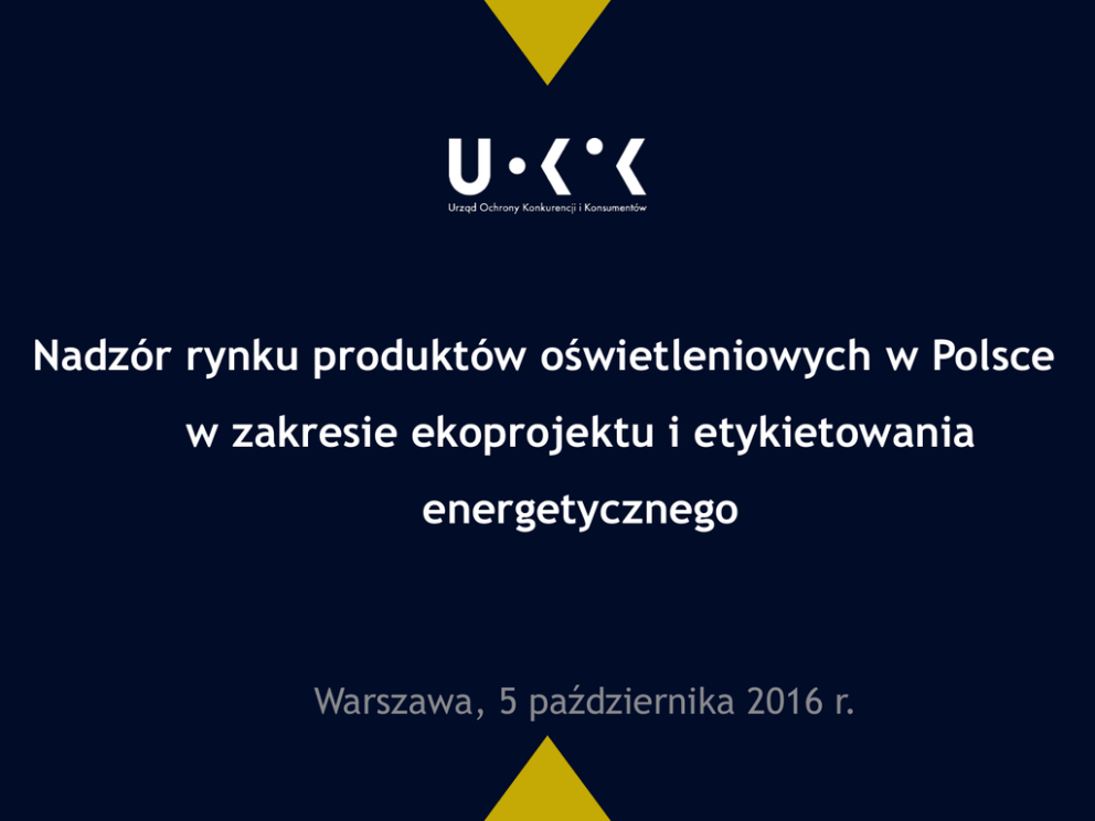 Nadzór rynku produktów oświetleniowych w Polsce w zakresie ekoprojektu i etykietowania energetycznego Warszawa, 5 października 2016 r. Organy nadzoru rynku w Polsce Państwowa Inspekcja Pracy Prezes UKE Prezes WUG Administracja miar Inspekcja Handlowa Prezes Urzędu Ochrony Konkurencji i Konsumentów Inspekcja Ochrony Środowiska Organy nadzoru budowlanego Inspekcja Transportu Drogowego Prezes UTK Dyrektorzy UM Podstawa prawna - ekoprojekt • Dyrektywa Parlamentu Europejskiego i Rady 2009/125/WE z dnia 21 października 2009 r. ustanawiająca ogólne zasady ustalania wymogów dotyczących ekoprojektu dla produktów związanych z energią (Dz. Urz. UE L 285 z 31.10.2009 r., str. 10), • Rozporządzenie Ministra Gospodarki z dnia 17 grudnia 2010 r. w sprawie procedur oceny zgodności wyrobów wykorzystujących energię oraz ich oznakowania (Dz. U. z 2011r. Nr 8, poz. 32), • Ustawa z dnia 30 sierpnia 2002 r. o systemie oceny zgodności (t.j. Dz. U. z 2016 r., poz. 655). 3 Obowiązujące środki wykonawcze - ekoprojekt • Rozporządzenie Komisji (WE) nr 244/2009 z 18.03.2009 r. w sprawie wykonania dyrektywy 2005/32/WE Parlamentu Europejskiego i Rady w odniesieniu do wymogów ekoprojektu dla bezkierunkowych lamp do użytku domowego (Dz. Urz. UE L 76 z 24.03.2009 r., str. 3) oraz zmiana Rozporządzeniem Komisji (WE) nr 859/2009 (Dz. Urz. UE L z 19.09.2009 r., Nr 247, str. 3) oraz zmiana Rozporządzeniem Komisji (UE) nr 2015/1428 (Dz. Urz. UE L 224 z 27.08.2015, str. 1); stosowane od 1 września 2009 r. • Rozporządzenie Komisji (UE) nr 1194/2012 z 12.12.2012 r. w sprawie dyrektywy 2009/125/WE Parlamentu Europejskiego i Rady w odniesieniu do wymogów ekoprojektu dla lamp kierunkowych, lamp z diodami elektroluminescencyjnymi (Dz. Urz. UE L 342 z 14.12.2012 r., str. 1) oraz zmiana Rozporządzeniem Komisji (UE) nr 2015/1428 (Dz. Urz. UE L 224 z 27.08.2015, str. 1); stosowane od 1 września 2013 r. 4 Wyniki kontroli – ekoprojekt – kontrolowani przedsiębiorcy przez Inspekcję Handlową w II kwartale 2015 r. sklepy wielkopowierzchniowe 21 hurtownie 44 placówki detaliczne 25 5 Wyniki kontroli – ekoprojekt – pochodzenie skontrolowanych produktów 2% 3% 10% 85% Kraje trzecie Polska Pozostałe kraje UE nie ustalono 6 Wyniki kontroli – ekoprojekt – rodzaj skontrolowanych źródeł światła lampy LED 301 świetlówki kompaktowe 95 żarówki halogenowe 20 0 50 100 150 200 250 300 350 7 Wyniki kontroli – ekoprojekt – liczba źródeł światła skontrolowanych i zakwestionowanych Łącznie zakwestionowano 191 modeli lamp (46% skontrolowanych) 450 400 146 350 300 250 200 301 150 39 100 95 50 6 20 0 lampy LED świetlówki kompaktowe skontrolowane żarówki halogenowe zakwestionowane 8 Wyniki kontroli – ekoprojekt – wykryte nieprawidłowości 1. 2. 3. 4. 5. Brak wszystkich wymaganych informacji o lampach na stronach internetowych producentów, ich upoważnionych przedstawicieli lub importerów np.: w zakresie mocy znamionowej, strumienia świetlnego, znamionowej trwałości lampy itp. (28% skontrolowanych), Nieprawidłowo zadeklarowana na opakowaniu lampy moc żarówki równoważnej (21% skontrolowanych), Brak wszystkich wymaganych informacji na opakowaniu lampy np. w zakresie liczby cykli włącz/wyłącz (18% skontrolowanych), Brak lub nieprawidłowo sporządzone deklaracje zgodności np.: brak opisu i danych identyfikacyjnych, brak odniesienia do właściwej dyrektywy, niewskazanie norm zharmonizowanych, brak danych osoby upoważnionej do sporządzenia deklaracji zgodności (5% skontrolowanych), Brak lub nieprawidłowe oznakowanie CE (4% skontrolowanych). 9 Działania Inspekcji Handlowej w zakresie ekoprojektu 1. W przypadku brakujących informacji na opakowanych lamp oraz na stronach internetowych producentów, ich upoważnionych przedstawicieli, importerów występowano o uzupełnienie brakujących informacji w ramach dobrowolnych działań naprawczych, 2. W 6 przypadkach skierowano wnioski do Prezesa UOKiK o wszczęcie postępowania ws. wprowadzenia do obrotu wyrobów niezgodnych z wymaganiami oraz na podstawie art. 47 ustawy o systemie oceny zgodności zawiadomiono właściwe organy ścigania o podejrzeniu popełnienia przestępstwa, w związku z umieszczeniem na wyrobie znaku podobnego do oznakowania zgodności, mogącego wprowadzać w błąd użytkownika, konsumenta 10 lub dystrybutora. Wnioski – ekoprojekt – źródła światła 46% 50,00% 45,00% 40,00% 33% 35,00% 30,00% 22,60% 25,00% 21% 20,00% 15,00% 10,00% 5,00% 0,00% 2012 rok 2013 rok 2014 rok odsetek nieprawidłowości 2015 rok 11 Podstawa prawna – etykietowanie energetyczne • Dyrektywa 2010/30/WE Parlamentu Europejskiego i Rady z dnia 19 maja 2010 r. w sprawie wskazania poprzez etykietowanie oraz standardowe informacje o produkcie, zużycia energii oraz innych zasobów przez produkty związane z energią (Dz. Urz. UE L 153 z 18.06.2010, str. 1). • Ustawa z dnia 14 września 2012 r. o informowaniu o zużyciu energii przez produkty wykorzystujące energię przez produkty wykorzystujące energię oraz o kontroli realizacji programu znakowania urządzeń biurowych (Dz. U. z 2012 r., poz. 1203 oraz z 2015 r., poz. 1069, oraz z 2016 r., poz. 266, oraz poz. 542 ). 12 Etykietowanie energetyczne - charakterystyka systemu 1. Obowiązki dostawców i dystrybutorów w zakresie sporządzania, dołączania oraz udostępniania etykiet i kart produktu*, 2. Środki administracyjne w przypadku stwierdzenia niewykonania obowiązków lub nieprzestrzegania zakazów przez dostawców lub dystrybutorów (m.in.: usunięcie niezgodności, wstrzymanie sprzedaży, wycofanie z obrotu lub z użytku, wstrzymanie się z udostępnianiem, itd.), 3. System kar pieniężnych w przypadku niedopełnienia obowiązków, nieprzestrzegania zakazów, uniemożliwienia lub utrudnienia kontroli, niewykonania decyzji). 13 Obowiązujące rozporządzenie delegowane – etykietowanie energetyczne • Rozporządzenie delegowane Komisji (UE) nr 874/2012 z d