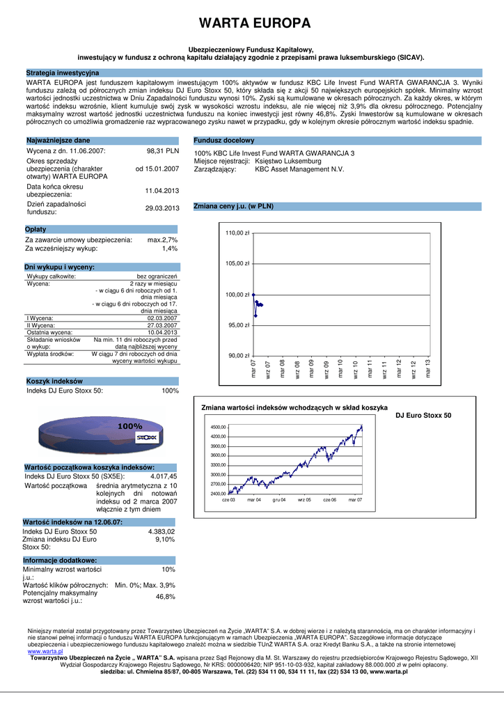 WARTA EUROPA Ubezpieczeniowy Fundusz Kapitałowy, inwestujący w fundusz z ochroną kapitału działający zgodnie z przepisami prawa luksemburskiego (SICAV). Strategia inwestycyjna WARTA EUROPA jest funduszem kapitałowym inwestującym 100% aktywów w fundusz KBC Life Invest Fund WARTA GWARANCJA 3. Wyniki funduszu zaleŜą od półrocznych zmian indeksu DJ Euro Stoxx 50, który składa się z akcji 50 największych europejskich spółek. Minimalny wzrost wartości jednostki uczestnictwa w Dniu Zapadalności funduszu wynosi 10%. Zyski są kumulowane w okresach półrocznych. Za kaŜdy okres, w którym wartość indeksu wzrośnie, klient kumuluje swój zysk w wysokości wzrostu indeksu, ale nie więcej niŜ 3,9% dla okresu półrocznego. Potencjalny maksymalny wzrost wartość jednostki uczestnictwa funduszu na koniec inwestycji jest równy 46,8%. Zyski Inwestorów są kumulowane w okresach półrocznych co umoŜliwia gromadzenie raz wypracowanego zysku nawet w przypadku, gdy w kolejnym okresie półrocznym wartość indeksu spadnie. Fundusz docelowy NajwaŜniejsze dane Wycena z dn. 11.06.2007: Okres sprzedaŜy ubezpieczenia (charakter otwarty) WARTA EUROPA 98,31 PLN od 15.01.2007 Data końca okresu ubezpieczenia: Dzień zapadalności funduszu: 11.04.2013 29.03.2013 Opłaty max.2,7% 1,4% 105,00 zł 95,00 zł mar 13 wrz 12 mar 12 wrz 11 mar 11 wrz 10 mar 10 wrz 09 mar 09 mar 08 90,00 zł wrz 08 Koszyk indeksów Indeks DJ Euro Stoxx 50: 100,00 zł wrz 07 bez ograniczeń 2 razy w miesiącu - w ciągu 6 dni roboczych od 1. dnia miesiąca - w ciągu 6 dni roboczych od 17. dnia miesiąca 02.03.2007 27.03.2007 10.04.2013 Na min. 11 dni roboczych przed datą najbliŜszej wyceny W ciągu 7 dni roboczych od dnia wyceny wartości wykupu mar 07 Dni wykupu i wyceny: I Wycena: II Wycena: Ostatnia wycena: Składanie wniosków o wykup: Wypłata środków: Zmiana ceny j.u. (w PLN) 110,00 zł Za zawarcie umowy ubezpieczenia: Za wcześniejszy wykup: Wykupy całkowite: Wycena: 100% KBC Life Invest Fund WARTA GWARANCJA 3 Miejsce rejestracji: Księstwo Luksemburg Zarządzający: KBC Asset Management N.V. 100% Zmiana wartości indeksów wchodzących w skład koszyka DJ Euro Stoxx 50 4500,00 4200,00 3900,00 3600,00 Wartość początkowa koszyka indeksów: Indeks DJ Euro Stoxx 50 (SX5E): 4.017,45 Wartość początkowa średnia arytmetyczna z 10 kolejnych dni notowań indeksu od 2 marca 2007 włącznie z tym dniem Wartość indeksów na 12.06.07: Indeks DJ Euro Stoxx 50 Zmiana indeksu DJ Euro Stoxx 50: Informacje dodatkowe: Minimalny wzrost wartości j.u.: Wartość klików półrocznych: Potencjalny maksymalny wzrost wartości j.u.: 3300,00 3000,00 2700,00 2400,00 cze 03 mar 04 gru 04 wrz 05 cze 06 mar 07 4.383,02 9,10% 10% Min. 0%; Max. 3,9% 46,8% Niniejszy materiał został przygotowany przez Towarzystwo Ubezpieczeń na śycie „WARTA” S.A. w dobrej wierze i z naleŜytą starannością, ma on charakter informacyjny i nie stanowi pełnej informacji o funduszu WARTA EUROPA funkcjonującym w ramach Ubezpieczenia „WARTA EUROPA”. Szczegółowe informacje dotyczące ubezpieczenia i ubezpieczeniowego funduszu kapitałowego znaleźć moŜna w siedzibie TUnś WARTA S.A. oraz Kredyt Banku S.A., a takŜe na stronie internetowej www.warta.pl Towarzystwo Ubezpieczeń na śycie „ WARTA” S.A. wpisana przez Sąd Rejonowy dla M. St. Warszawy do rejestru przedsiębiorców Krajowego Rejestru Sądowego, XII Wydział Gospodarczy Krajowego Rejestru Sądowego, Nr KRS: 0000006420; NIP 951-10-03-932, kapitał zakładowy 88.000.000 zł w pełni opłacony. siedziba: ul. Chmielna 85/87, 00-805 Warszawa, Tel. (22) 534 11 00, 534 11 11, fax (22) 534 13 00, www.warta.pl