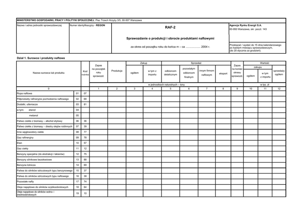 MINISTERSTWO GOSPODARKI, PRACY I POLITYKI SPOŁECZNEJ, Plac Trzech Krzyży 3/5, 00-507 Warszawa Nazwa i adres jednostki sprawozdawczej Numer identyfikacyjny - REGON Agencja Rynku Energii S.A. RAF-2 00-950 Warszawa, skr. poczt. 143 Sprawozdanie o produkcji i obrocie produktami naftowymi Przekazać / wysłać do 15 dnia kalendarzowego po każdym miesiącu sprawozdawczym, (do 20 stycznia za grudzień). za okres od początku roku do końca m – ca ................... 2004 r. Dział 1. Surowce i produkty naftowe Kod Nazwa surowca lub produktu nośnika Zakup Zapas na początek roku sprawozd. Produkcja 1 2 ogółem Sprzedaż w tym z importu odbiorcom detalicznym pozostałym odbiorcom finalnym innym firmom naftowym eksport Wartość Zapas na koniec okresu sprawozd. ogółem 9 10 zakupu w jednostkach naturalnych – tony 0 Ropa naftowa 01 07 Półprodukty rafineryjne pochodzenia naftowego 02 68 Dodatki, utleniacze 03 81 w tym: etanol 04 metanol 05 Paliwo ciekłe z biomasy – alkohol etylowy 06 36 Paliwo ciekłe z biomasy – diestry olejów roślinnych 07 39 Inne węglowodory ciekłe 08 77 Gaz rafineryjny 09 78 Etan 10 57 Gaz ciekły 11 12 Benzyny specjalne (do ekstrakcji i lakierów) 12 75 Benzyny silnikowe bezołowiowe 13 88 Benzyna lotnicza 14 69 Paliwa do silników odrzutowych typu benzynowego 15 37 Paliwa do silników odrzutowych typu naftowego 16 38 Pozostałe nafty 17 74 Oleje napędowe do silników szybkoobrotowych 18 64 Oleje napędowe do silników wolno- i średnioobrotowych 19 10 3 4 5 w tym z importu sprzedaży ogółem w tys. zł 6 7 8 11 12 Dział 1. Surowce i produkty naftowe (cd.) Kod Nazwa surowca lub produktu nośnika Zakup Zapas na początek roku sprawozd. Produkcja 1 2 ogółem Sprzedaż w tym z importu odbiorcom detalicznym pozostałym odbiorcom finalnym innym firmom naftowym eksport Zapas na koniec okresu sprawozdawczego Wartość zakupu ogółem w jednostkach naturalnych – tony 0 Oleje opałowe lekkie 20 96 Oleje opałowe ciężkie niskosiarkowe (< 1% ) 21 98 Oleje opałowe ciężkie wysokosiarkowe ( > 1% ) 22 99 Pozostałości olejów ropy naftowej (Gudron) 23 59 Benzyny do pirolizy 24 76 Oleje silnikowe 25 71 Oleje i preparaty smarowe 26 82 Asfalty z przeróbki ropy naftowej 27 73 Wazelina, parafina, woski pochodzenia naftowego 28 72 Koks naftowy 29 58 Pozostałe produkty naftowe 30 77 Benzole surowe 31 52 Siarka 32 55 Oleje przepracowane 33 22 Gaz ziemny wysokometanowy (tys. m3 ) 34 13 3 4 5 7 8 9 10 36 Uwaga: w wolnych wierszach wpisać inne występujące produkty. (imię, nazwisko i telefon osoby która sporządziła sprawozdanie) ............................................................. (miejscowość, data) sprzedaży ogółem w tys. zł. 6 35 .............................................................. w tym z importu .................................................................... (pieczątka imienna i podpis osoby działającej w imieniu sprawozdawcy) 11 12 Dział 2. Import produktów naftowych Kraj pochodzenia Ropa naftowa kod 07 Gaz ciekły kod 12 Benzyny silnikowe bezołowiowe kod 88 Benzyna lotnicza kod 69 0 1 2 3 4 Paliwa odrzutowe benzynowe kod 37 naftowe kod 38 Olej napędowy kod 64 Lekki olej opałowy kod 96 7 8 Ciężki olej opałowy o zawartości <1% siarki kod 98 >1% siarki kod 99 9 10 w jednostkach naturalnych - tony 01 02 03 04 05 06 07 08 09 10 11 12 13 14 15 16 17 18 19 20 21 5 6 Dział 3. Eksport produktów naftowych Kraj docelowy Ropa naftowa kod 07 Gaz ciekły kod 12 Benzyny silnikowe bezołowiowe kod 88 Benzyna lotnicza kod 69 1 2 3 4 Paliwa odrzutowe benzynowe kod 37 naftowe kod 38 Olej napędowy kod 64 Lekki olej opałowy kod 96 7 8 Ciężki olej opałowy o zawartości <1% siarki kod 98 >1% siarki kod 99 9 10 w jednostkach naturalnych - tony 0 5 6 01 02 03 04 05 06 07 08 09 10 11 12 13 14 15 16 17 18 19 20 21 22 .............................................................. (imię, nazwisko i telefon osoby która sporządziła sprawozdanie) ............................................................. (miejscowość, data) .................................................................... (pieczątka imienna i podpis osoby działającej w imieniu sprawozdawcy) Dział 4. Import ropy naftowej *) Typ ropy naftowej Kraj pochodzenia Gęstość wg API Zawartość siarki (zakres gęstości wg API) tony baryłki tys. zł tys. USD - % 1 2 3 4 5 6 7 x x 01 Ural (31-32.5) 02 Pozostała ropa rosyjska Azerbejdżan 03 Kazachstan 04 Ukraina 05 Pozostałe kraje byłego ZSRR 06 Dania 07 (33-34.5) Norwegia 08 Statfjord (37.5-38) 09 Gullfaks (29.3-29.8) 10 Oseberg (34) 11 Ekofisk (43.4) EUROPA Kraje byłego ZSRR 0 Rosja Wielka Brytania Wartość importu ***) 12 Pozostała ropa norweska 13 Brent Blend (37-38) 14 Forties (39-40) 15 Flotta (34.7) 16 Pozostała ropa brytyjska Wielkość importu Pozostałe kraje 17 18 19 20 21 OGÓŁEM **) 22 x *) Dział 4 wypełniają tylko importerzy ropy naftowej. **) Wielkość i wartość importu w pozycji OGÓŁEM muszą być zgodne z wielkością i wartością importu ropy naftowej wykazanymi w Dziale 1. ***) Wartość importu należy podać w cenach CIF (cena z kosztami ubezpieczenia i transportu) .............................................................. (imię, nazwisko i telefon osoby która sporządziła sprawozdanie) ............................................................. (miejscowość, data) .................................................................... (pieczątka imienna i podpis osoby działającej w imieniu sprawozdawcy)