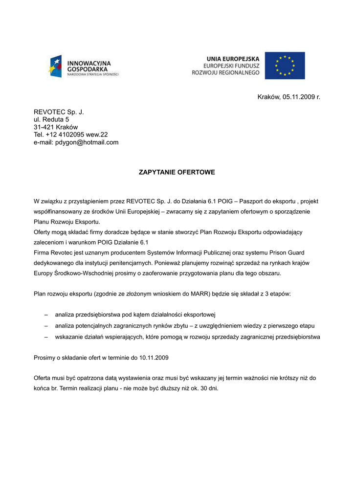 Kraków, 05.11.2009 r. REVOTEC Sp. J. ul. Reduta 5 31-421 Kraków Tel. +12 4102095 wew.22 e-mail: [email protected] ZAPYTANIE OFERTOWE W związku z przystąpieniem przez REVOTEC Sp. J. do Działania 6.1 POIG – Paszport do eksportu , projekt współfinansowany ze środków Unii Europejskiej – zwracamy się z zapytaniem ofertowym o sporządzenie Planu Rozwoju Eksportu. Oferty mogą składać firmy doradcze będące w stanie stworzyć Plan Rozwoju Eksportu odpowiadający zaleceniom i warunkom POIG Działanie 6.1 Firma Revotec jest uznanym producentem Systemów Informacji Publicznej oraz systemu Prison Guard dedykowanego dla instytucji penitencjarnych. Ponieważ planujemy rozwinąć sprzedaż na rynkach krajów Europy Środkowo-Wschodniej prosimy o zaoferowanie przygotowania planu dla tego obszaru. Plan rozwoju eksportu (zgodnie ze złożonym wnioskiem do MARR) będzie się składał z 3 etapów: – analiza przedsiębiorstwa pod kątem działalności eksportowej – analiza potencjalnych zagranicznych rynków zbytu – z uwzględnieniem wiedzy z pierwszego etapu – wskazanie działań wspierających, które pomogą w rozwoju sprzedaży zagranicznej przedsiębiorstwa Prosimy o składanie ofert w terminie do 10.11.2009 Oferta musi być opatrzona datą wystawienia oraz musi być wskazany jej termin ważności nie krótszy niż do końca br. Termin realizacji planu - nie może być dłuższy niż ok. 30 dni.