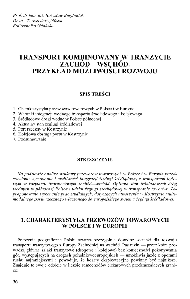 Prof. dr hab. inż. Bożysław Bogdaniuk Dr inż. Teresa Jarzębińska Politechnika Gdańska TRANSPORT KOMBINOWANY W TRANZYCIE ZACHÓD—WSCHÓD. PRZYKŁAD MOŻLIWOŚCI ROZWOJU SPIS TREŚCI 1. 2. 3. 4. 5. 6. 7. Charakterystyka przewozów towarowych w Polsce i w Europie Warunki integracji wodnego transportu śródlądowego i kolejowego Śródlądowe drogi wodne w Polsce północnej Aktualny stan żeglugi śródlądowej Port rzeczny w Kostrzynie Kolejowa obsługa portu w Kostrzynie Podsumowanie STRESZCZENIE Na podstawie analizy struktury przewozów towarowych w Polsce i w Europie przedstawiono wymagania i możliwości integracji żeglugi śródlądowej z transportem lądowym w korytarzu transportowym zachód—wschód. Opisano stan śródlądowych dróg wodnych w północnej Polsce i udział żeglugi śródlądowej w transporcie towarów. Zaproponowano wykonanie prac studialnych, dotyczących utworzenia w Kostrzynie multimodalnego portu rzecznego włączonego do europejskiego systemu żeglugi śródlądowej. 1. CHARAKTERYSTYKA PRZEWOZÓW TOWAROWYCH W POLSCE I W EUROPIE Położenie geograficzne Polski stwarza szczególnie dogodne warunki dla rozwoju transportu tranzytowego z Europy Zachodniej na wschód. Pas nizin — przez które prowadzą główne szlaki tranzytowe (drogowe i kolejowe) bez konieczności pokonywania gór, występujących na drogach południowoeuropejskich — umożliwia jazdę z oporami ruchu najmniejszymi i powoduje, że koszty eksploatacyjne powinny być najniższe. Znajduje to swoje odbicie w liczbie samochodów ciężarowych przekraczających granice: 36 — zachodnią — 4,264 mln sztuk rocznie, tj. średnio około 11700 szt./dobę, — wschodnią — 2,354 mln sztuk rocznie, tj. średnio około 6500 szt./dobę. W tym samym czasie (2005 r.) transportem kolejowym przewieziono łącznie w całym kraju jedynie około 26 tys. sztuk kontenerów TEU 1. Niestety w Roczniku statystycznym nie podano, jaka część z tej liczby kontenerów była odprawiana w tranzycie zachód— —wschód. Jednak już samo zestawienie tych liczb świadczy, że kolejowy transport kontenerów, które stanowią podstawową formę ładunkową w przewozach międzynarodowych, nie ma praktycznie znaczenia w ruchu tranzytowym przez Polskę. Równocześnie należy podkreślić, że obecnie na żadnym odcinku szlaków wodnych na kierunku wschód—zachód nie istnieje wodny transport śródlądowy, który mógłby uczestniczyć w towarowym ruchu tranzytowym. Znikomy udział transportu kolejowego w przewozach towarowych występuje nie tylko w Polsce. Przy dynamicznym rozwoju gospodarczym Europy w ostatnim trzydziestoleciu przewozy drogowe i morskie w 15 krajach UE wzrosły prawie trzykrotnie, podczas gdy przewozy kolejowe i śródlądowy transport wodny utrzymywały się na mniej więcej jednakowym poziomie (tabl. 1). Takie zachwianie równowagi pomiędzy różnymi środkami transportu nie pozostaje bez wpływu na rozwój gospodarczy i społeczny. Wykonywane pod koniec lat dziewięćdziesiątych badania wszystkich kosztów związanych z transportem — w tym także kosztów zewnętrznych, które są pokrywane nie przez przewoźnika, ale przez budżety państw — wykazały, że ich wartość przekracza 8% produktu krajowego brutto, sięgając w 15 krajach unijnych w 1995 r. kwoty ponad 530 mld € .2 Tablica 1 Wielkości pracy przewozowej w 15 krajach UE [mld tkm] Rok Drogi Kolej Rurociągi Wodny śródlądowy Wodny morski 1970 1980 1990 2000 2002 489 720 976 1319 1376 282 290 255 250 236 64 85 70 85 85 103 106 107 128 125 472 781 923 1270 1255 Ź r ó d ł o: Eurostat. Transport drogowy generuje około 90% tych kosztów, kolejowy — około 2%, natomiast śródlądowy transport wodny występuje w kosztach śladowo. To może oznaczać, że za kilka lat blisko 10% PKB trzeba będzie w poszczególnych krajach przeznaczyć na pokrywanie pośrednich kosztów preferowanego transportu drogowego. Transport drogowy w ostatnim trzydziestoleciu rozwijał się głównie w wyniku wysokiego subsydiowania go przez budżety państw: poprzez budowę i utrzymanie dróg z budżetów centralnych i regionalnych oraz ukrywanie pokrywanych kosztów pośrednich. Zachwianie równowagi pomiędzy różnymi gałęziami transportu jest pod względem ekonomicznym szczególnie niekorzystne, ponieważ transport drogowy jest w rzeczywistości co najmniej dwukrotnie droższy od transportu kolejowego. Za jego pozorną taniość płacą wszyscy podatnicy. Równocześnie też w wielu krajach, szczególnie w dużych aglomeracjach, osiągnięto kres możliwości przestrzennych dla dalszej rozbudowy Rocznik statystyczny: Transport — wyniki działalności w 2005 r. GUS, Warszawa 2006. Biała księga. Europejska polityka transportowa do 2010 r. Commission of the European Communities, COM(2001) 370. 1 2 37 sieci dróg i autostrad, natomiast w krajach rozwijających się brakuje środków finansowych i potencjału gospodarczego na budowę sieci drogowej. W tej sytuacji coraz istotniejszą rolę w transporcie towarów powinny odgrywać odpowiednio zorganizowane takie gałęzie transportu, jak kolej i żegluga śródlądowa, które są społecznie najbardziej pożądane z powodu ich walorów ekologicznych i minimalnego udziału w generowaniu kosztów zewnętrznych. W gospodarce rynkowej nie jest jednak możliwe zadekretowanie przez władze rozwoju danego środka transportu. Potrzebne są przede wszystkim takie działania prorynkowe, które spowodowałyby uatrakcyjnienie oferty przewozowej i wspieranie tych działań (głównie w zakresie inwestycyjnym) pomocą finansową, poprzez wykorzystanie unijnych funduszy strukturalnych. W chwili obecnej celem polityki transportowej powinno więc być całościowe rozwiązywanie zagadnień przemieszczania osób i towarów w obrębie europejskiego rynku wewnętrznego, poprzez preferowanie rozwoju systemu transportowego w sposób jak najmniej obciążający środowisko naturalne i po niskich kosztach ogólno