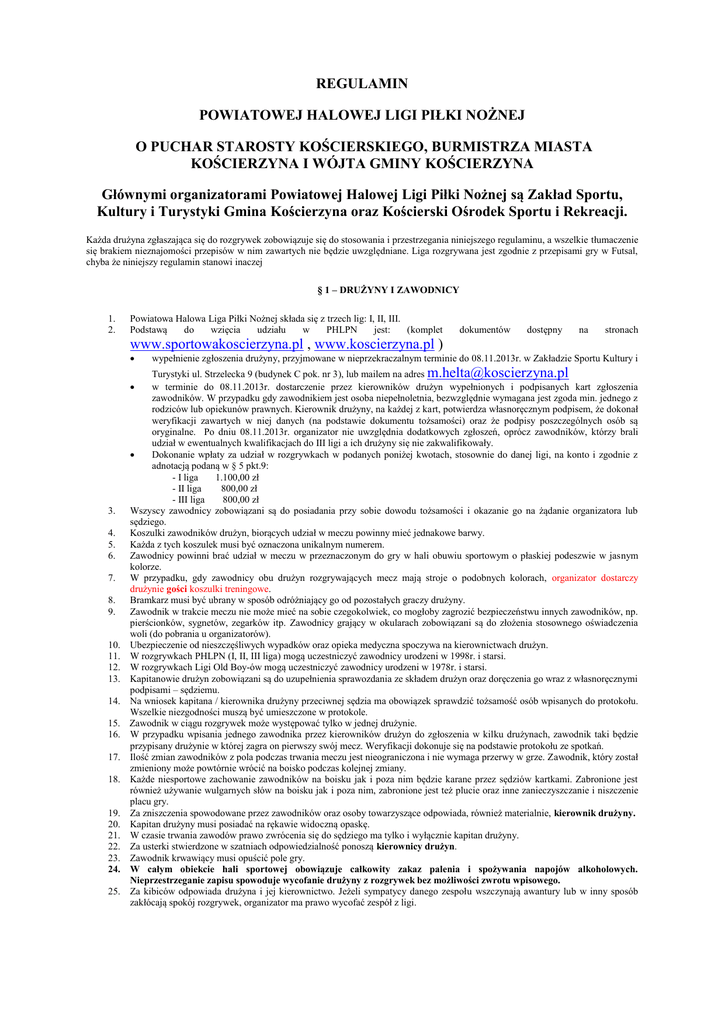 REGULAMIN POWIATOWEJ HALOWEJ LIGI PIŁKI NOŻNEJ O PUCHAR STAROSTY KOŚCIERSKIEGO, BURMISTRZA MIASTA KOŚCIERZYNA I WÓJTA GMINY KOŚCIERZYNA Głównymi organizatorami Powiatowej Halowej Ligi Piłki Nożnej są Zakład Sportu, Kultury i Turystyki Gmina Kościerzyna oraz Kościerski Ośrodek Sportu i Rekreacji. Każda drużyna zgłaszająca się do rozgrywek zobowiązuje się do stosowania i przestrzegania niniejszego regulaminu, a wszelkie tłumaczenie się brakiem nieznajomości przepisów w nim zawartych nie będzie uwzględniane. Liga rozgrywana jest zgodnie z przepisami gry w Futsal, chyba że niniejszy regulamin stanowi inaczej § 1 – DRUŻYNY I ZAWODNICY 1. 2. Powiatowa Halowa Liga Piłki Nożnej składa się z trzech lig: I, II, III. Podstawą do wzięcia udziału w PHLPN jest: (komplet dokumentów dostępny na stronach www.sportowakoscierzyna.pl , www.koscierzyna.pl ) Turystyki ul. Strzelecka 9 (budynek C pok. nr 3), lub mailem na adres [email protected] w terminie do 08.11.2013r. dostarczenie przez kierowników drużyn wypełnionych i podpisanych kart zgłoszenia zawodników. W przypadku gdy zawodnikiem jest osoba niepełnoletnia, bezwzględnie wymagana jest zgoda min. jednego z rodziców lub opiekunów prawnych. Kierownik drużyny, na każdej z kart, potwierdza własnoręcznym podpisem, że dokonał weryfikacji zawartych w niej danych (na podstawie dokumentu tożsamości) oraz że podpisy poszczególnych osób są oryginalne. Po dniu 08.11.2013r. organizator nie uwzględnia dodatkowych zgłoszeń, oprócz zawodników, którzy brali udział w ewentualnych kwalifikacjach do III ligi a ich drużyny się nie zakwalifikowały. Dokonanie wpłaty za udział w rozgrywkach w podanych poniżej kwotach, stosownie do danej ligi, na konto i zgodnie z adnotacją podaną w § 5 pkt.9: - I liga 1.100,00 zł - II liga 800,00 zł - III liga 800,00 zł Wszyscy zawodnicy zobowiązani są do posiadania przy sobie dowodu tożsamości i okazanie go na żądanie organizatora lub sędziego. Koszulki zawodników drużyn, biorących udział w meczu powinny mieć jednakowe barwy. Każda z tych koszulek musi być oznaczona unikalnym numerem. Zawodnicy powinni brać udział w meczu w przeznaczonym do gry w hali obuwiu sportowym o płaskiej podeszwie w jasnym kolorze. W przypadku, gdy zawodnicy obu drużyn rozgrywających mecz mają stroje o podobnych kolorach, organizator dostarczy drużynie gości koszulki treningowe. Bramkarz musi być ubrany w sposób odróżniający go od pozostałych graczy drużyny. Zawodnik w trakcie meczu nie może mieć na sobie czegokolwiek, co mogłoby zagrozić bezpieczeństwu innych zawodników, np. pierścionków, sygnetów, zegarków itp. Zawodnicy grający w okularach zobowiązani są do złożenia stosownego oświadczenia woli (do pobrania u organizatorów). Ubezpieczenie od nieszczęśliwych wypadków oraz opieka medyczna spoczywa na kierownictwach drużyn. W rozgrywkach PHLPN (I, II, III liga) mogą uczestniczyć zawodnicy urodzeni w 1998r. i starsi. W rozgrywkach Ligi Old Boy-ów mogą uczestniczyć zawodnicy urodzeni w 1978r. i starsi. Kapitanowie drużyn zobowiązani są do uzupełnienia sprawozdania ze składem drużyn oraz doręczenia go wraz z własnoręcznymi podpisami – sędziemu. Na wniosek kapitana / kierownika drużyny przeciwnej sędzia ma obowiązek sprawdzić tożsamość osób wpisanych do protokołu. Wszelkie niezgodności muszą być umieszczone w protokole. Zawodnik w ciągu rozgrywek może występować tylko w jednej drużynie. W przypadku wpisania jednego zawodnika przez kierowników drużyn do zgłoszenia w kilku drużynach, zawodnik taki będzie przypisany drużynie w której zagra on pierwszy swój mecz. Weryfikacji dokonuje się na podstawie protokołu ze spotkań. Ilość zmian zawodników z pola podczas trwania meczu jest nieograniczona i nie wymaga przerwy w grze. Zawodnik, który został zmieniony może powtórnie wrócić na boisko podczas kolejnej zmiany. Każde niesportowe zachowanie zawodników na boisku jak i poza nim będzie karane przez sędziów kartkami. Zabronione jest również używanie wulgarnych słów na boisku jak i poza nim, zabronione jest też plucie oraz inne zanieczyszczanie i niszczenie placu gry. Za zniszczenia spowodowane przez zawodników oraz osoby towarzyszące odpowiada, również materialnie, kierownik drużyny. Kapitan drużyny musi posiadać na rękawie widoczną opaskę. W czasie trwania zawodów prawo zwrócenia się do sędziego ma tylko i wyłącznie kapitan drużyny. Za usterki stwierdzone w szatniach odpowiedzialność ponoszą kierownicy drużyn. Zawodnik krwawiący musi opuścić pole gry. W całym obiekcie hali sportowej obowiązuje całkowity zakaz palenia i spożywania napojów alkoholowych. Nieprzestrzeganie zapisu spowoduje wycofanie drużyny z rozgrywek bez możliwości zwrotu wpisowego. Za kibiców odpowiada drużyna i jej kierownictwo. Jeżeli sympatycy danego zespołu wszczynają awantury lub w inny sposób zakłócają spokój rozgrywek, organizator ma prawo wycofać zespół z ligi. 3. 4. 5. 6. 7. 8. 9. 10. 11. 12. 13. 14. 15. 16. 17. 18. 19. 20. 21. 22. 23. 24. 25. wypełnienie zgłoszenia drużyny, przyjmowane w nieprzekraczalnym terminie do 08.11.2013r. w Zakładzie Sportu Kultury i § 2 – KARY 1. 2. 3. 4. 5. 6. W przypadku wybitnie nie sportowych zachowań zawodników i kibiców danej drużyny (np.: uderzenie przeciwnika, czynne znieważenie sędziego) drużyna zostaje automatycznie ukarana karą finansową w wysokości 300 zł. Płatne w ciągu pięciu dni od decyzji organizatorów. W przypadku powtórzenia się zdarzenia drużyna zostaje wykluczona z rozgrywek, a w przypadku zniszczeń odpowiedzialny kierownik ponosi pełne koszty napraw. Za wystawienie do gry zawodnika nieuprawnionego, zawieszonego, odbywającego karę dyskwalifikacji lub pod obcym nazwiskiem zostaje przyznana kara: 1. drużynie walkower 0-5, oraz kara pieniężna 100 zł. Płatne w ciągu pięciu dni od zaistniałe